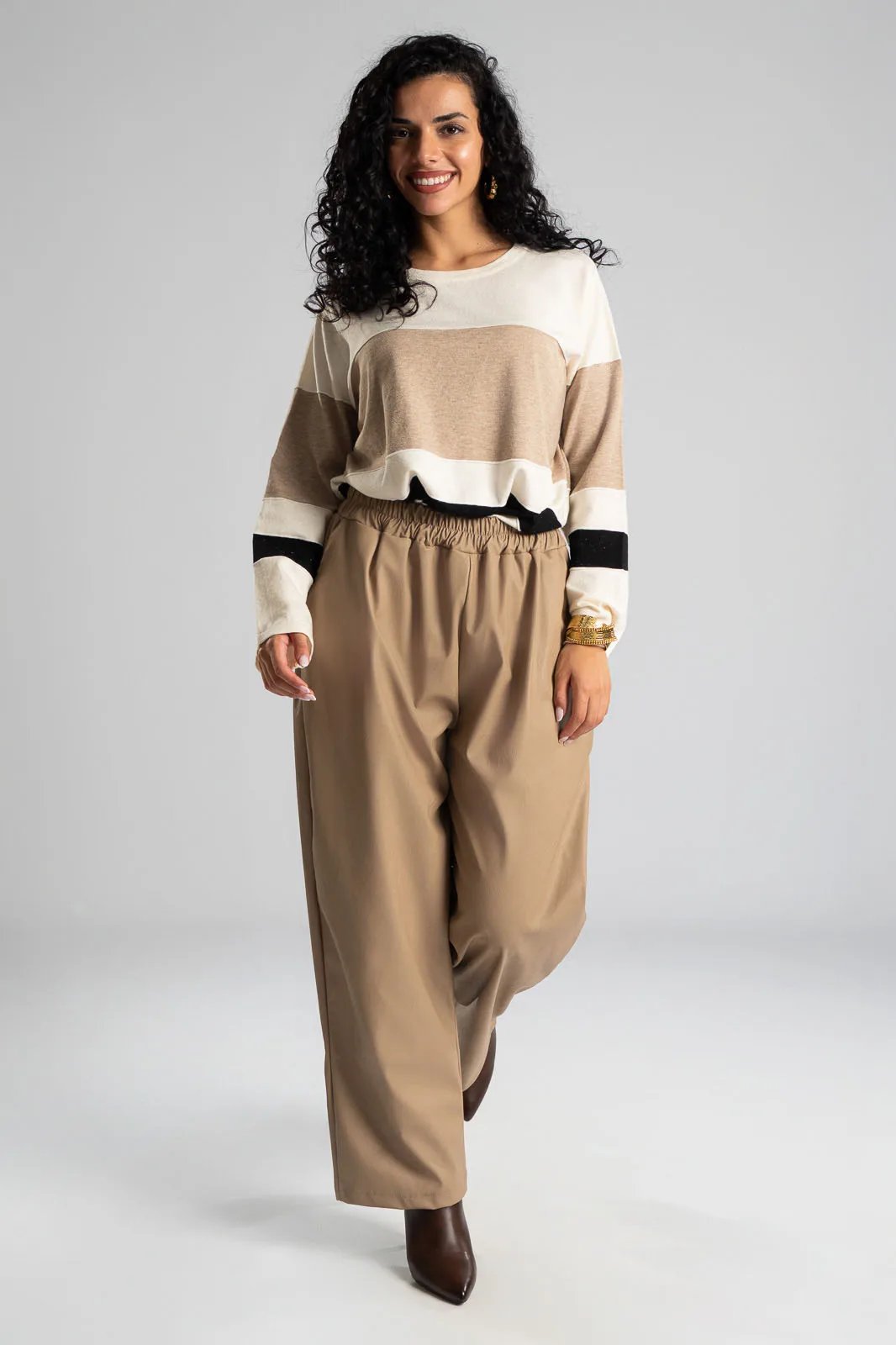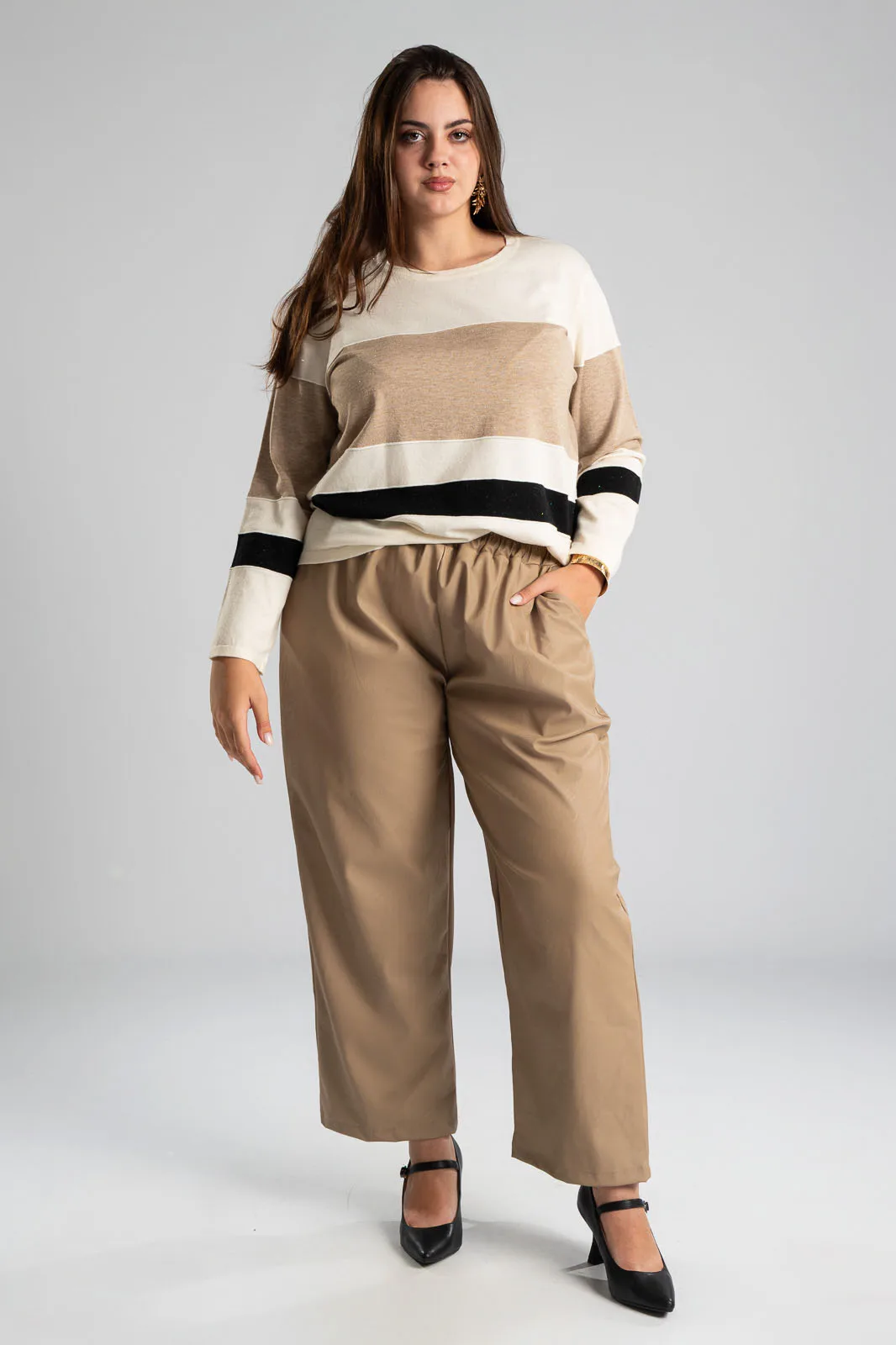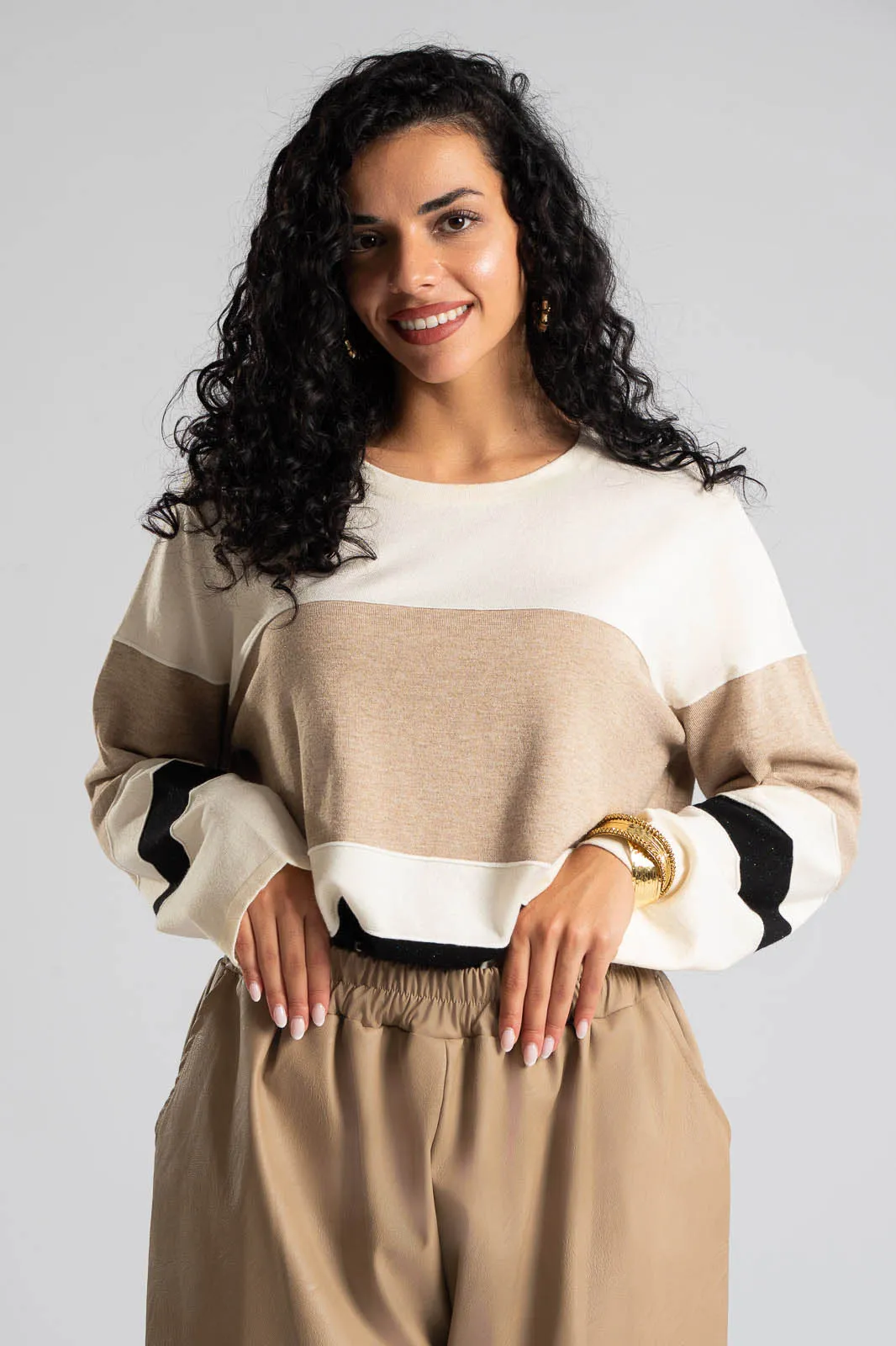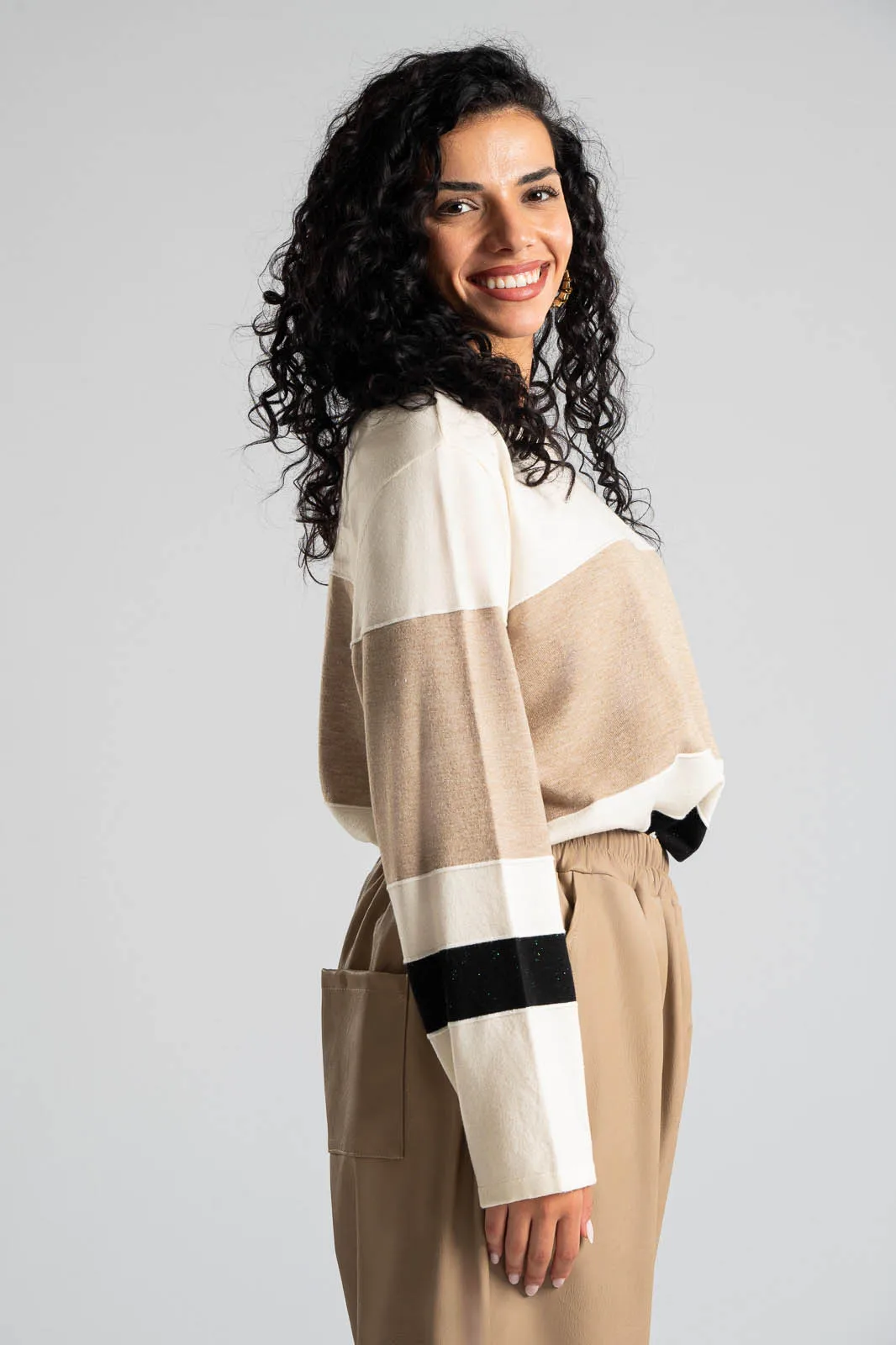 Blouse with compact knit fabric and round neckline. It has long sleeves. It has thin and thick stripes and gold thread throughout. The measurements in the table are representative for each code. 30% polyamide, 30% viscose, 20% modal, 20% elastane.