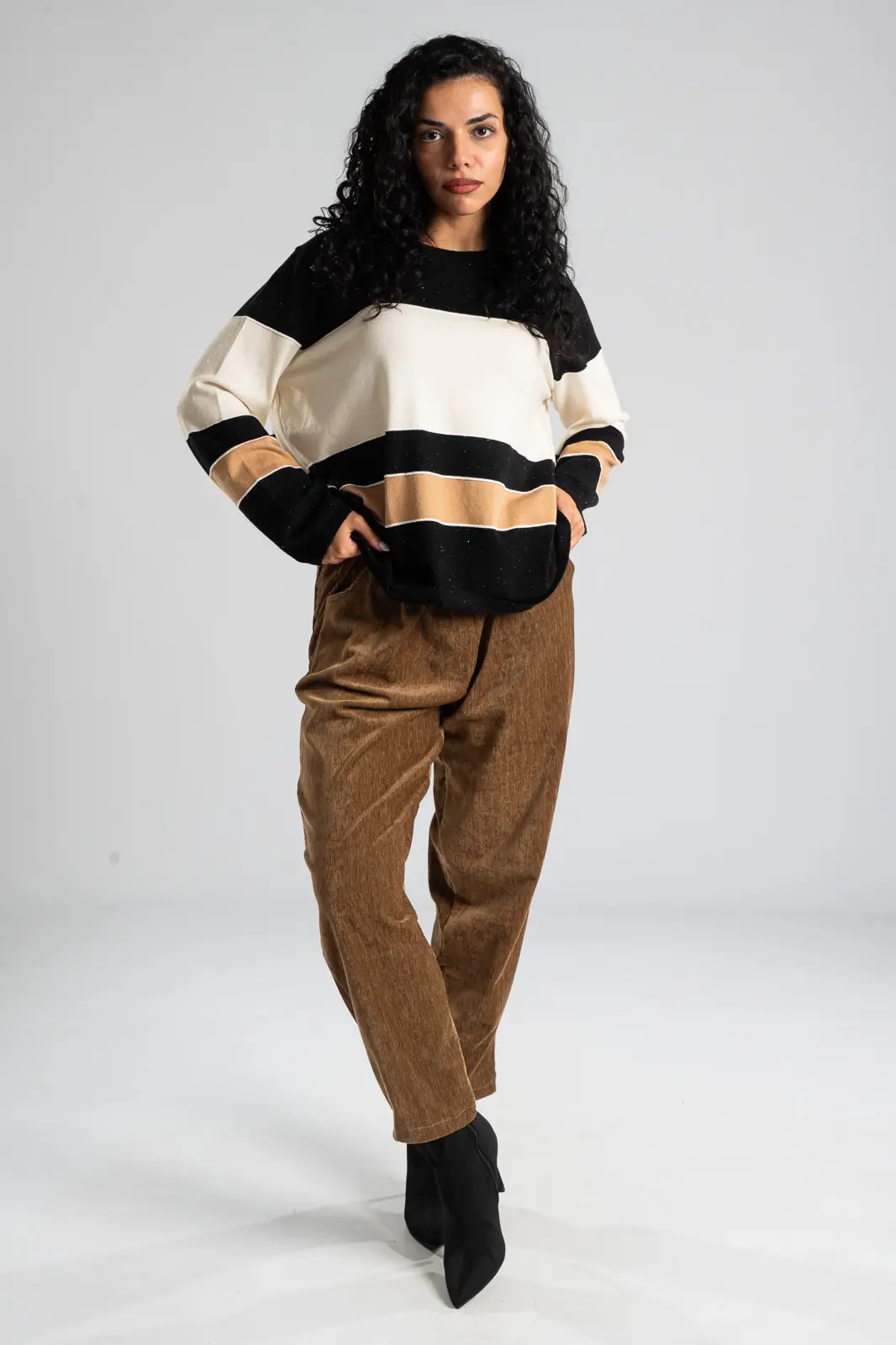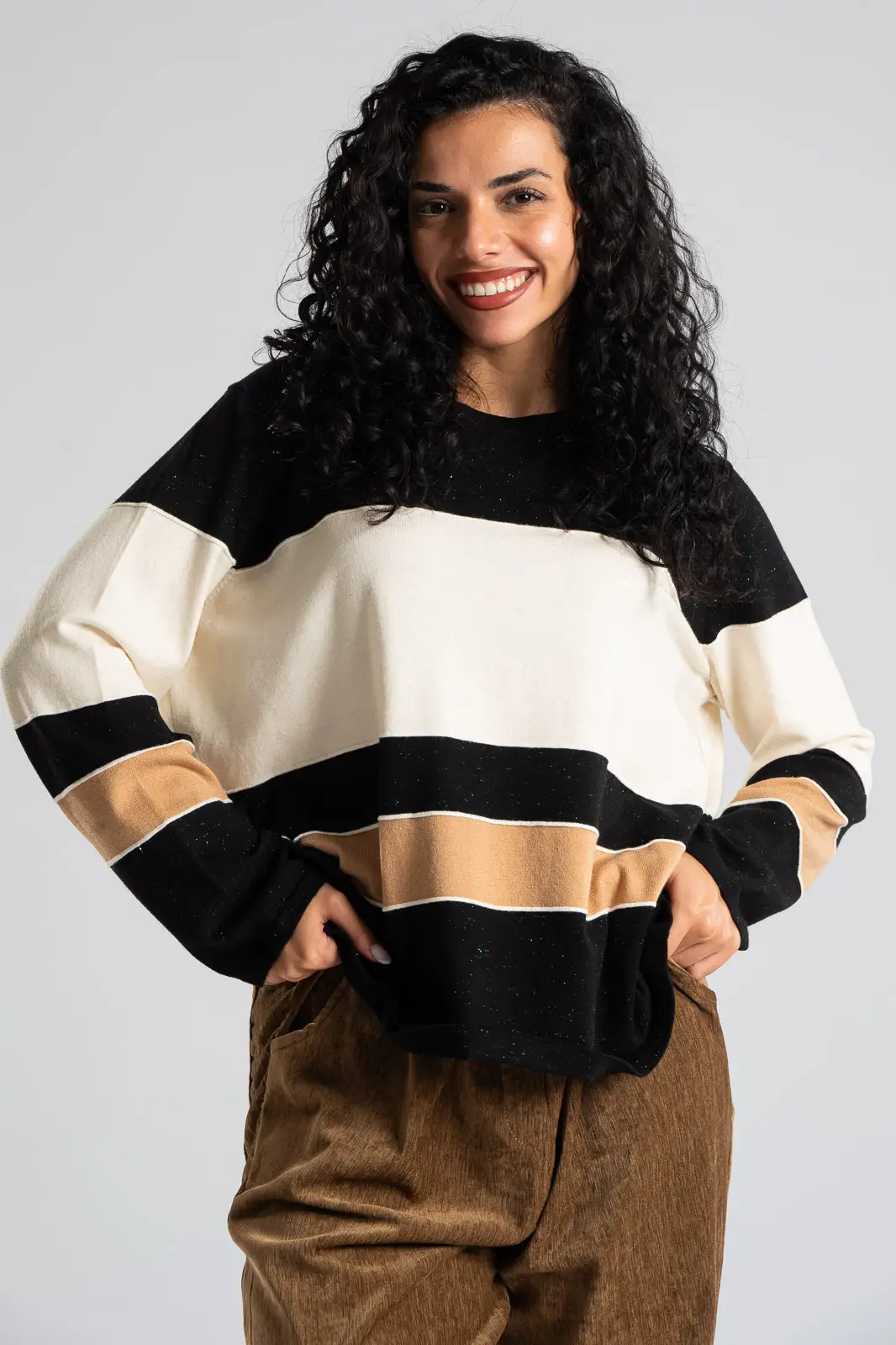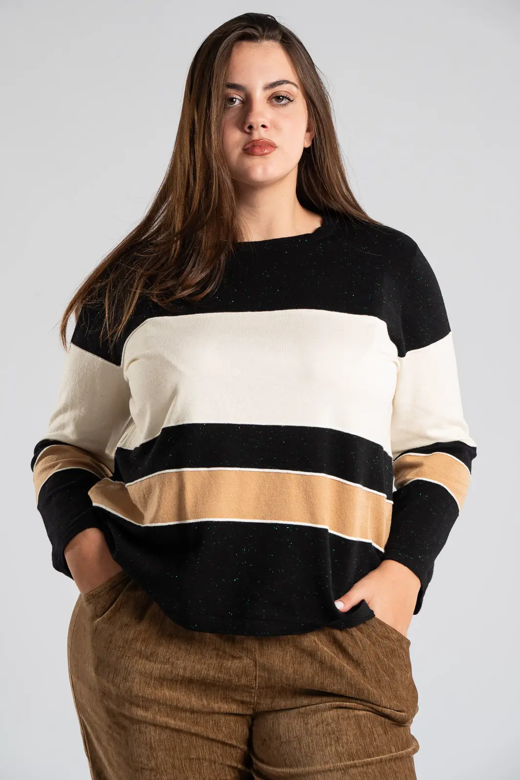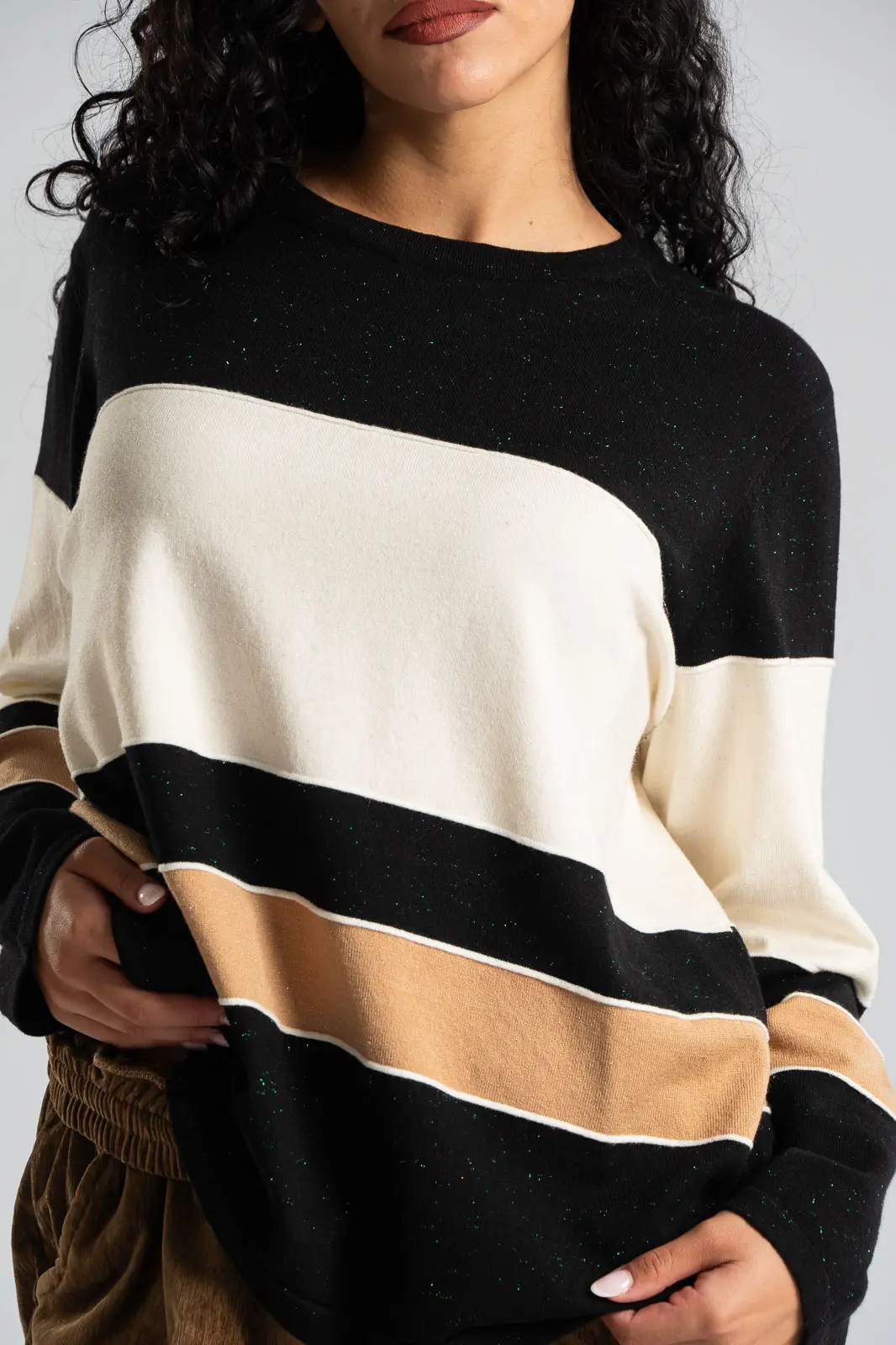 Blouse with compact knit fabric and round neckline. It has long sleeves. It has thin and thick stripes and gold thread throughout. The measurements in the table are representative for each code. 30% polyamide, 30% viscose, 20% modal, 20% elastane.