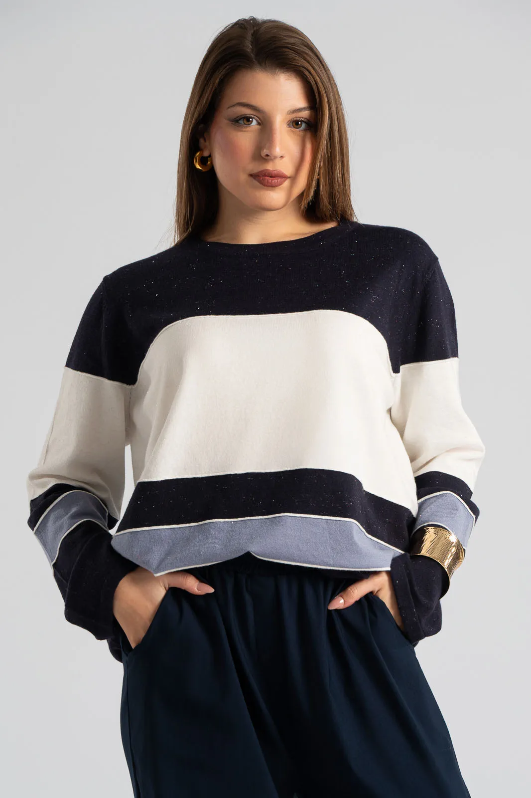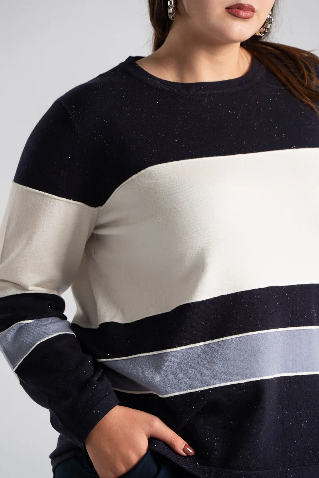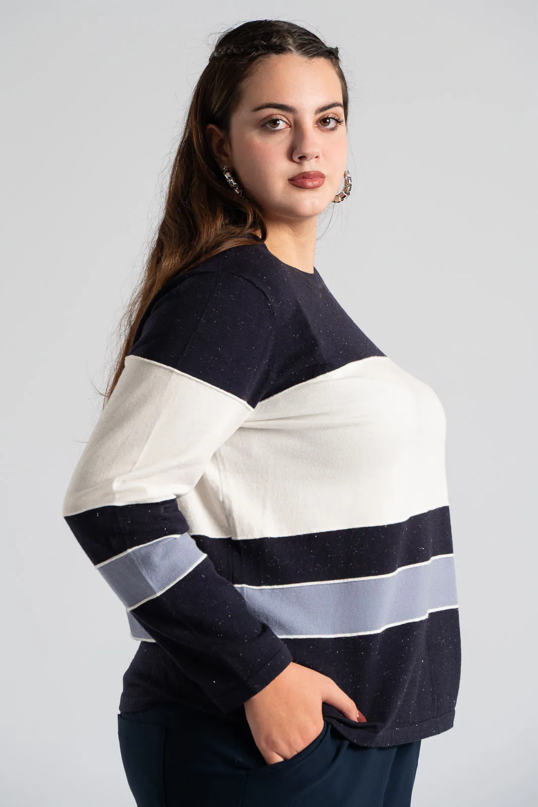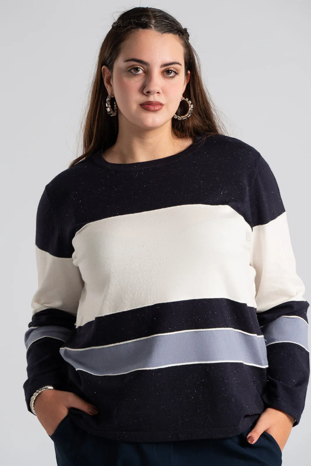 Μπλούζα με νημάτινη συμπαγή πλέξη, με στρογγυλή λαιμόκοψη. Διαθέτει μακριά μανίκια. Σε όλη την επιφάνεια της έχει λεπτές και παχές ρίγες και χρυσοκλωστή. Οι μετρήσεις του πίνακα είναι αντιπροσωπευτικές για κάθε κωδικό. 30% polyamide, 30% viscose, 20% modal, 20% elastan.