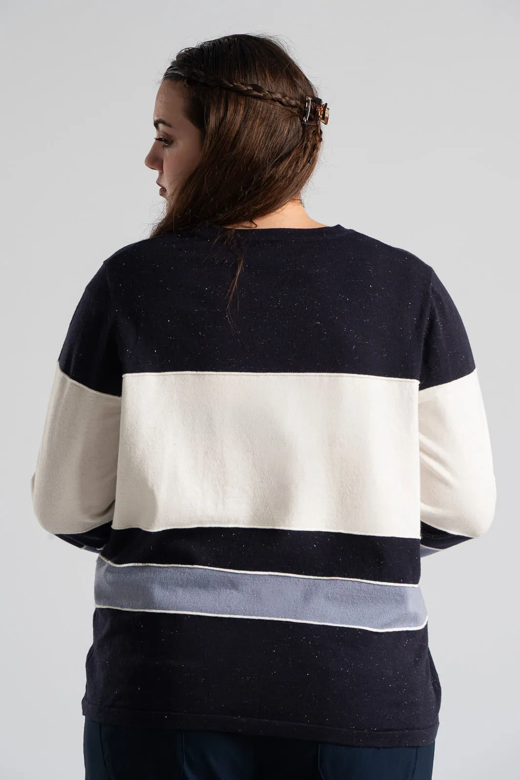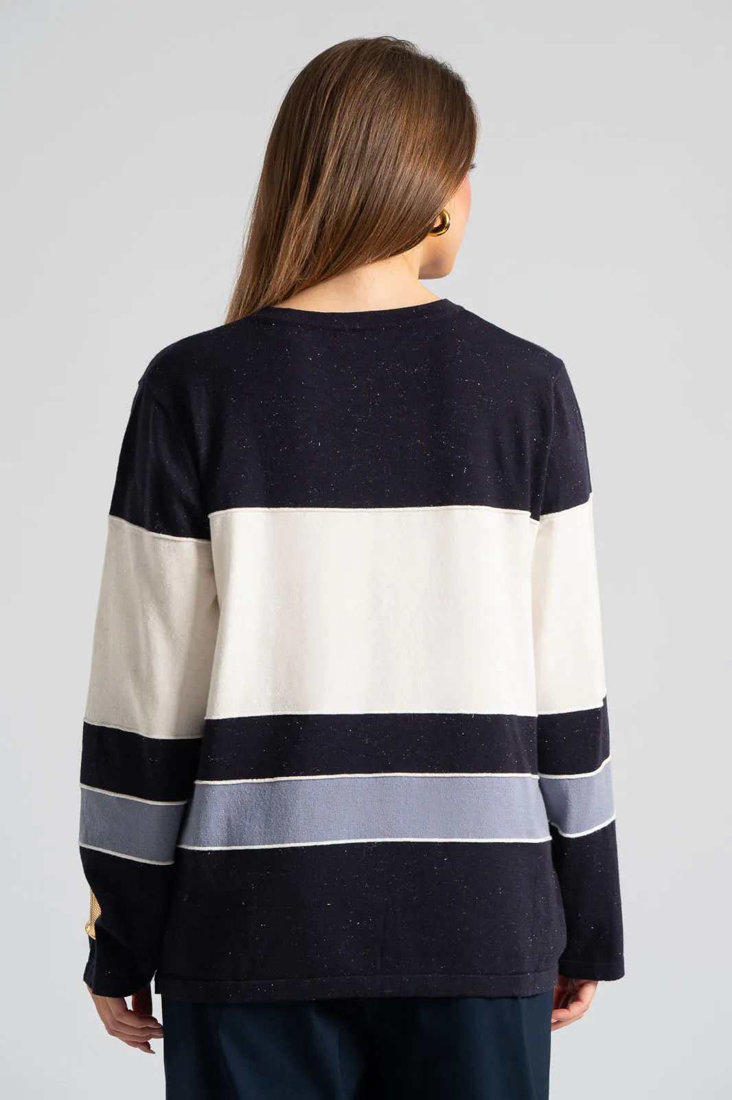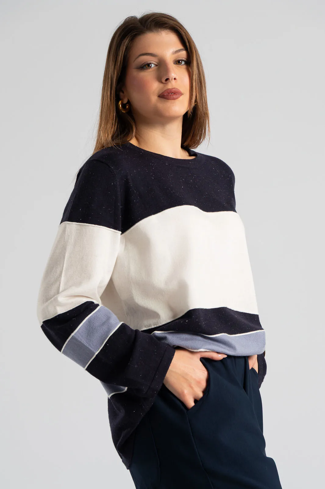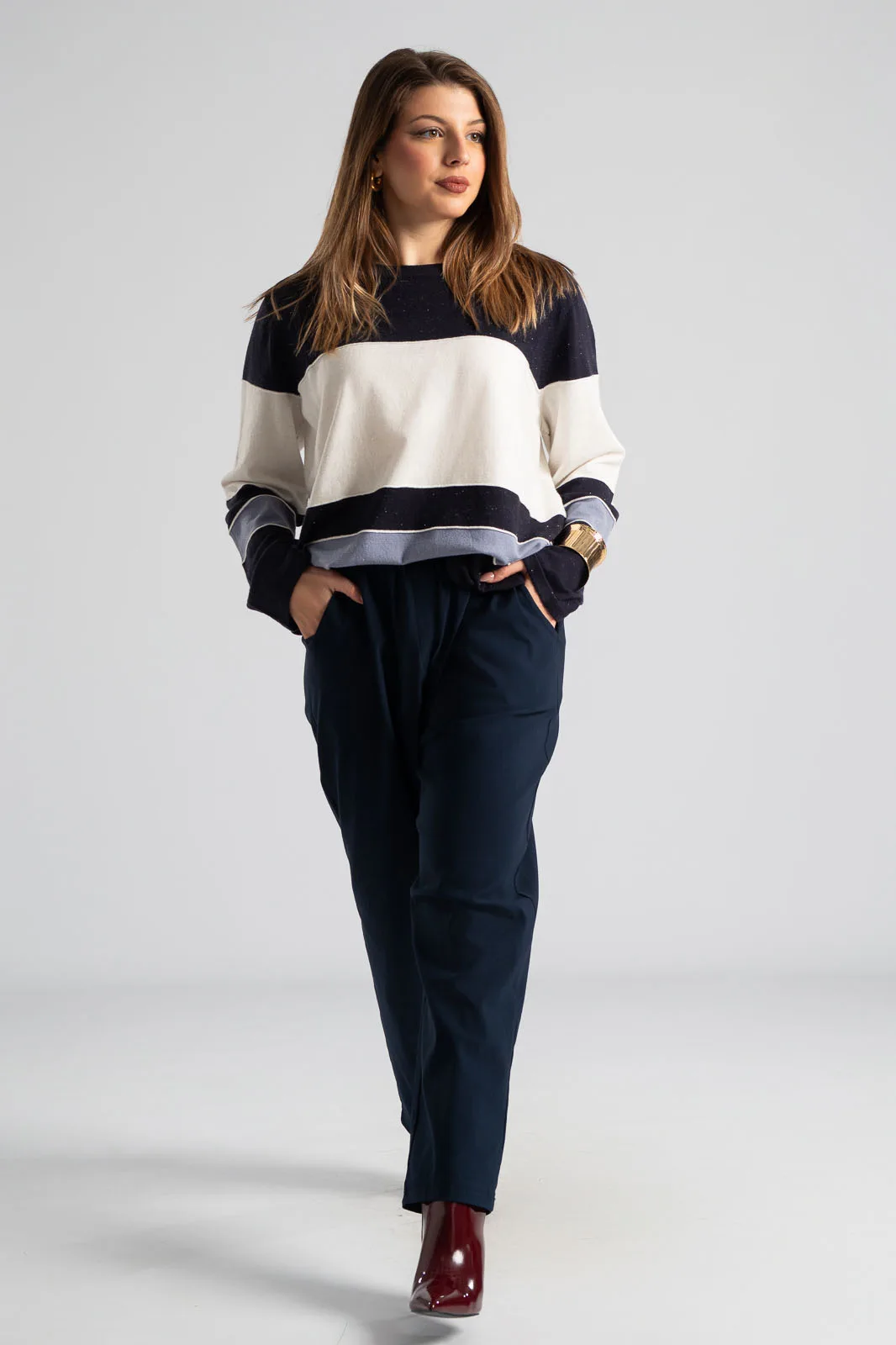 Μπλούζα με νημάτινη συμπαγή πλέξη, με στρογγυλή λαιμόκοψη. Διαθέτει μακριά μανίκια. Σε όλη την επιφάνεια της έχει λεπτές και παχές ρίγες και χρυσοκλωστή. Οι μετρήσεις του πίνακα είναι αντιπροσωπευτικές για κάθε κωδικό. 30% polyamide, 30% viscose, 20% modal, 20% elastan.