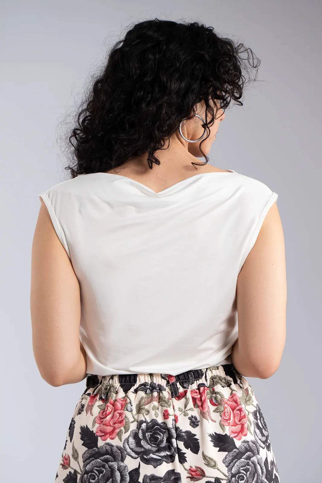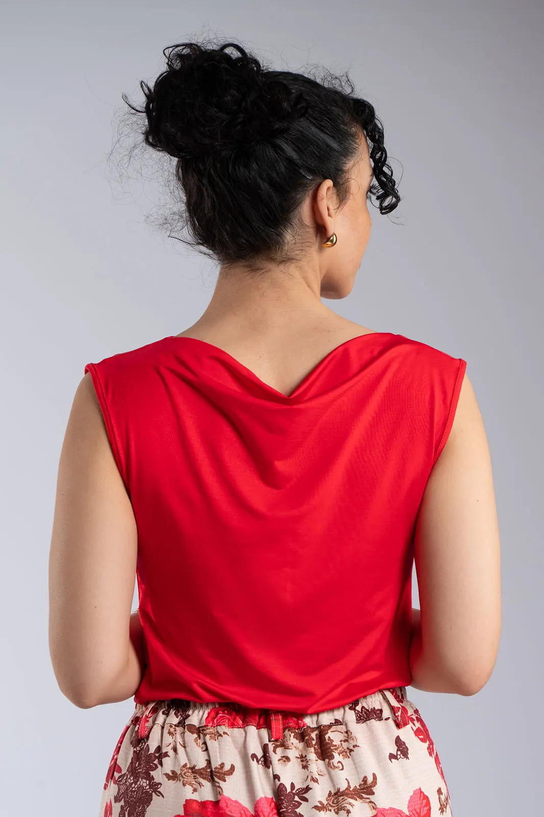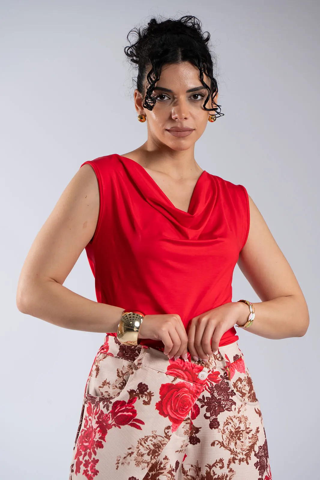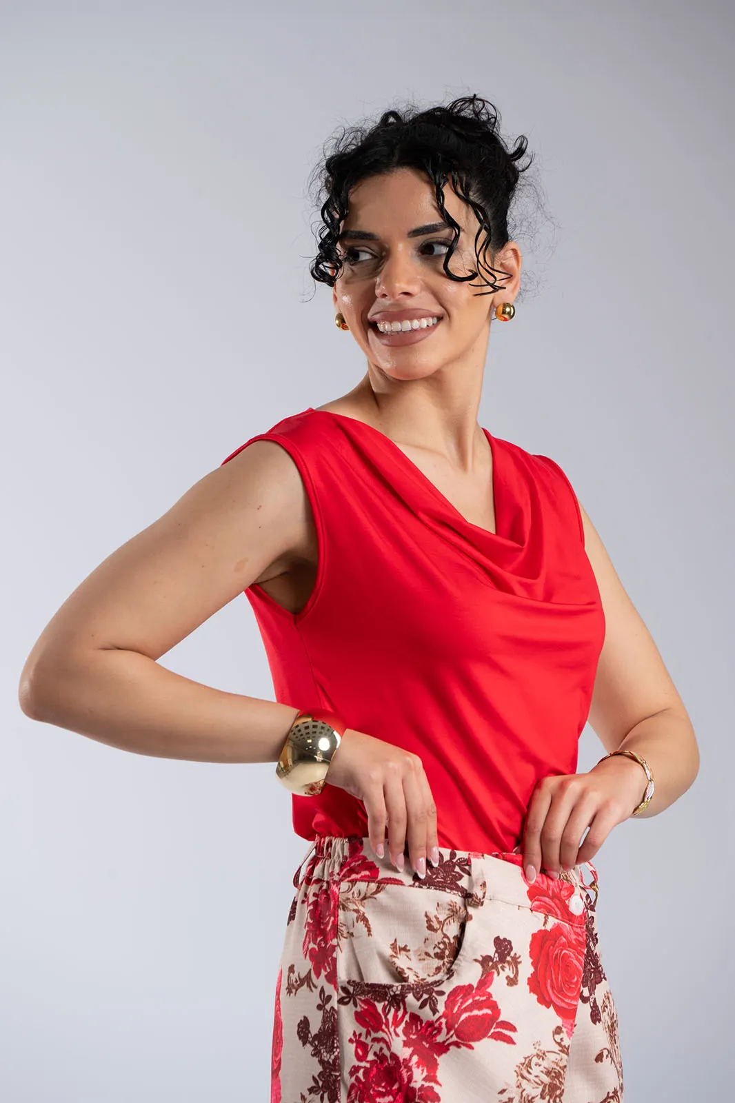 Μπλούζα σε minimal γραμμή με εντυπωσιακή ντραπέ λαιμόκοψη που χαρίζει κομψότητα και θηλυκότητα. Διαθέτει αμάνικο σχέδιο με ελαφρώς φαρδιά γραμμή που πέφτει χαλαρά στο σώμα, προσφέροντας άνεση και αέρινη αίσθηση. Το ύφασμα είναι απαλό, ελαστικό και δροσερό, ιδανικό για όλες τις ώρες της ημέρας. Ένα διαχρονικό κομμάτι που μπορεί να φορεθεί εύκολα τόσο σε καθημερινές όσο και σε πιο chic εμφανίσεις.