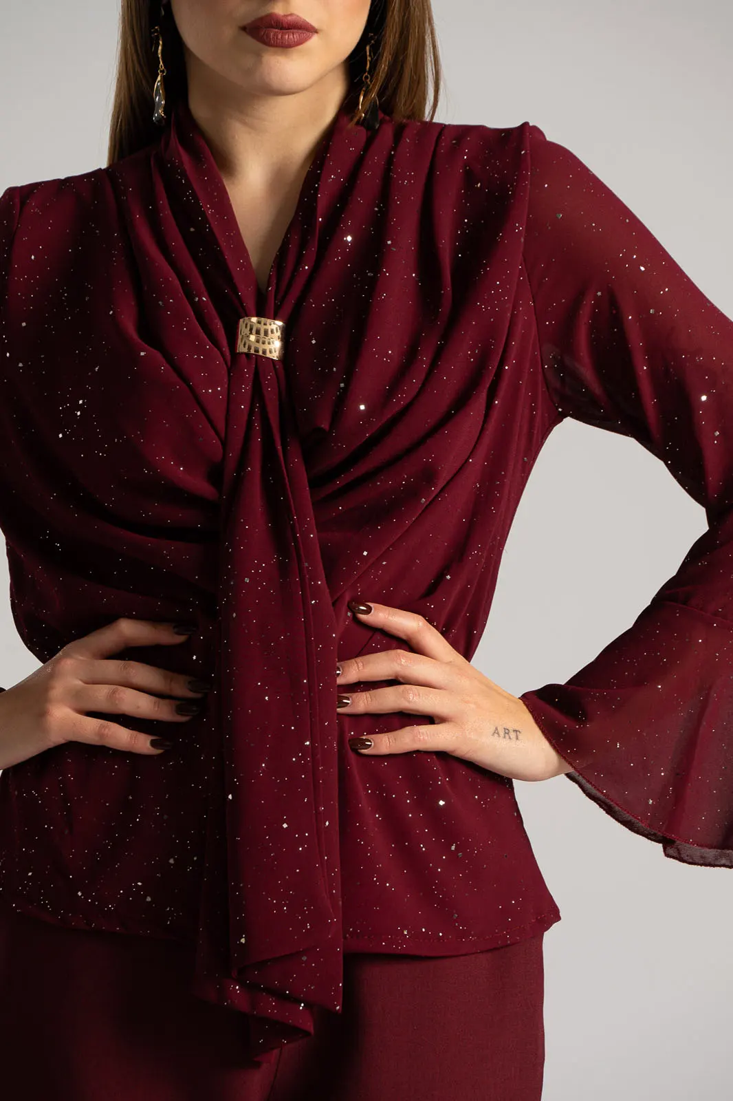 BLOUSE DRAPED NECKLINE METALLIC DETAIL DARK RED