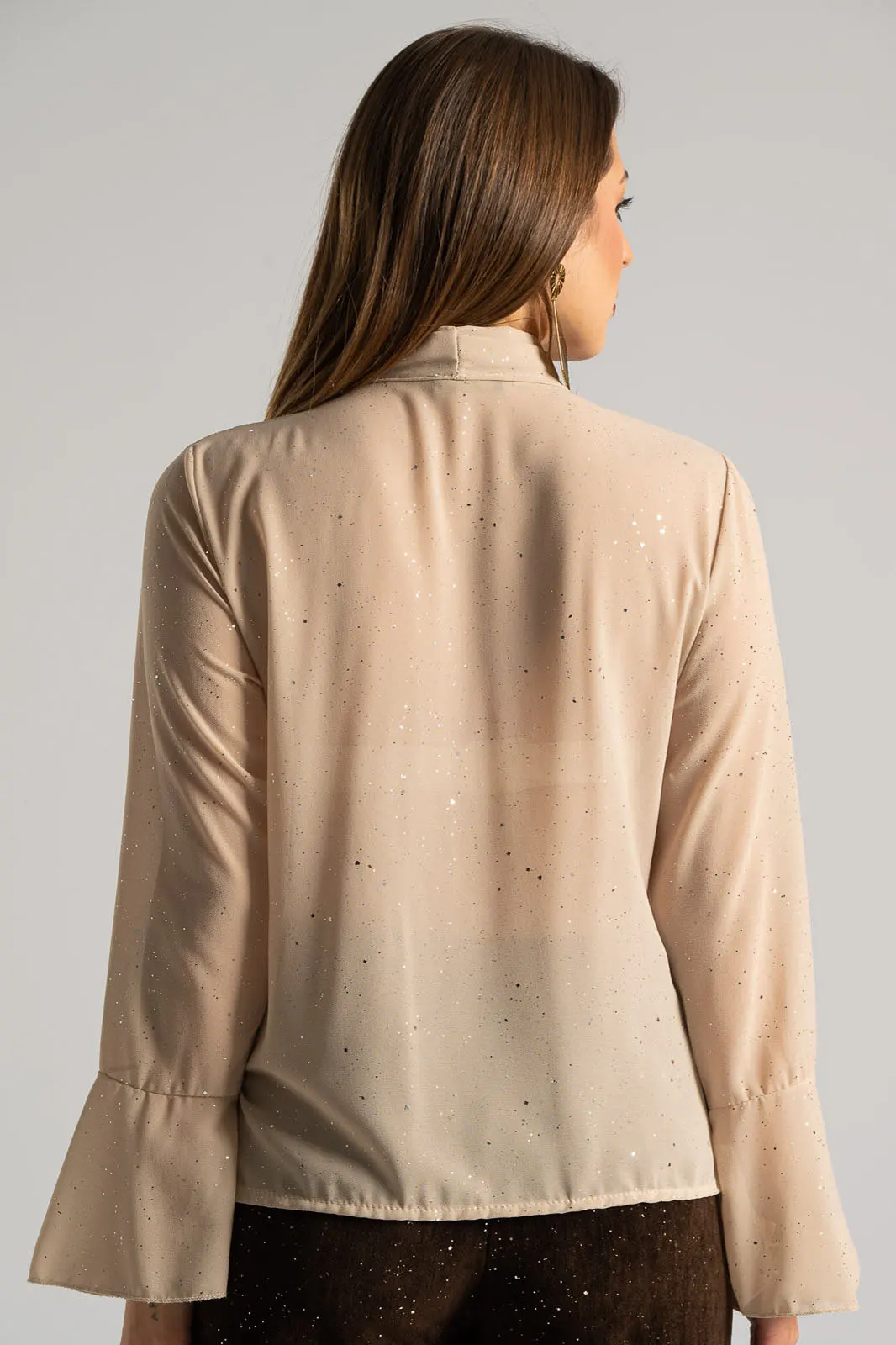 Blouse with draped neckline. It has a built-in scarf at the neckline, decorated with a metal element. It has long sleeves that end in a cape style. The entire surface is tulle and has decorative shimmer. It is lined on the inside. The measurements in the table are representative for each code. 100% polyester. Lining: 95% viscose, 5% elastane.