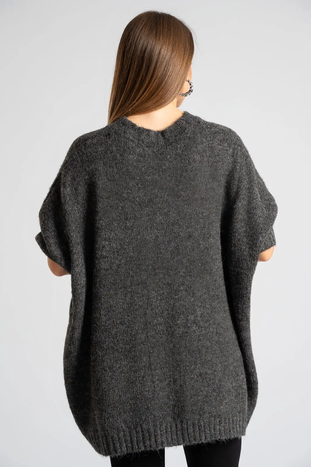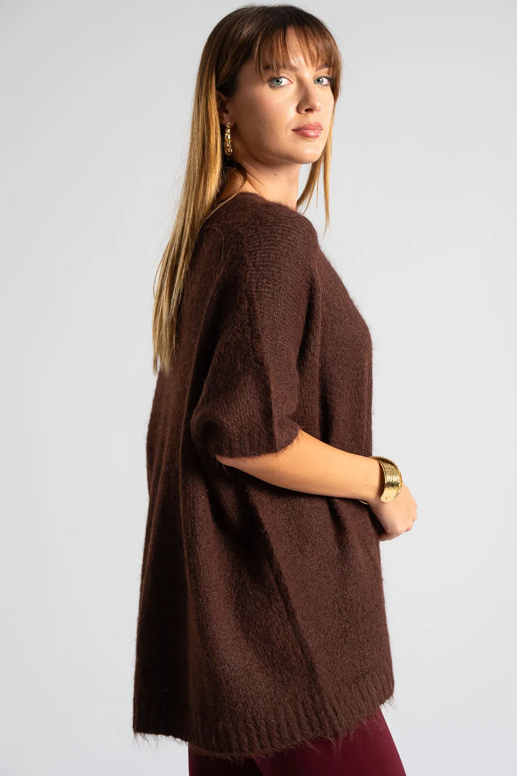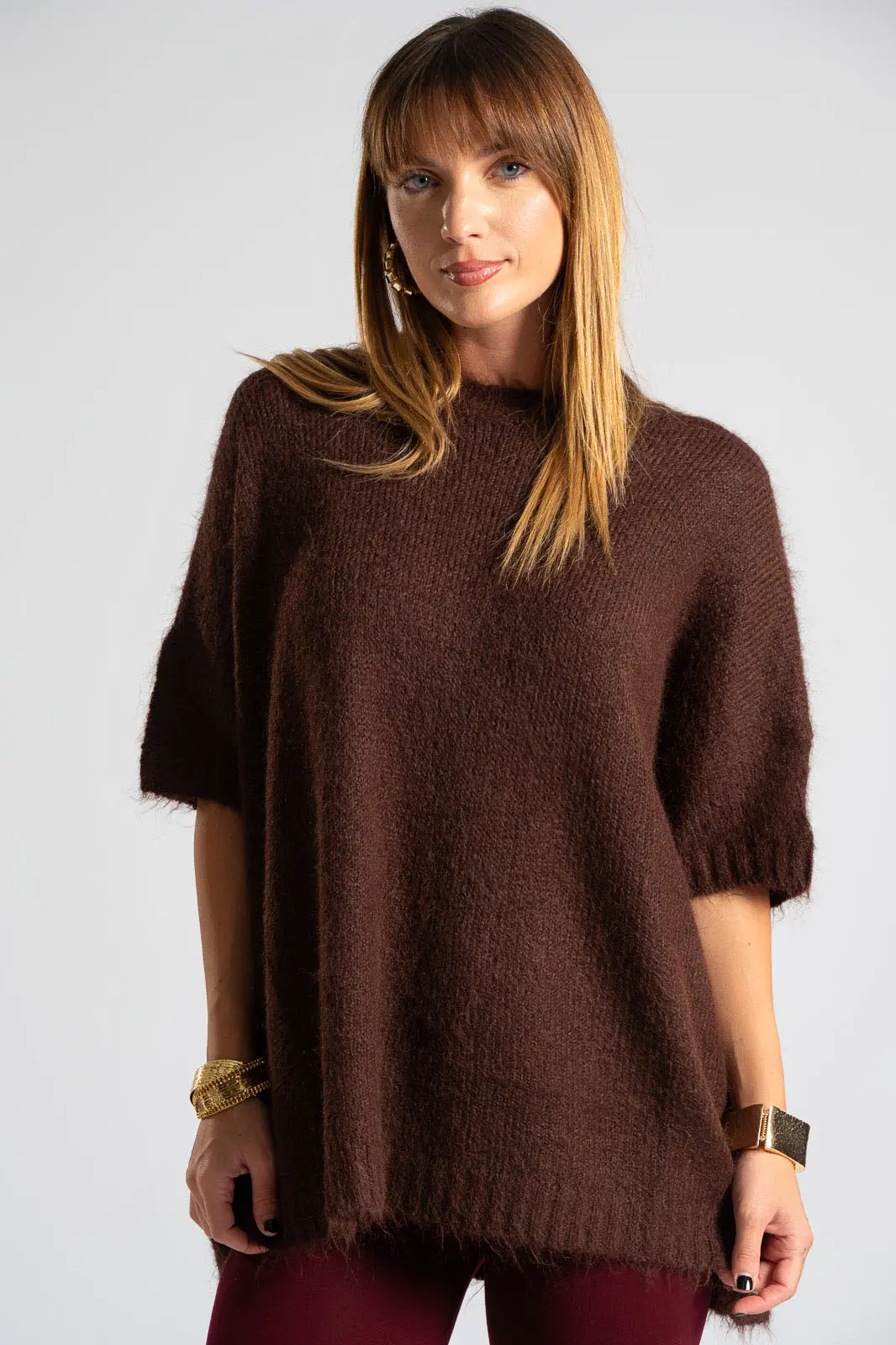 Blouse with compact yarn knit. It has a round neckline and short sleeves. It has a straight cut. The hem, neckline, and sleeves are ribbed. The measurements in the table are representative of each product. 33% recycled polyester, 28% acrylic, 24% polyester, 14% nylon, 3% spandex.