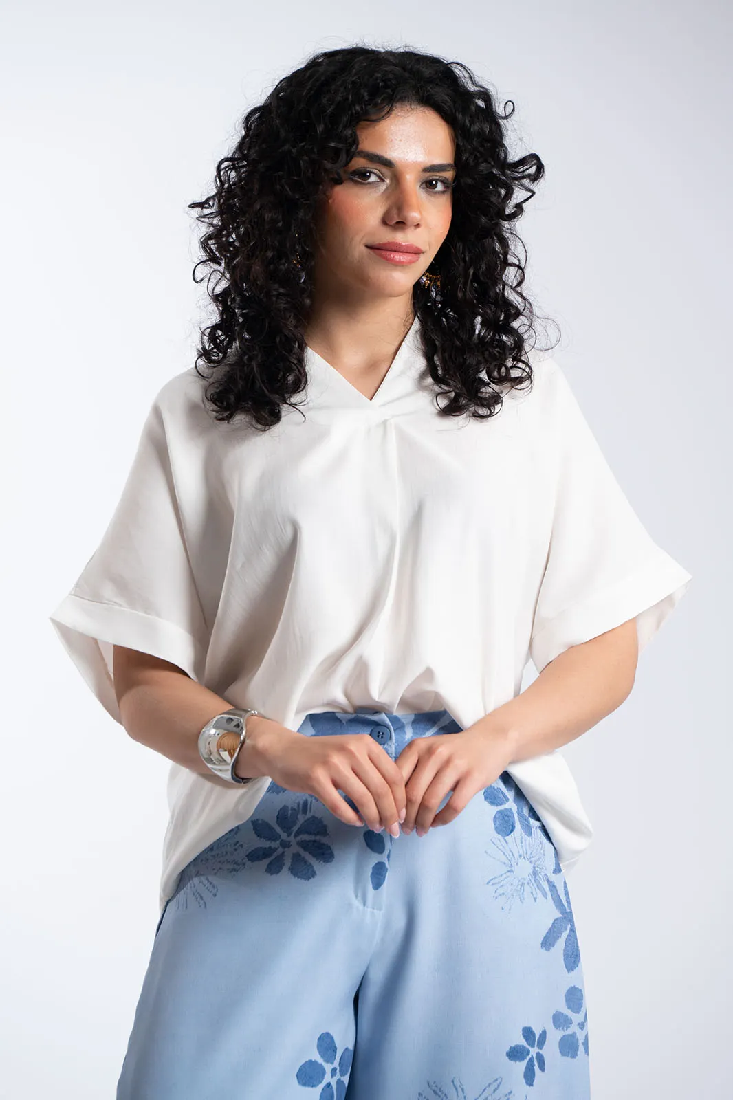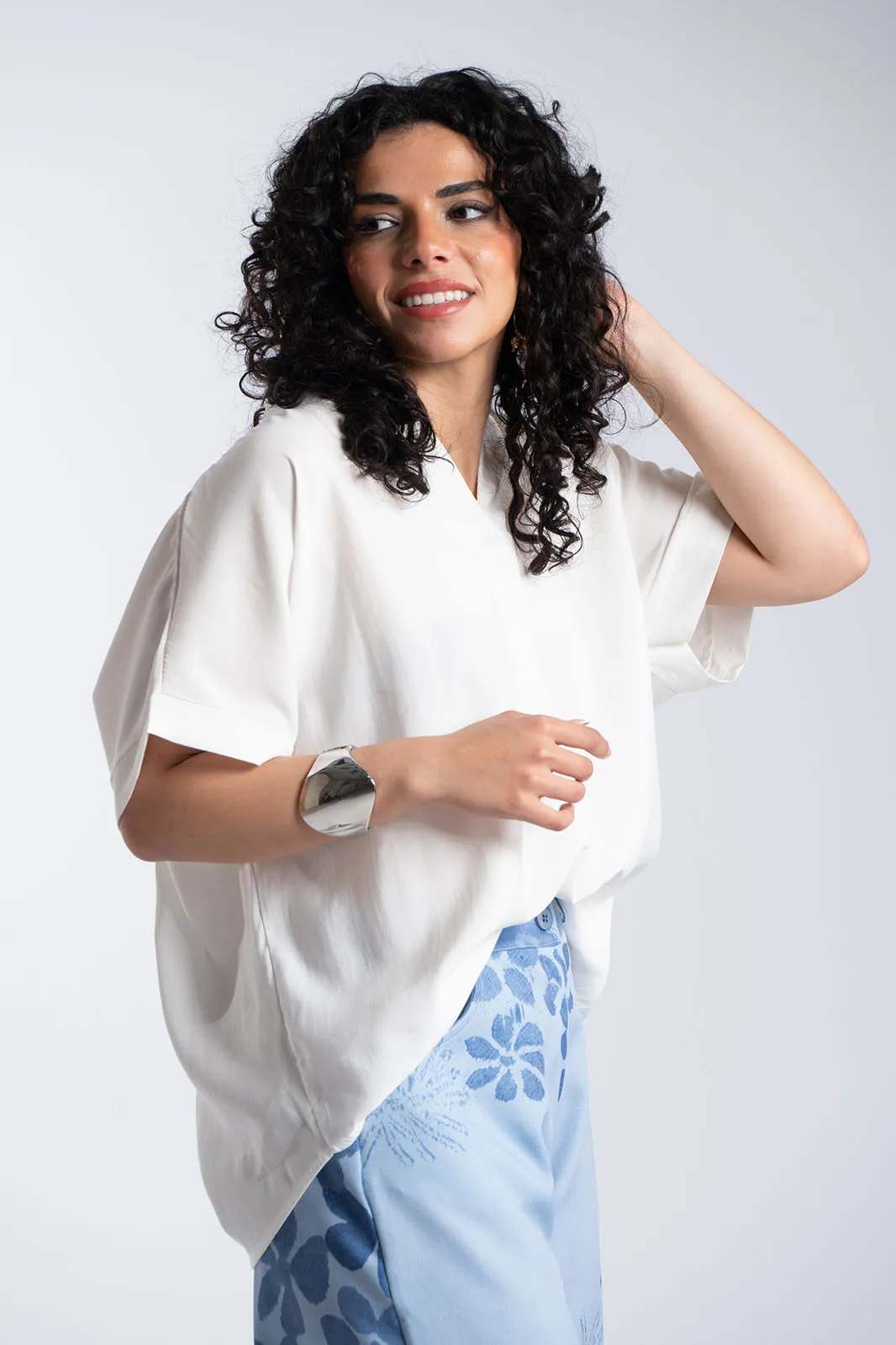 Minimal μπλούζα σε oversized γραμμή που προσφέρει άνεση και κομψότητα. Διαθέτει mao γιακά και διακριτικό V άνοιγμα στο μπροστινό μέρος, ενώ τα φαρδιά μανίκια χαρίζουν αέρινη αίσθηση. Στο τελείωμα της λαιμόκοψης διαθέτει πιέτα. Το ύφασμά της είναι ελαφρύ και δροσερό, ιδανικό για καθημερινές αλλά και πιο προσεγμένες εμφανίσεις.