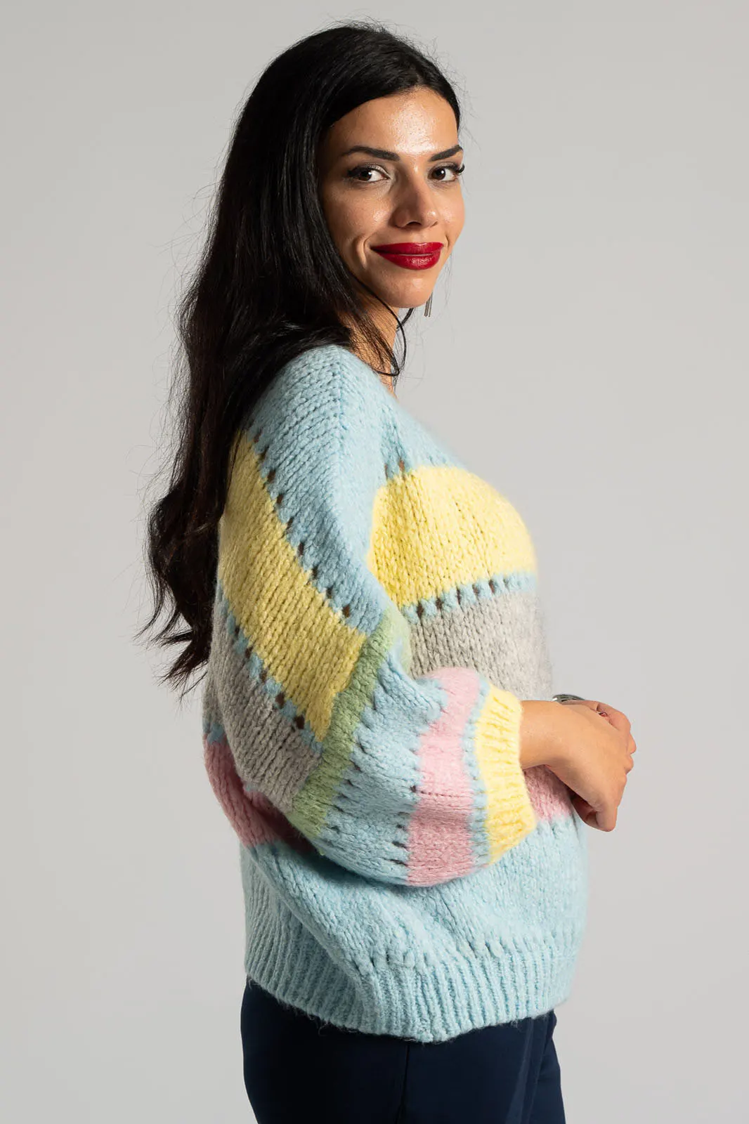 Loosely knitted blouse. It has a round neckline. It has short sleeves. Wide stripes in multicolor shades across the entire surface. The measurements in the table are representative for each product. 65% acrylic, 17% polyamide, 9% wool, 9% viscose. Hand wash according to instructions.