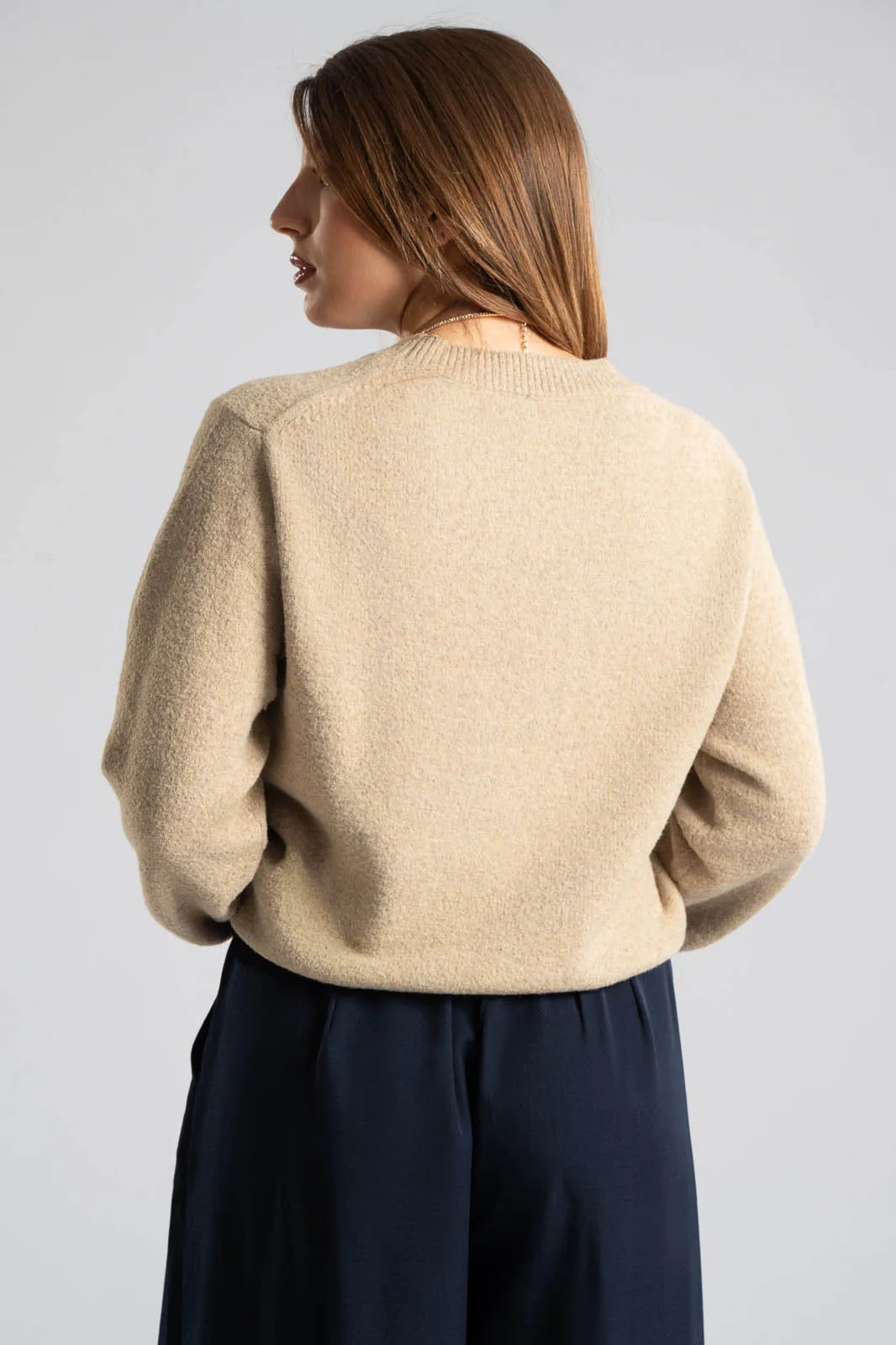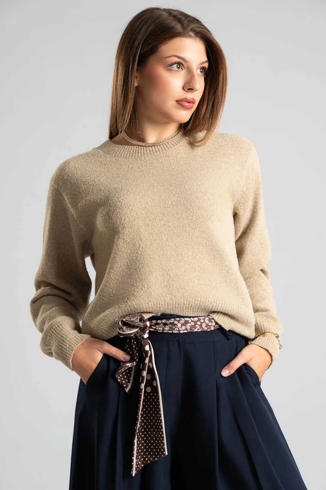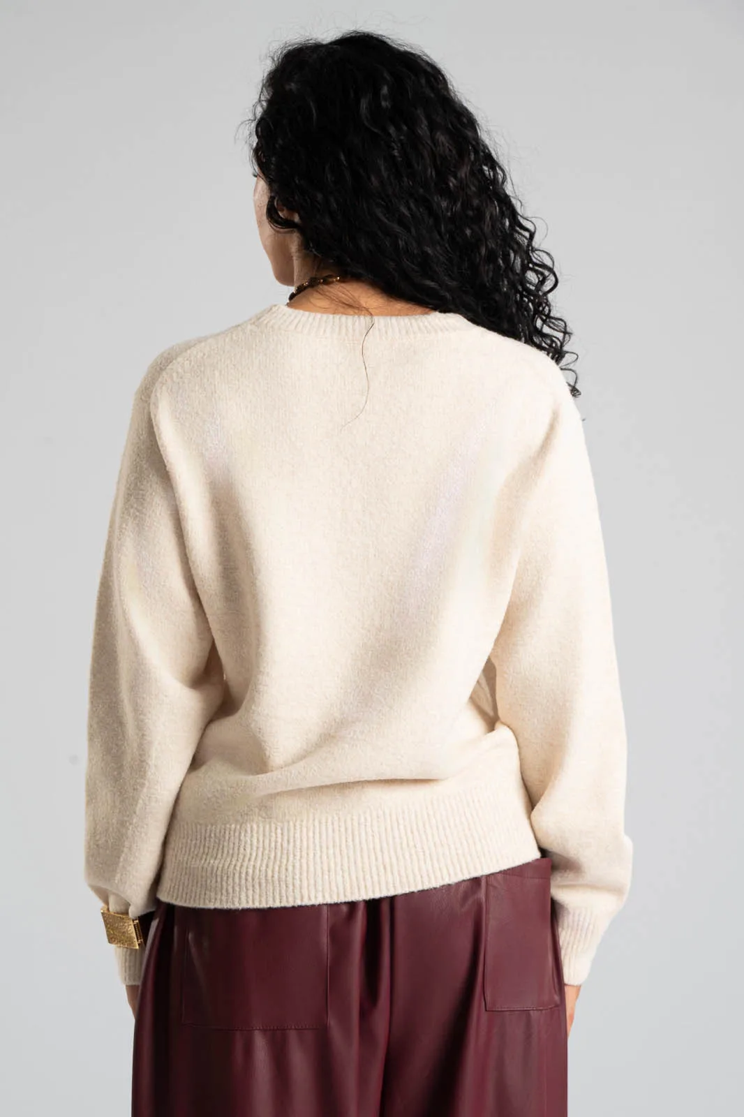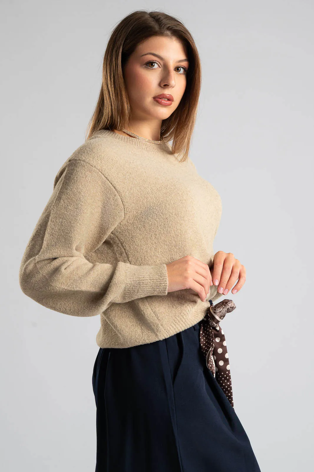 Μπλούζα με στρογγυλή λαιμόκοψη. Διαθέτει μακριά μανίκια. Στην λαιμόκοψη, στο τελείωμα και στο τελείωμα των μανικιών έχει rib ύφανση. Οι μετρήσεις του πίνακα είναι αντιπροσωπευτικές για κάθε κωδικό. 54% viscose, 25% acrylico, 14% polyester, 5% wool, 2% spandex.