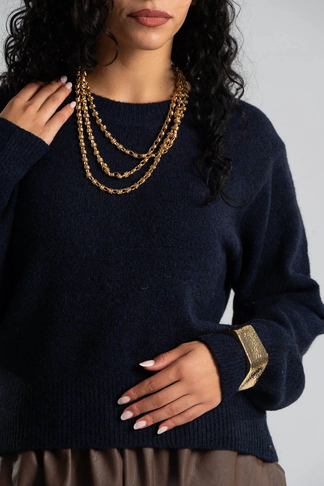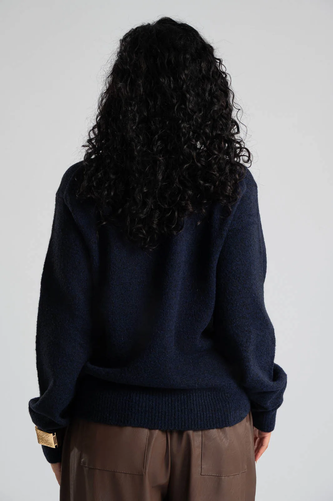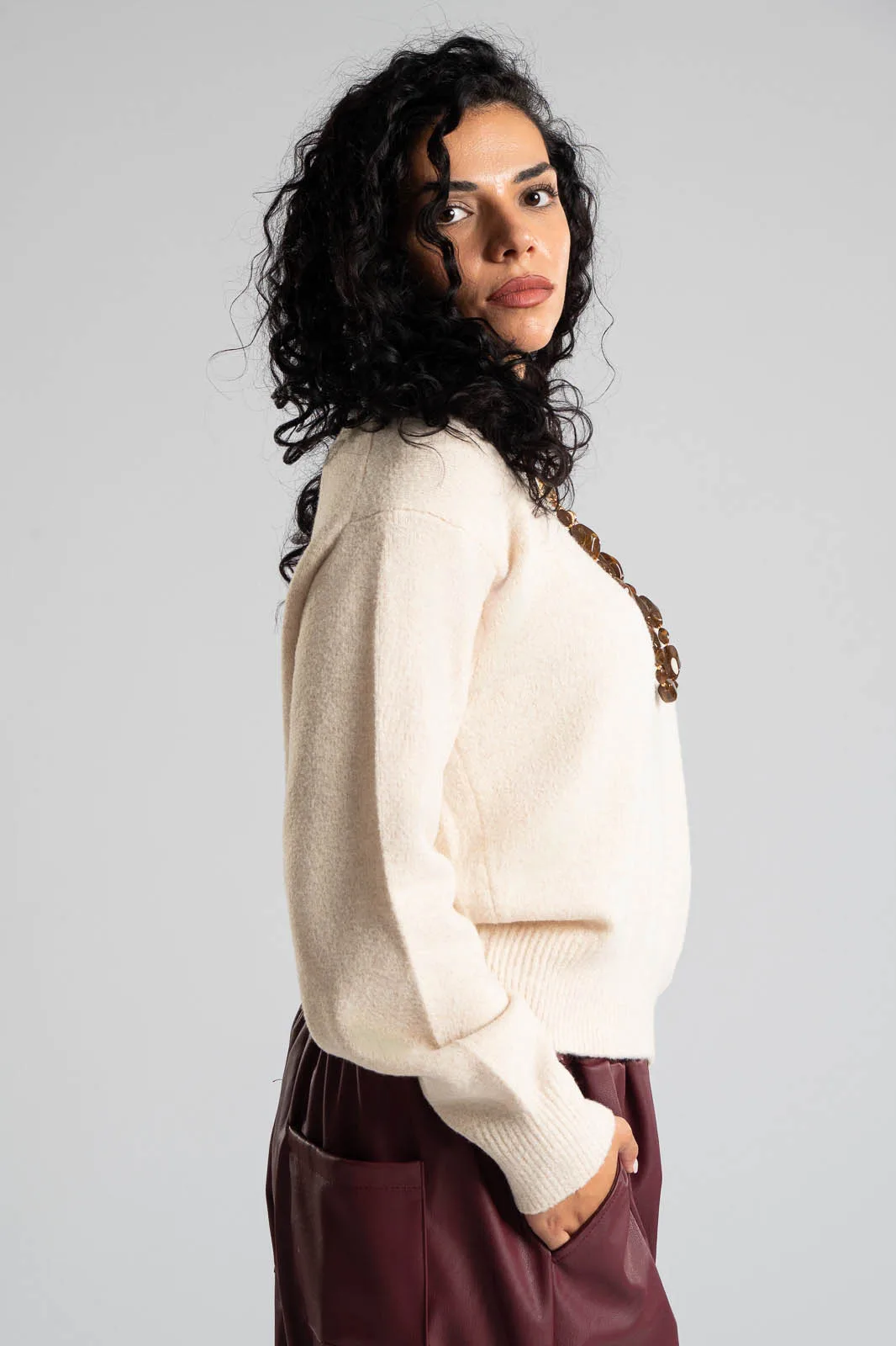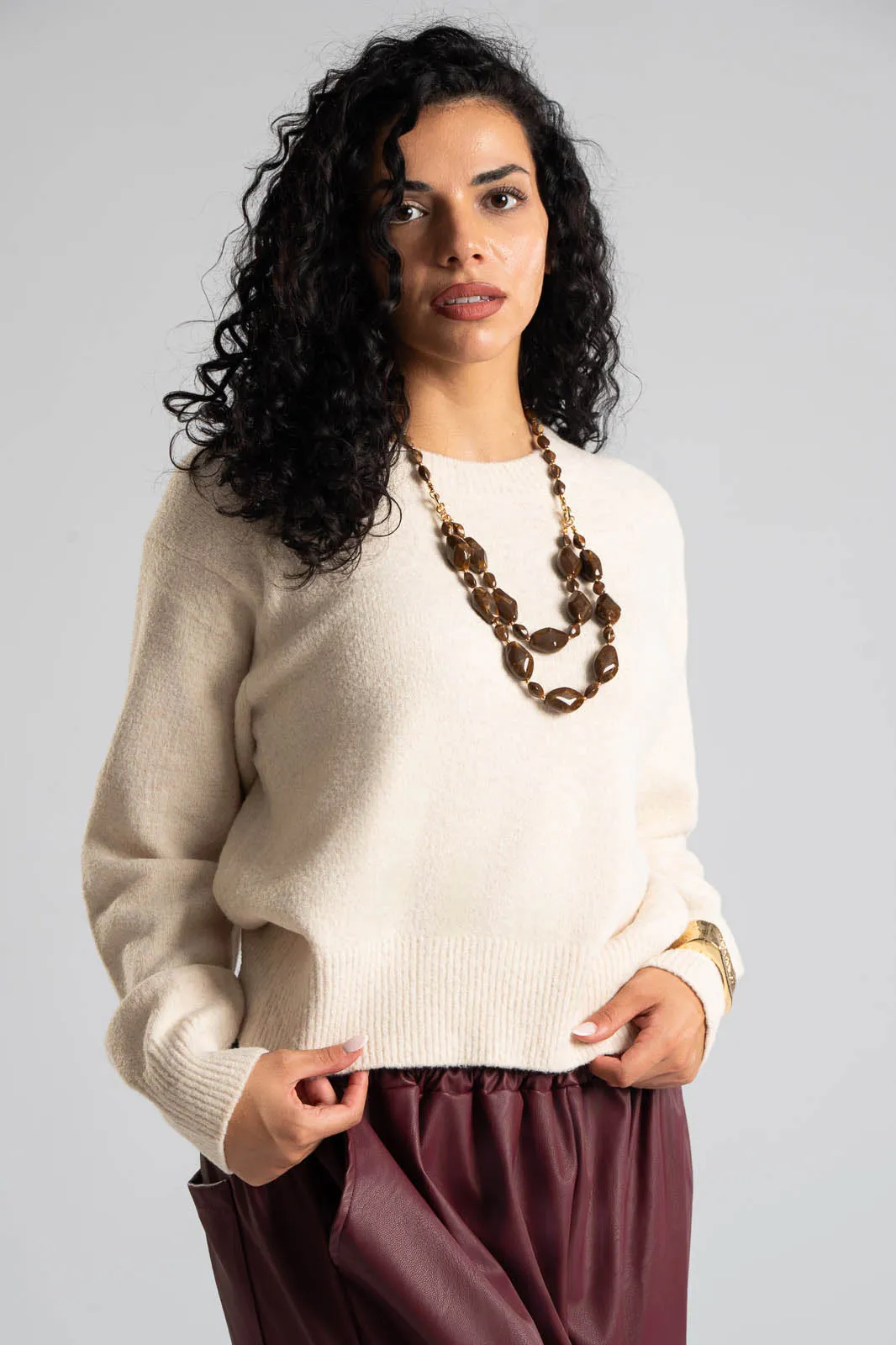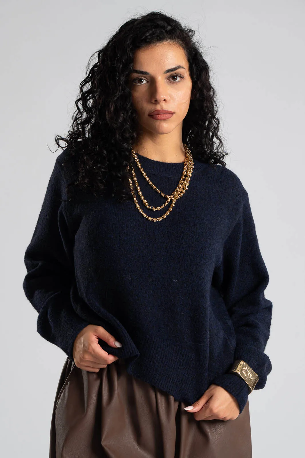 Μπλούζα με στρογγυλή λαιμόκοψη. Διαθέτει μακριά μανίκια. Στην λαιμόκοψη, στο τελείωμα και στο τελείωμα των μανικιών έχει rib ύφανση. Οι μετρήσεις του πίνακα είναι αντιπροσωπευτικές για κάθε κωδικό. 54% viscose, 25% acrylico, 14% polyester, 5% wool, 2% spandex.