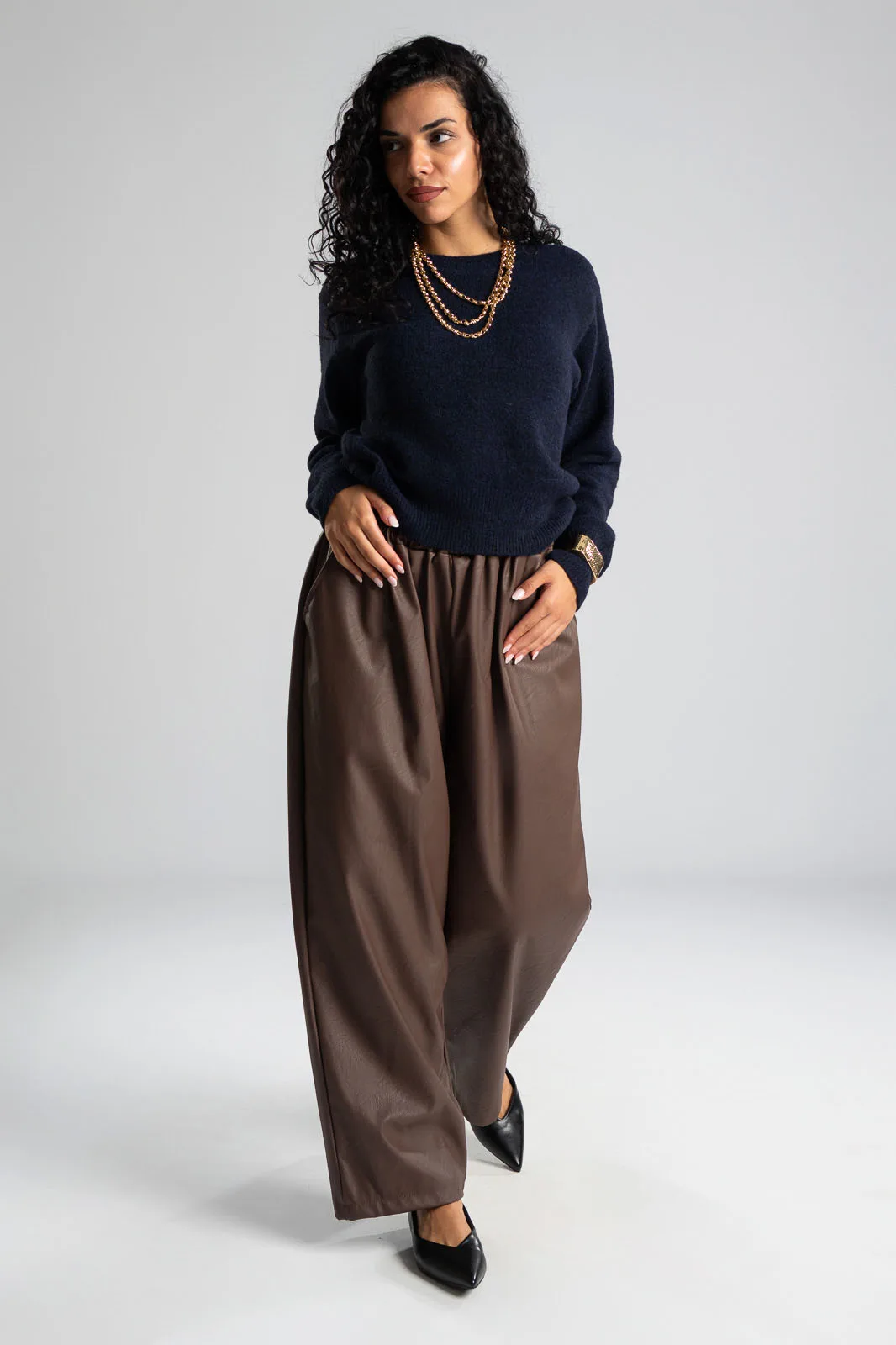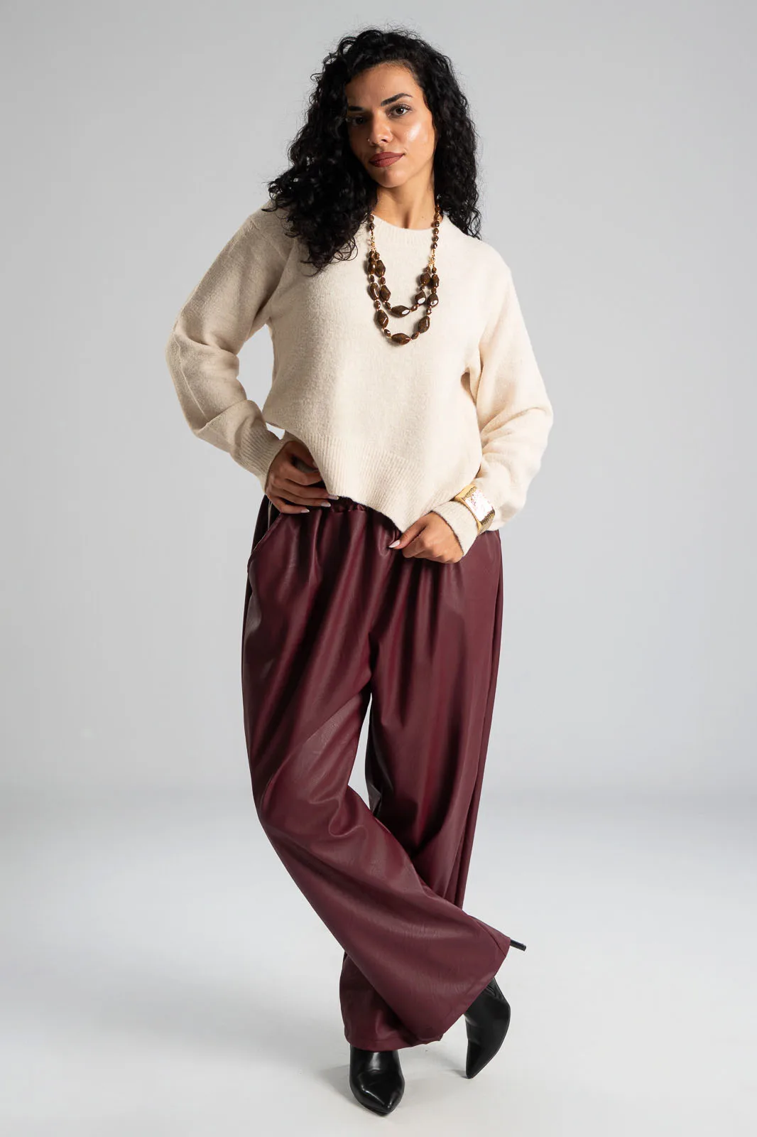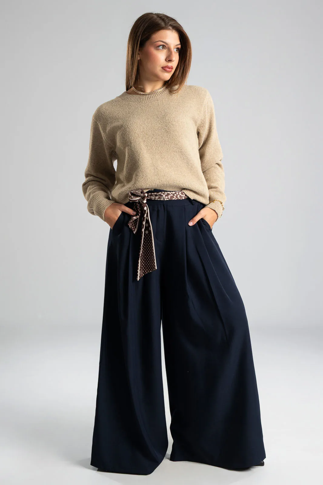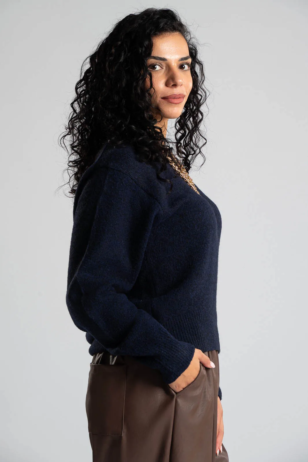 Μπλούζα με στρογγυλή λαιμόκοψη. Διαθέτει μακριά μανίκια. Στην λαιμόκοψη, στο τελείωμα και στο τελείωμα των μανικιών έχει rib ύφανση. Οι μετρήσεις του πίνακα είναι αντιπροσωπευτικές για κάθε κωδικό. 54% viscose, 25% acrylico, 14% polyester, 5% wool, 2% spandex.
