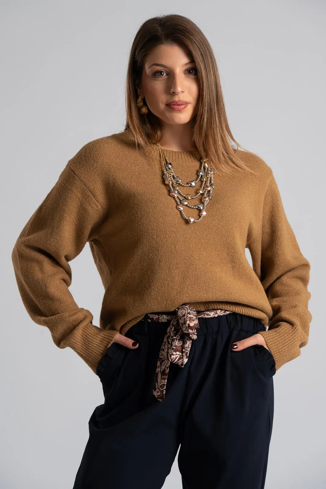 Blouse with round neckline. It has long sleeves. Ribbed knit at the neckline, hem, and cuffs. The measurements in the table are representative for each code. 54% viscose, 25% acrylic, 14% polyester, 5% wool, 2% spandex.
