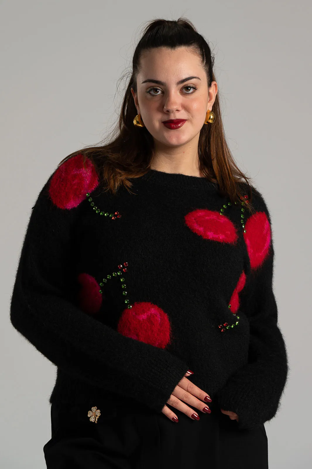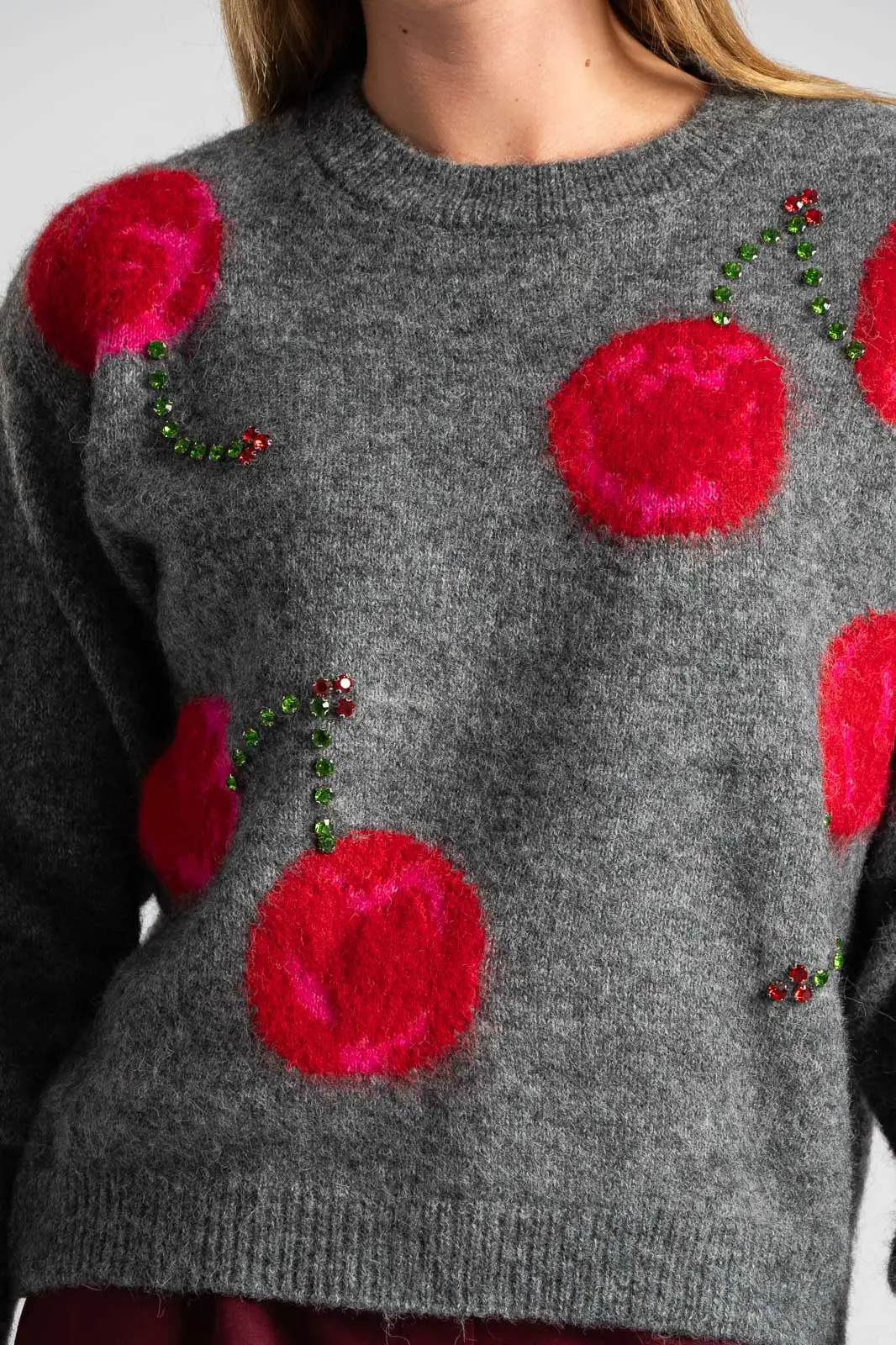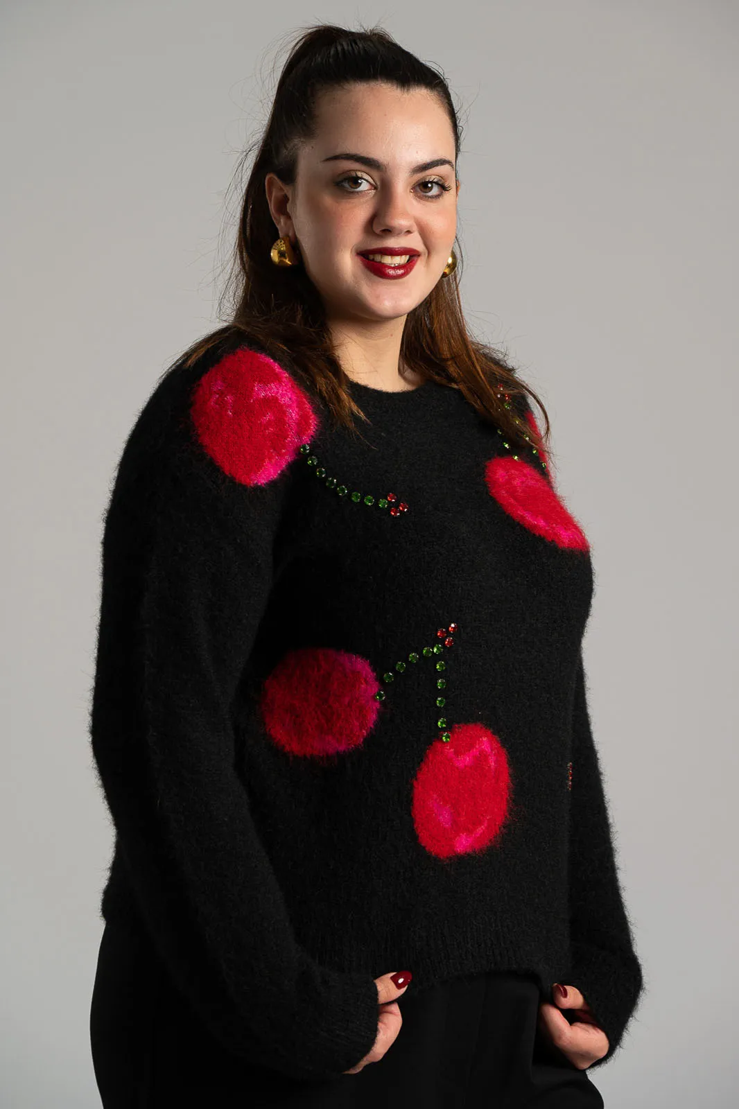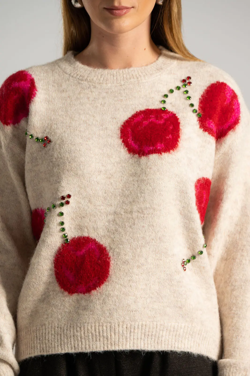 Πουλόβερ με στρογγυλή λαιμόκοψη. Διαθέτει μακριά μανίκια που καταλήγουν σε rib ύφανση όπως και στην λαιμόκοψη. Στην μπροστινή επιφάνεια έχει cherry print και διακσομητικά ραμμένα μεγάλα στρας. Οι μετρήσεις του πίνακα είναι αντιπροσωπευτικές για κάθε προϊόν. 100% viscose.