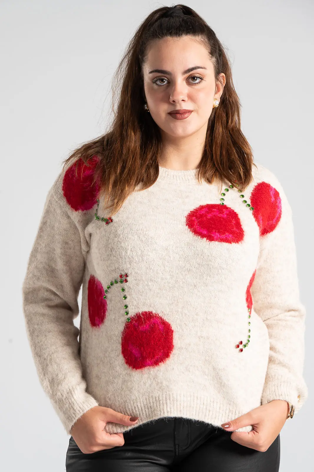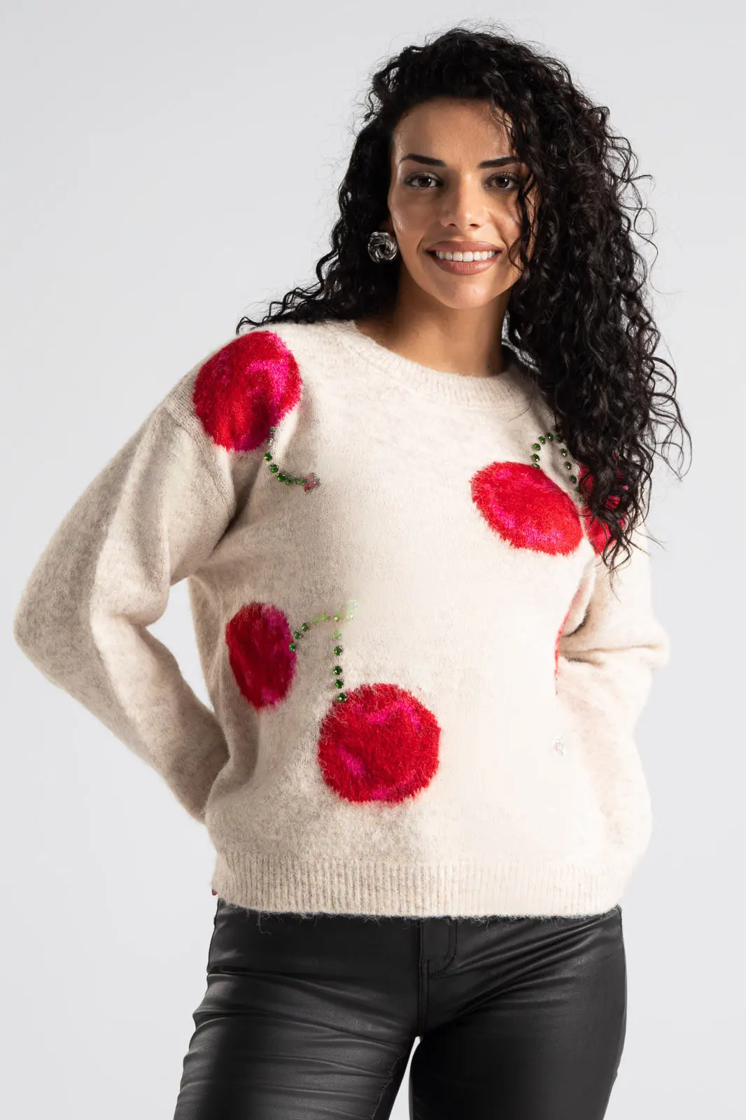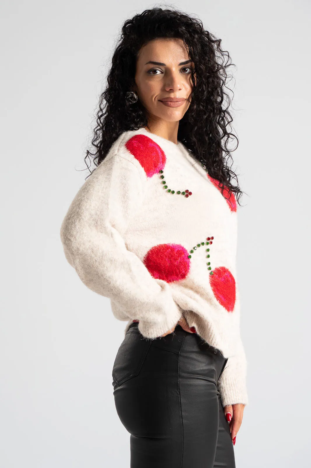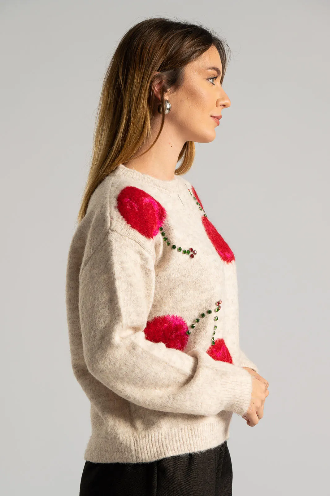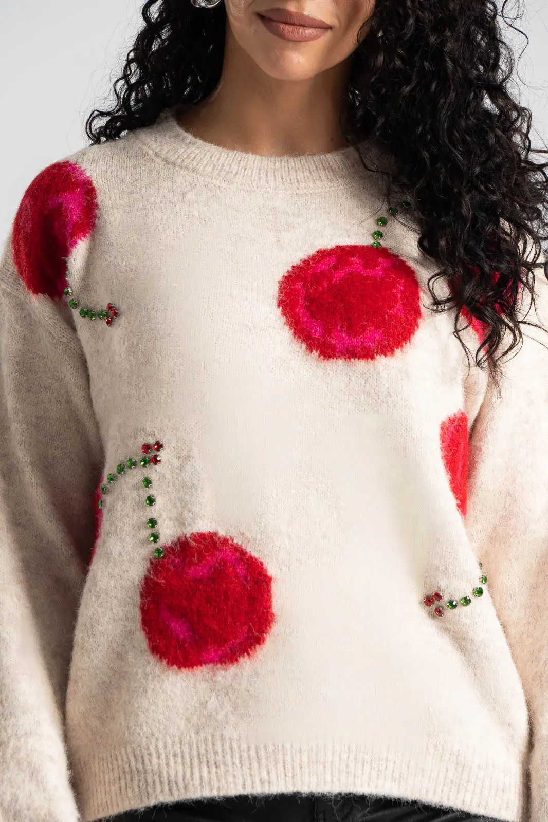 Πουλόβερ με στρογγυλή λαιμόκοψη. Διαθέτει μακριά μανίκια που καταλήγουν σε rib ύφανση όπως και στην λαιμόκοψη. Στην μπροστινή επιφάνεια έχει cherry print και διακσομητικά ραμμένα μεγάλα στρας. Οι μετρήσεις του πίνακα είναι αντιπροσωπευτικές για κάθε προϊόν. 100% viscose.