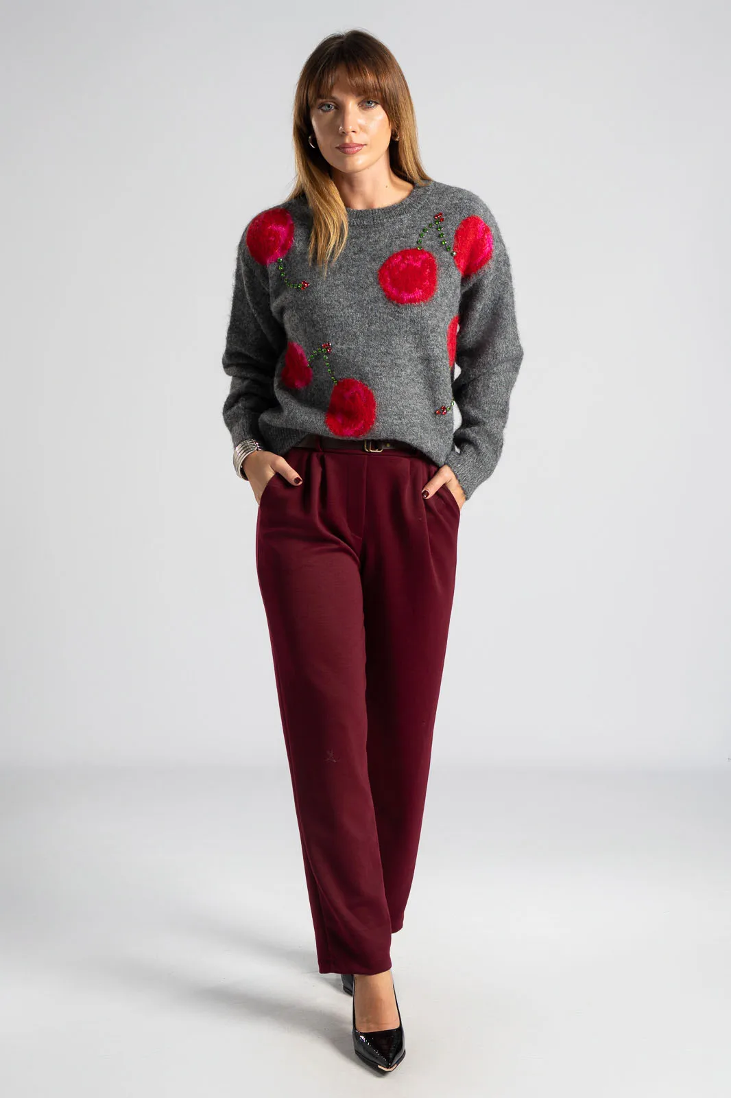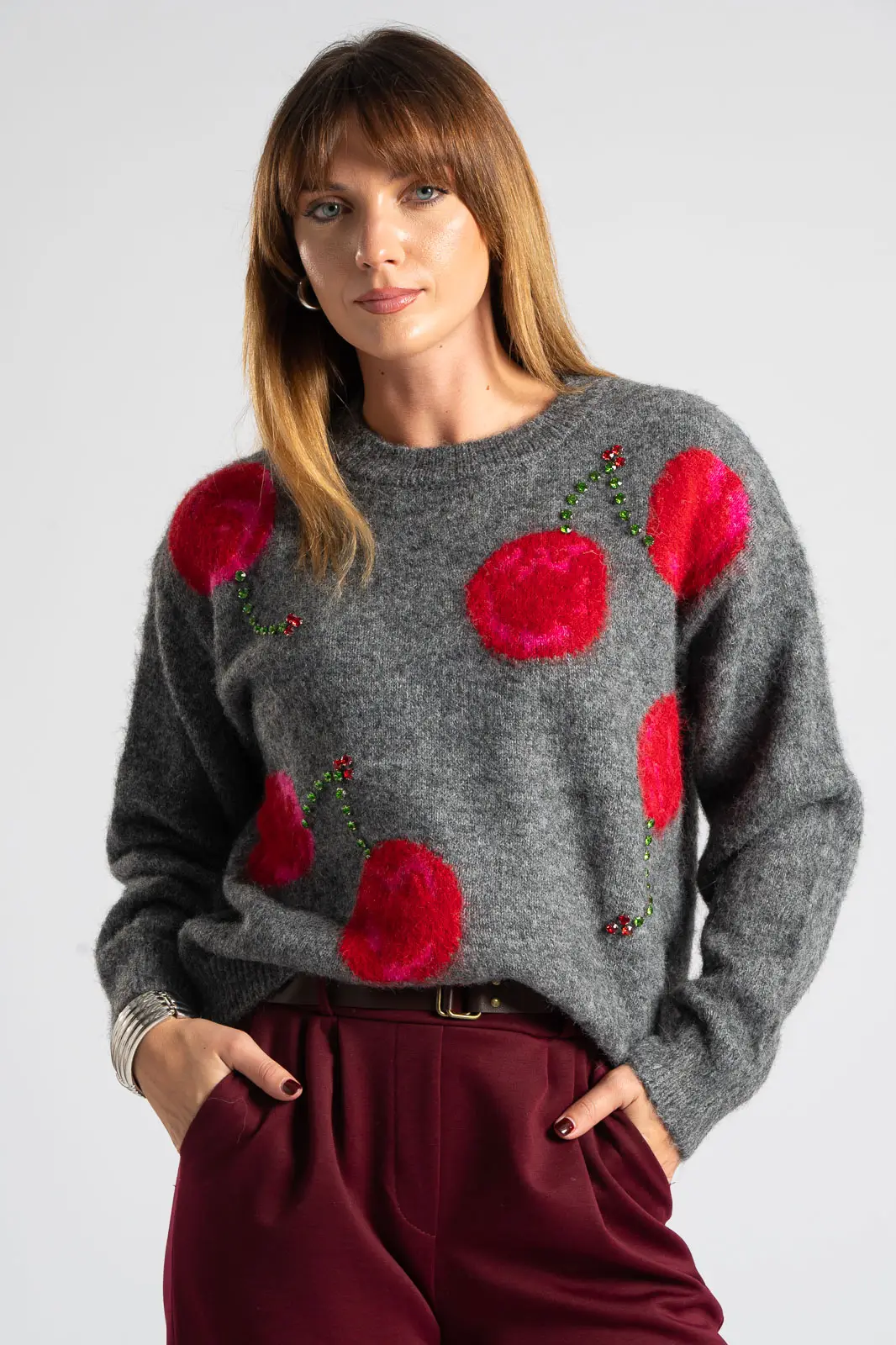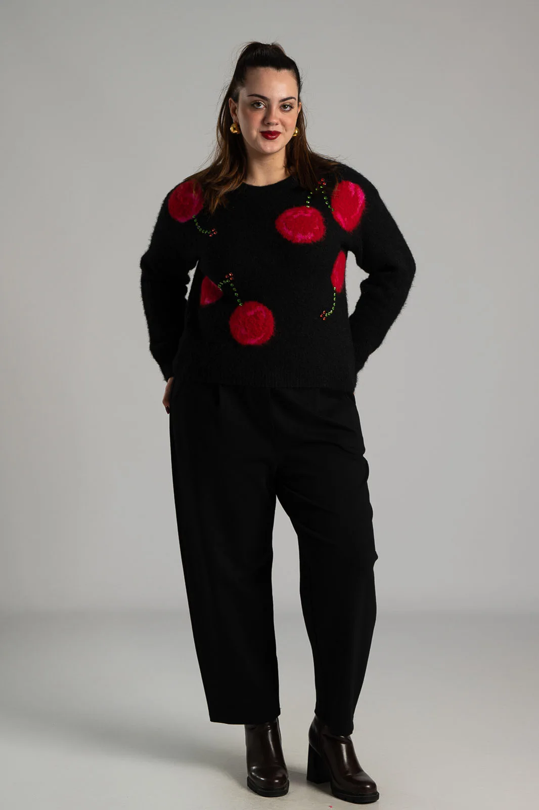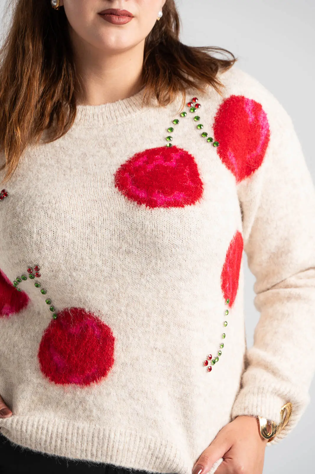 Πουλόβερ με στρογγυλή λαιμόκοψη. Διαθέτει μακριά μανίκια που καταλήγουν σε rib ύφανση όπως και στην λαιμόκοψη. Στην μπροστινή επιφάνεια έχει cherry print και διακσομητικά ραμμένα μεγάλα στρας. Οι μετρήσεις του πίνακα είναι αντιπροσωπευτικές για κάθε προϊόν. 100% viscose.