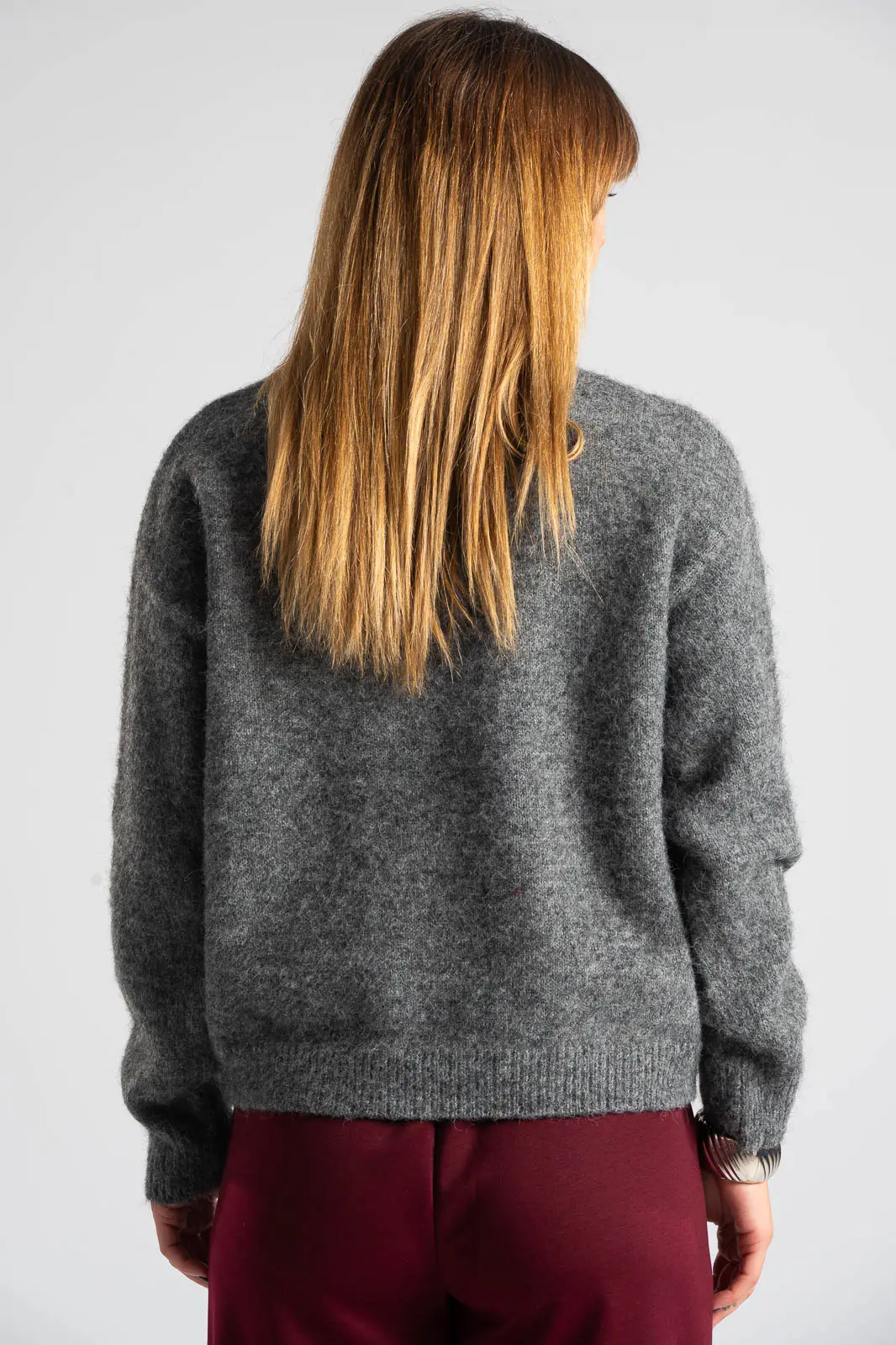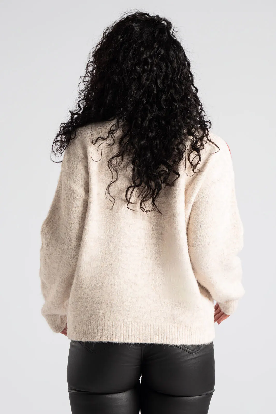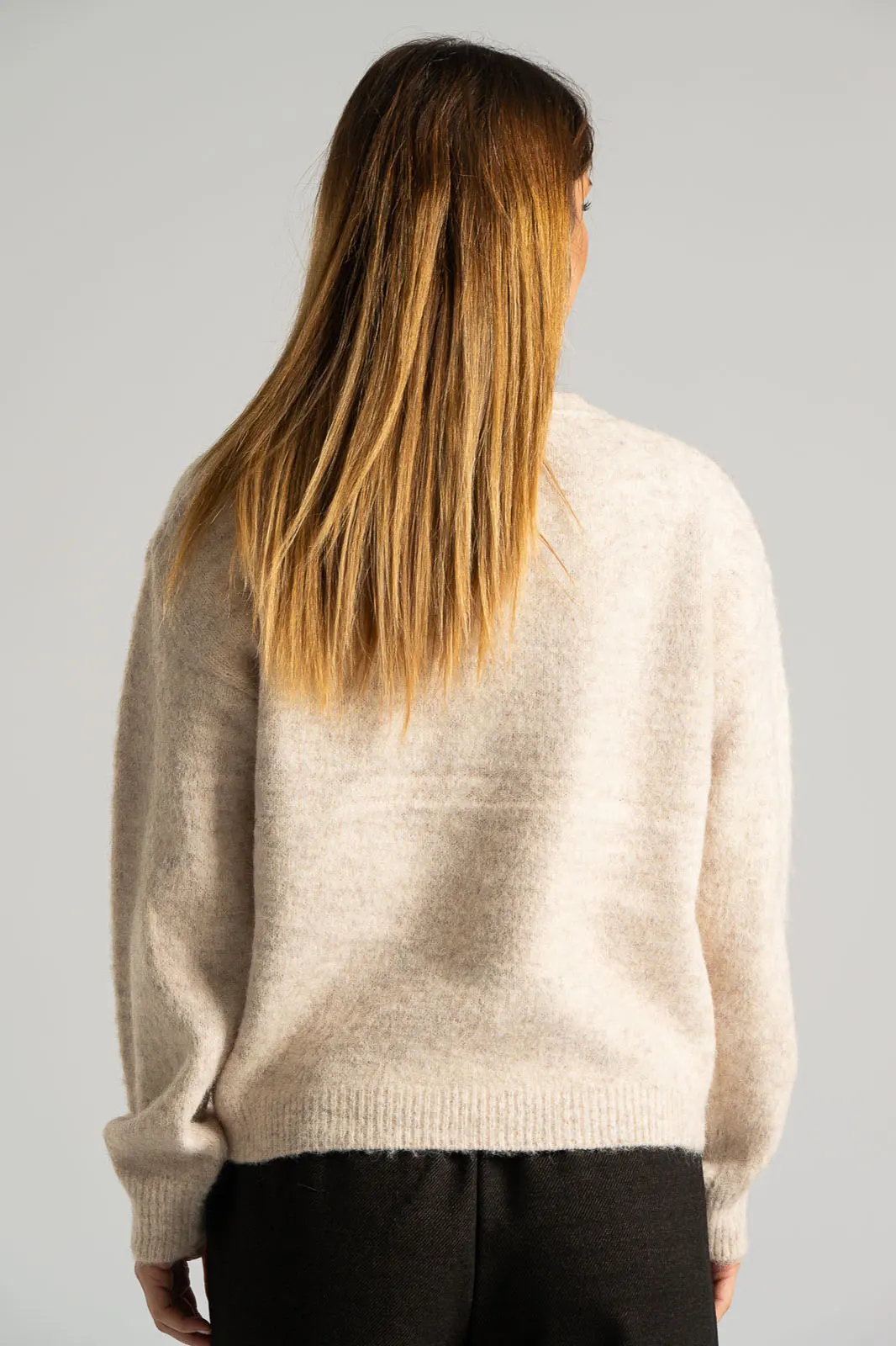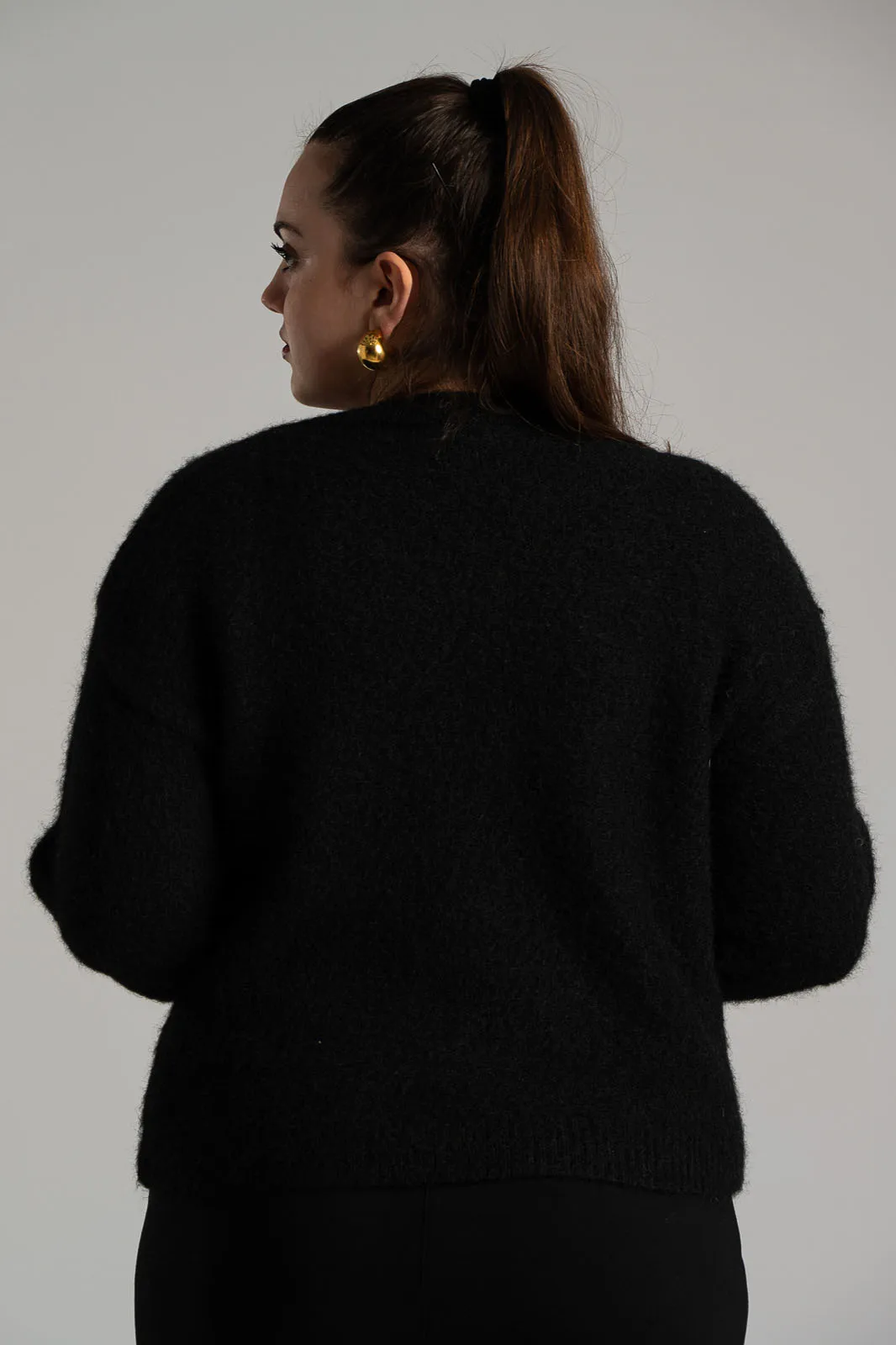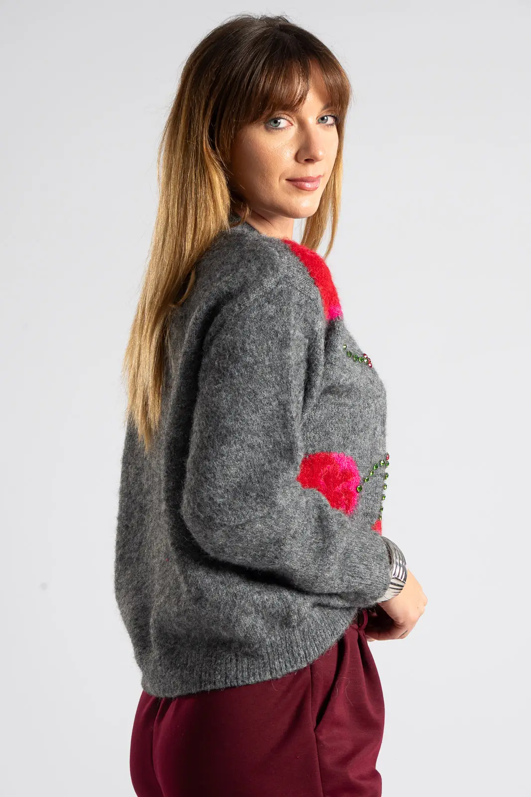 Πουλόβερ με στρογγυλή λαιμόκοψη. Διαθέτει μακριά μανίκια που καταλήγουν σε rib ύφανση όπως και στην λαιμόκοψη. Στην μπροστινή επιφάνεια έχει cherry print και διακσομητικά ραμμένα μεγάλα στρας. Οι μετρήσεις του πίνακα είναι αντιπροσωπευτικές για κάθε προϊόν. 100% viscose.