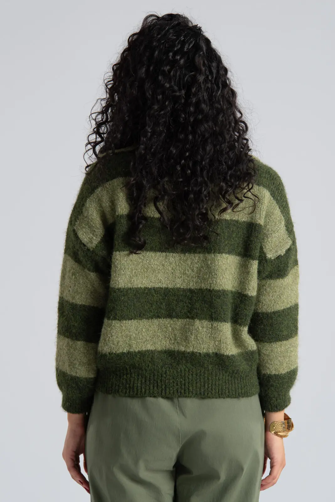 Blouse with a V-neck and collar. It has long sleeves. Wide stripes across the entire surface. The measurements in the table are representative for each code. 59% recycled polyester, 21% nylon, 8% wool, 1% spandex.