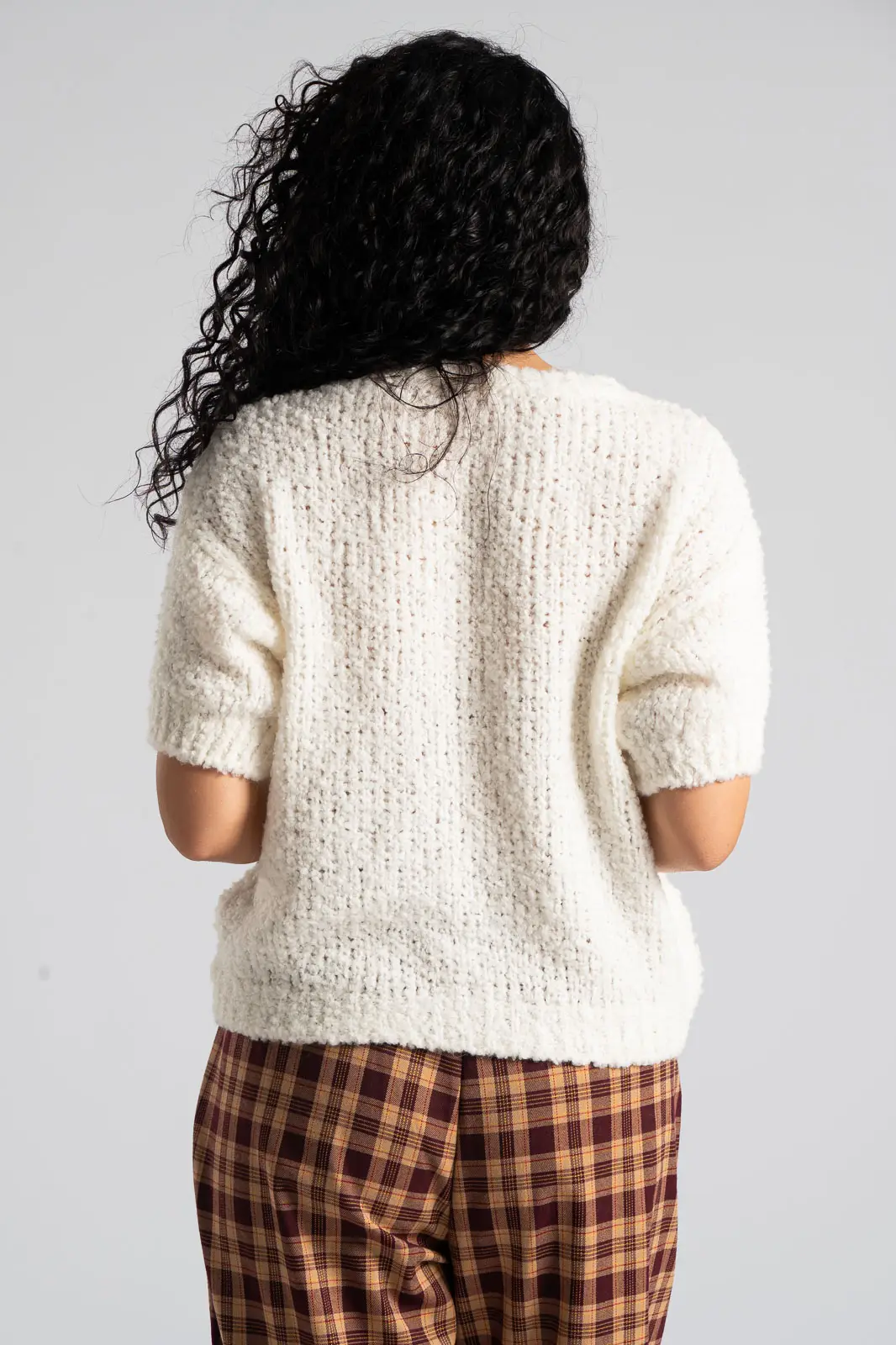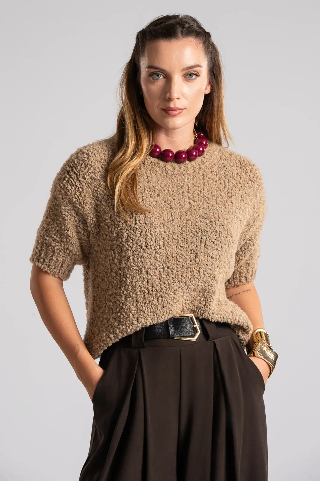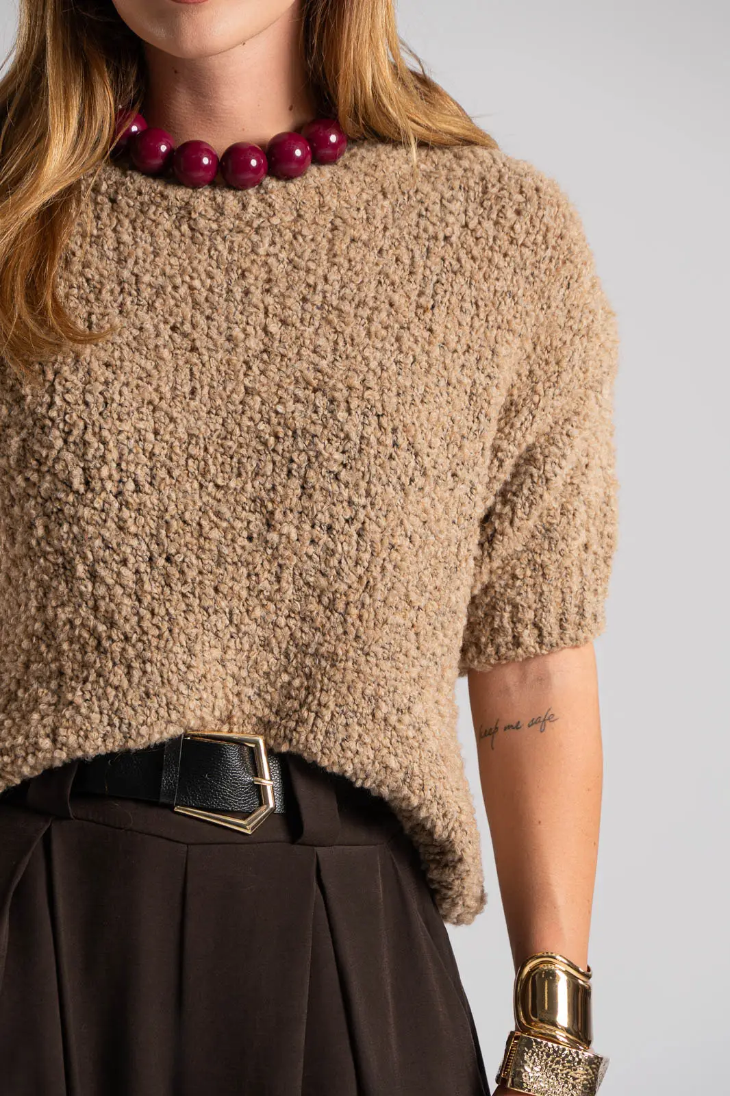 Μπλούζα teddy με στρογγυλή λαιμόκοψη. Διαθέτει κοντά μανίκια. Στο τελείωμα της, στη λαιμόκοψη και στα μανίκια είναι σε rib ύφανση. Οι μετρήσεις του πίνακα είναι αντιπροσωπευτικές για κάθε προϊόν. 62% acrylic, 18% polyester, 8% lana, 8% viscose, 4% alpaka.