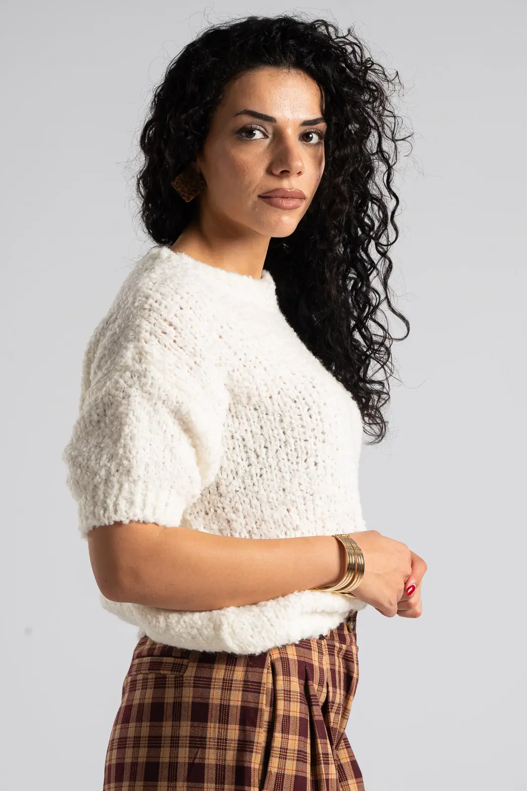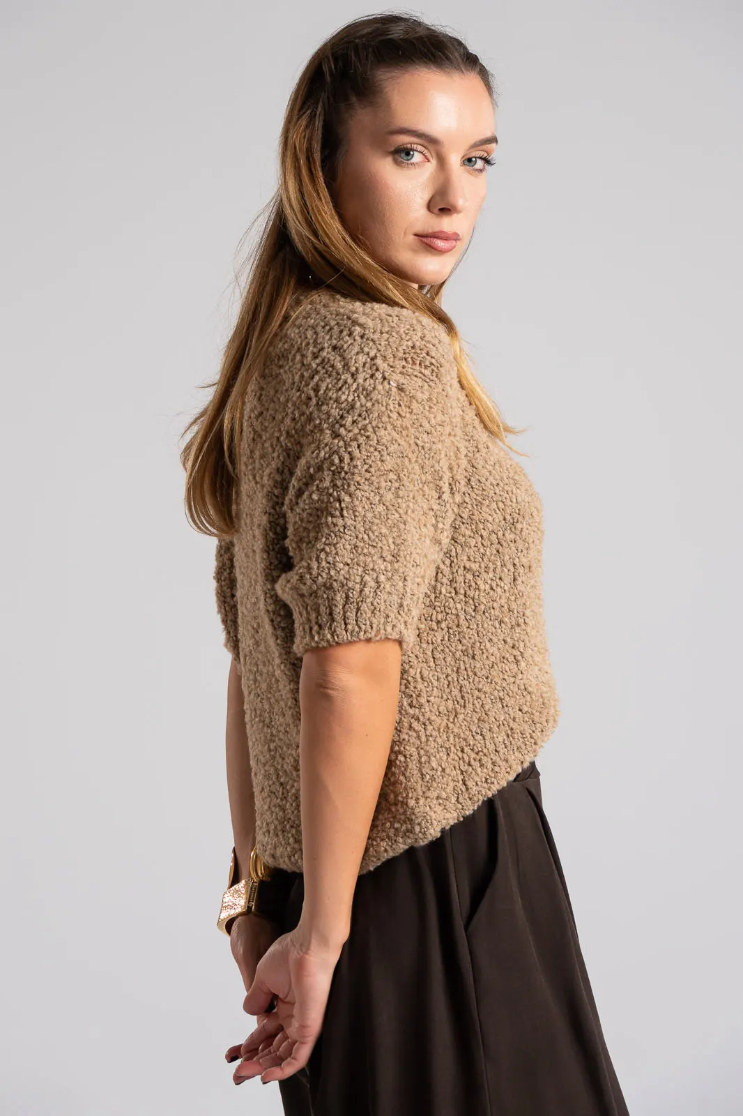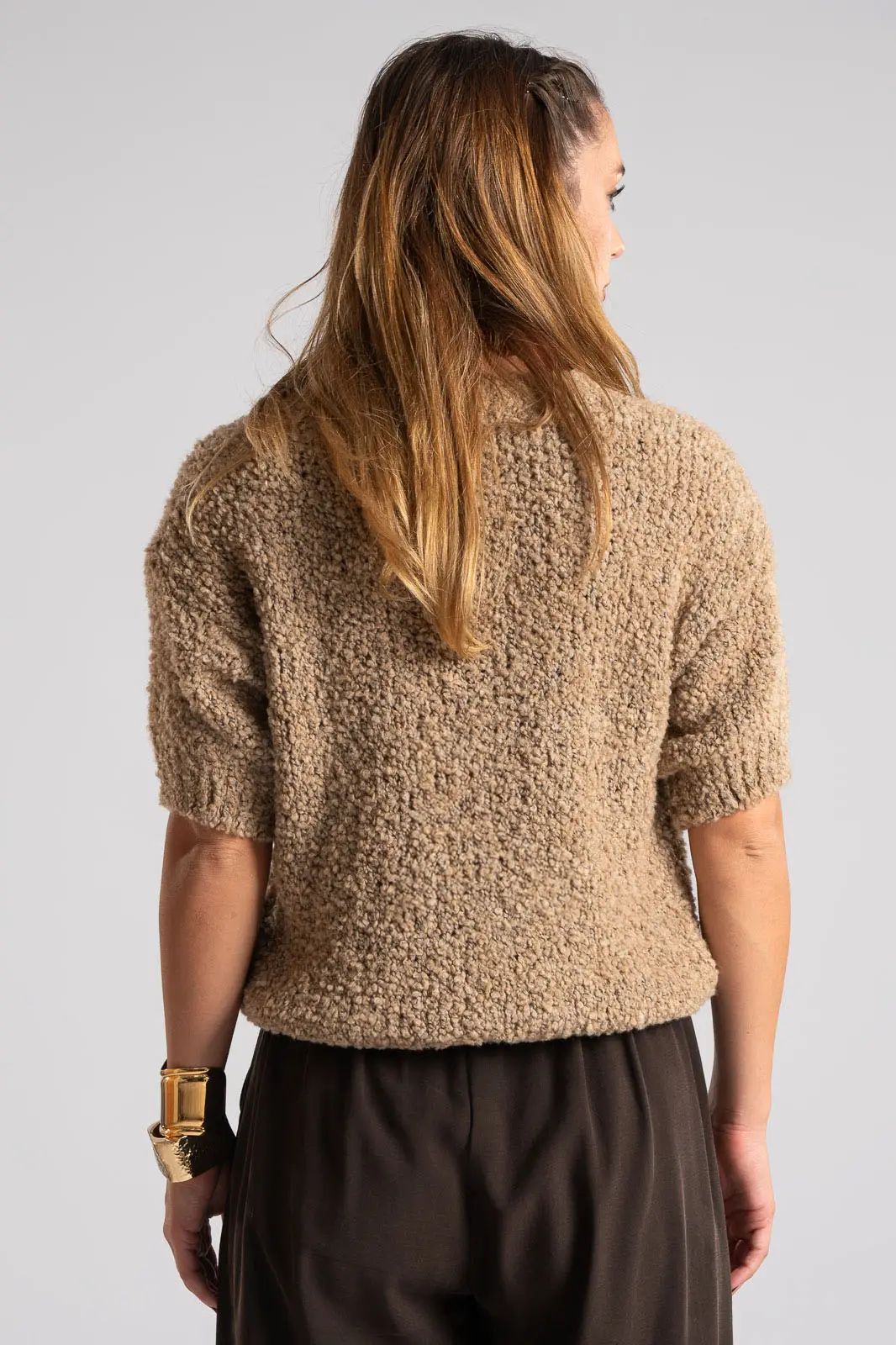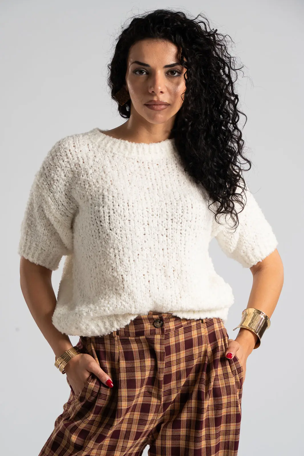 Μπλούζα teddy με στρογγυλή λαιμόκοψη. Διαθέτει κοντά μανίκια. Στο τελείωμα της, στη λαιμόκοψη και στα μανίκια είναι σε rib ύφανση. Οι μετρήσεις του πίνακα είναι αντιπροσωπευτικές για κάθε προϊόν. 62% acrylic, 18% polyester, 8% lana, 8% viscose, 4% alpaka.