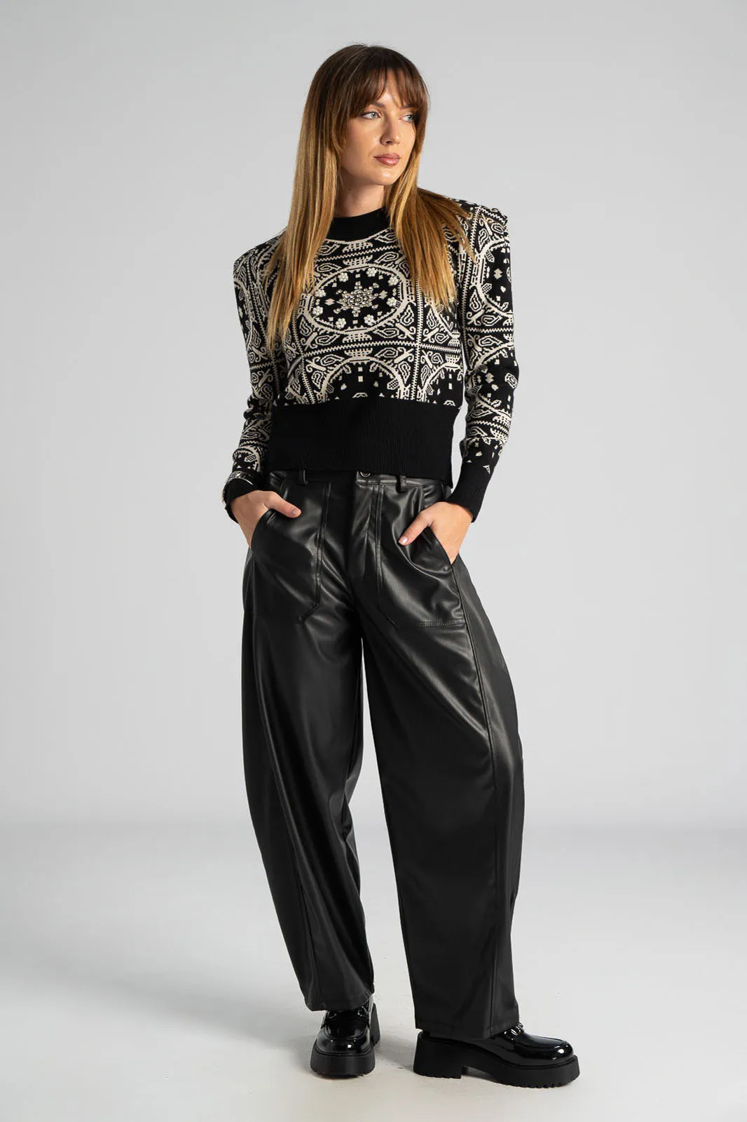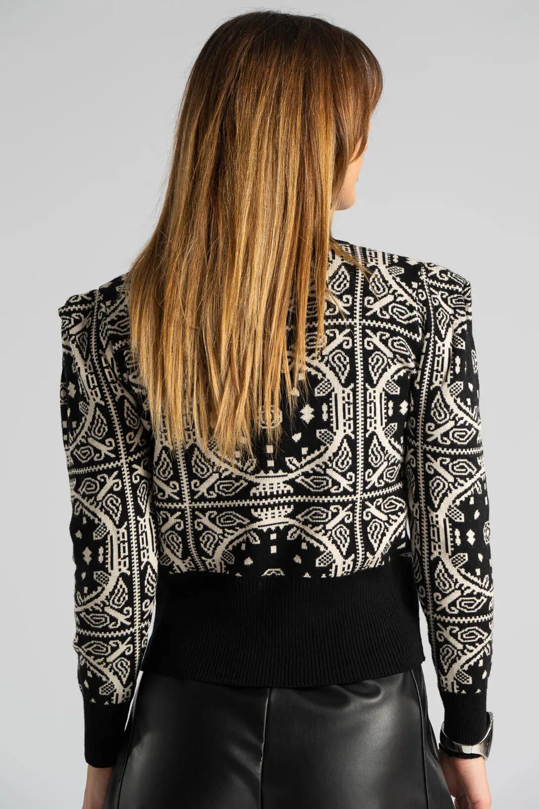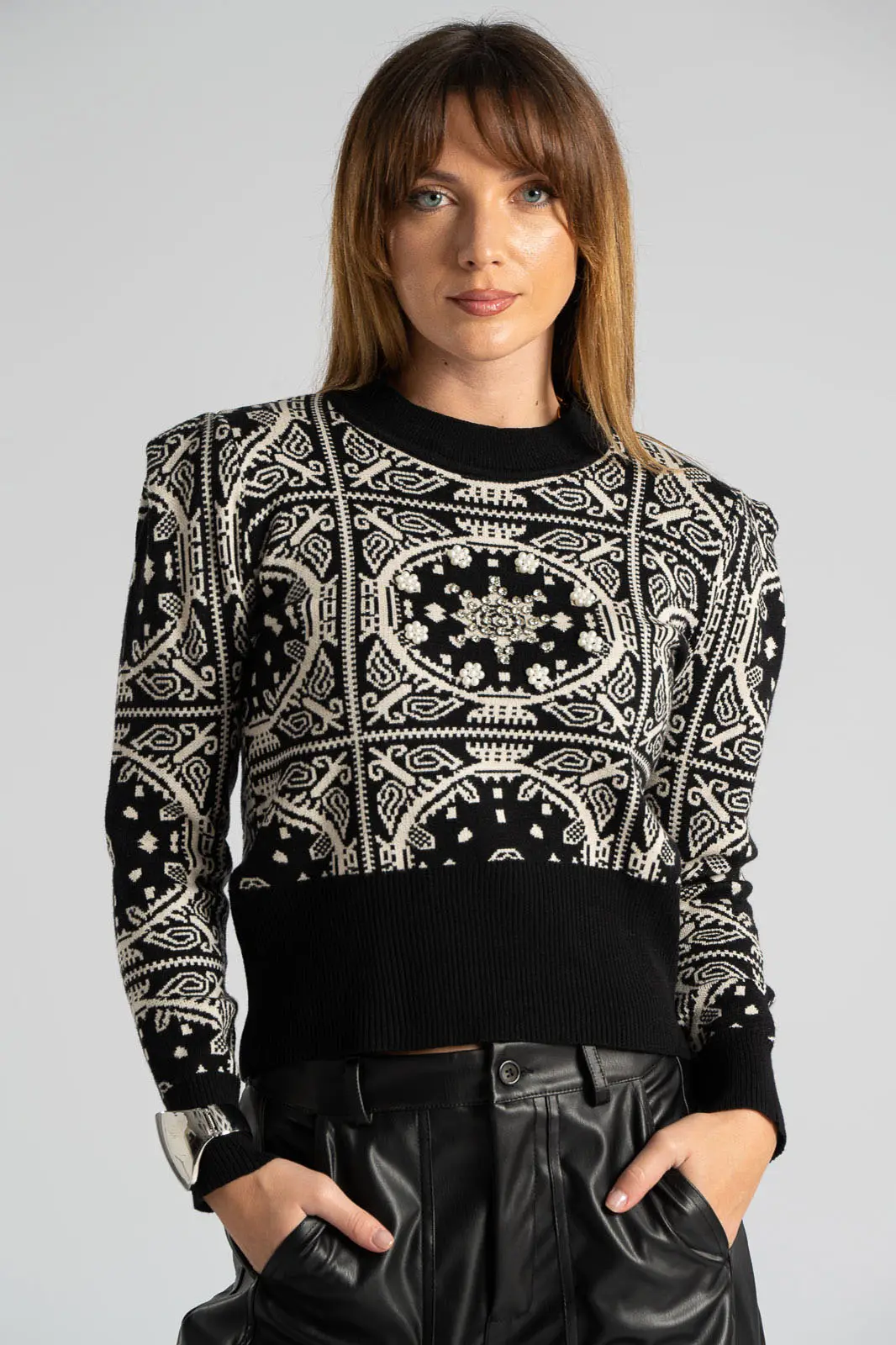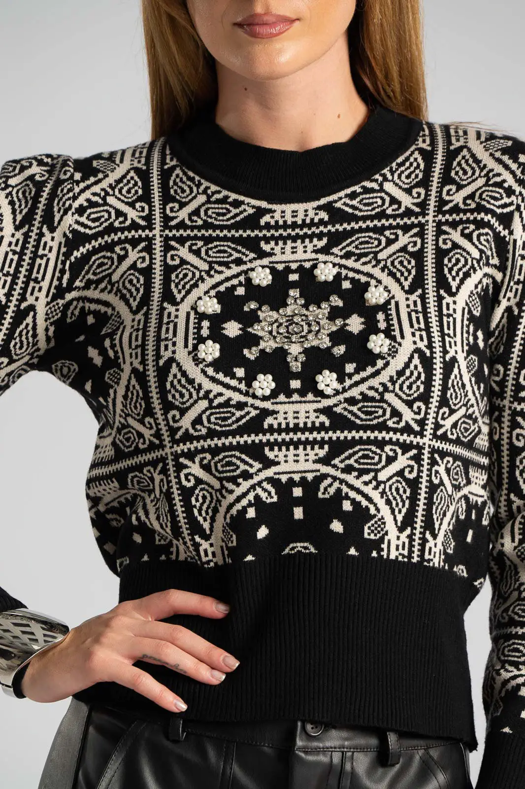 Μπλούζα πουλόβερ με στρογγυλή λαιμόκοψη. Έχει μακριά μανίκια και στους ώμους είναι ελαφρως τετραγωνισμένο. Σε όλη την επιφάνεια έχει εμπριμέ σχέδια και στο μπροστινό μέρος διακοσμητικές πέρλες και στρας. Οι μετρήσεις του πίνακα είναι αντιπροσωπευτικές για κάθε κωδικό.Σύνθεση:50 viscose,30 polyester,20 nylon.