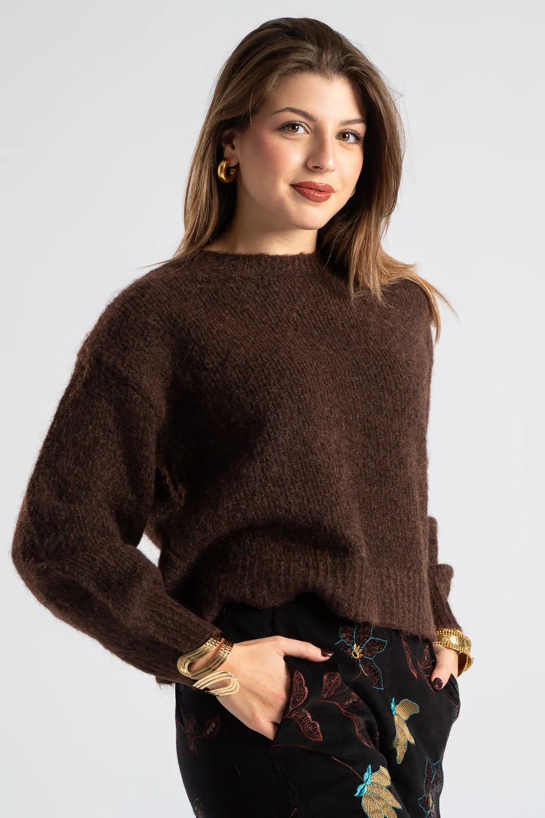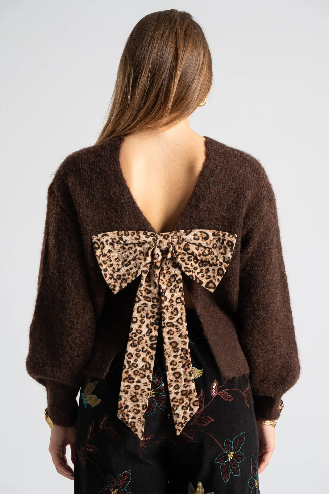 Blouse with round neckline. It has long sleeves that taper at the cuffs. The back has an opening that closes with a decorative bow in an animal pattern in the center. The measurements in the table are representative of each product. 59% polyester, 32% polyamide, 9% wool. Hand wash only.