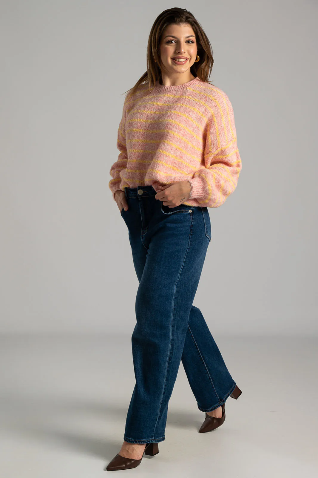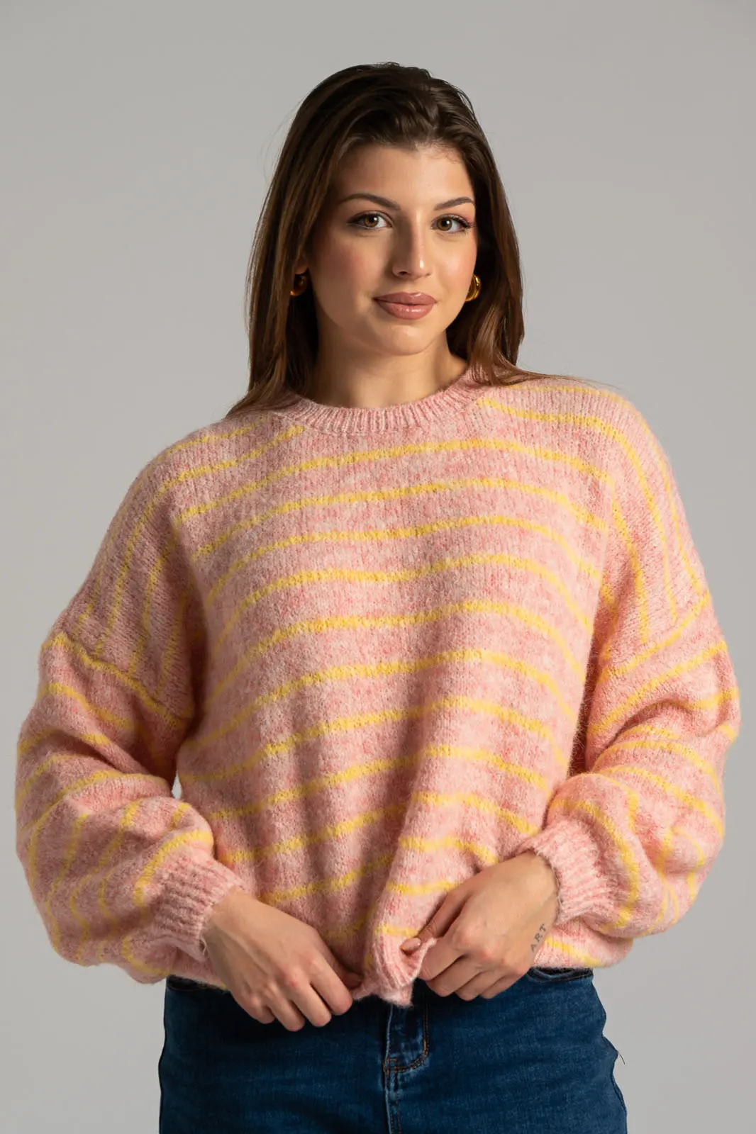 Blouse with a round neckline. It features a compact knit throughout and stripes. It has long sleeves. The measurements in the table are representative for each code. 59% viscose, 21% nylon, 11% polyester, 8% wool, 1% spandex.