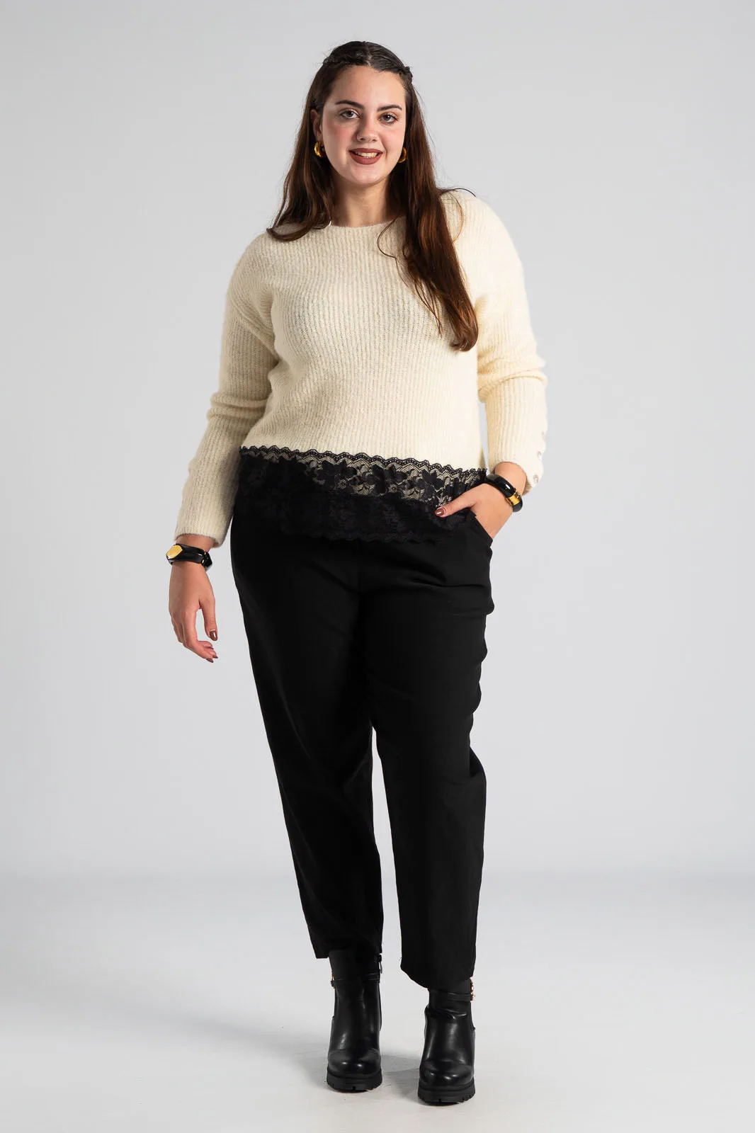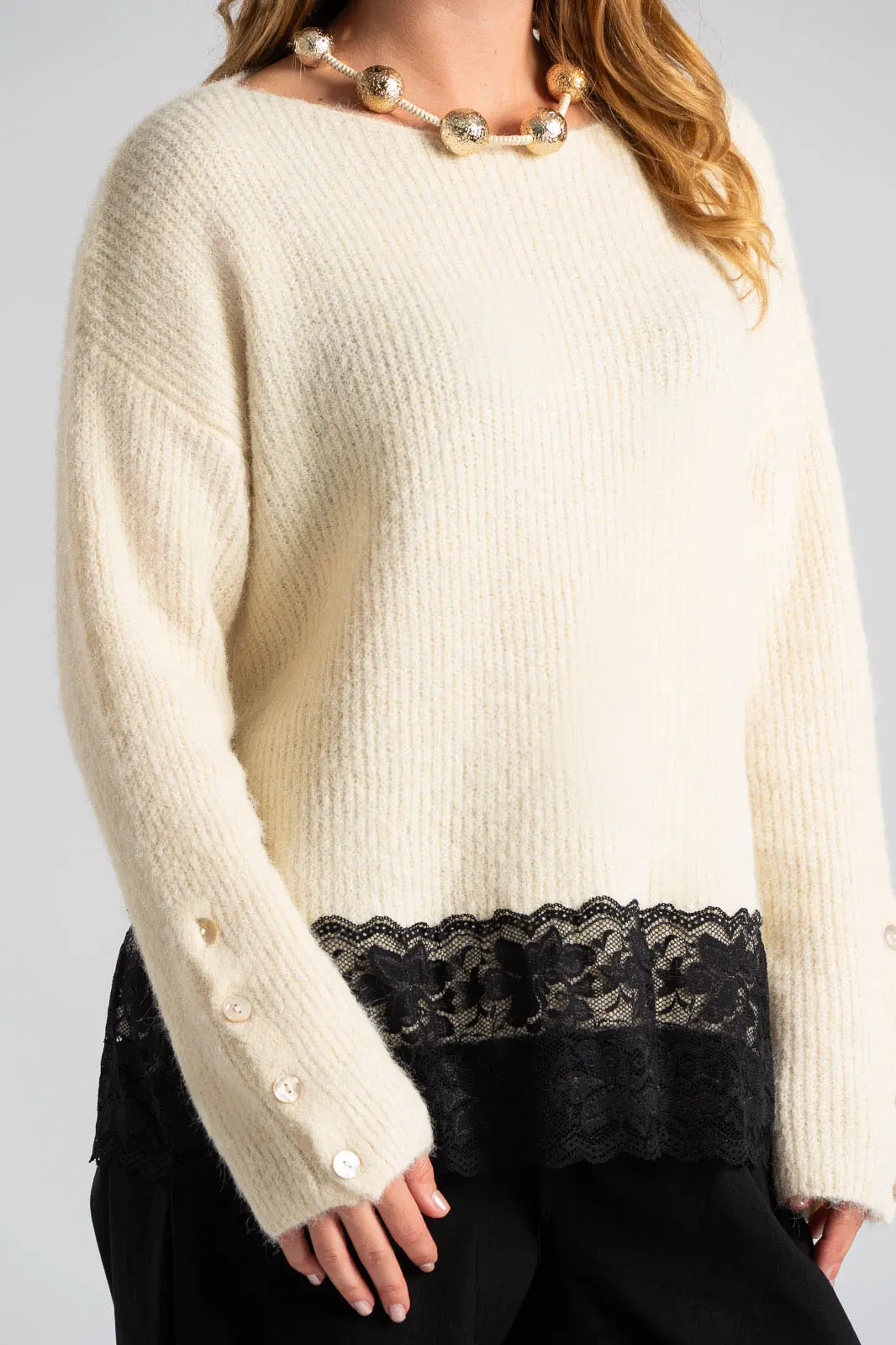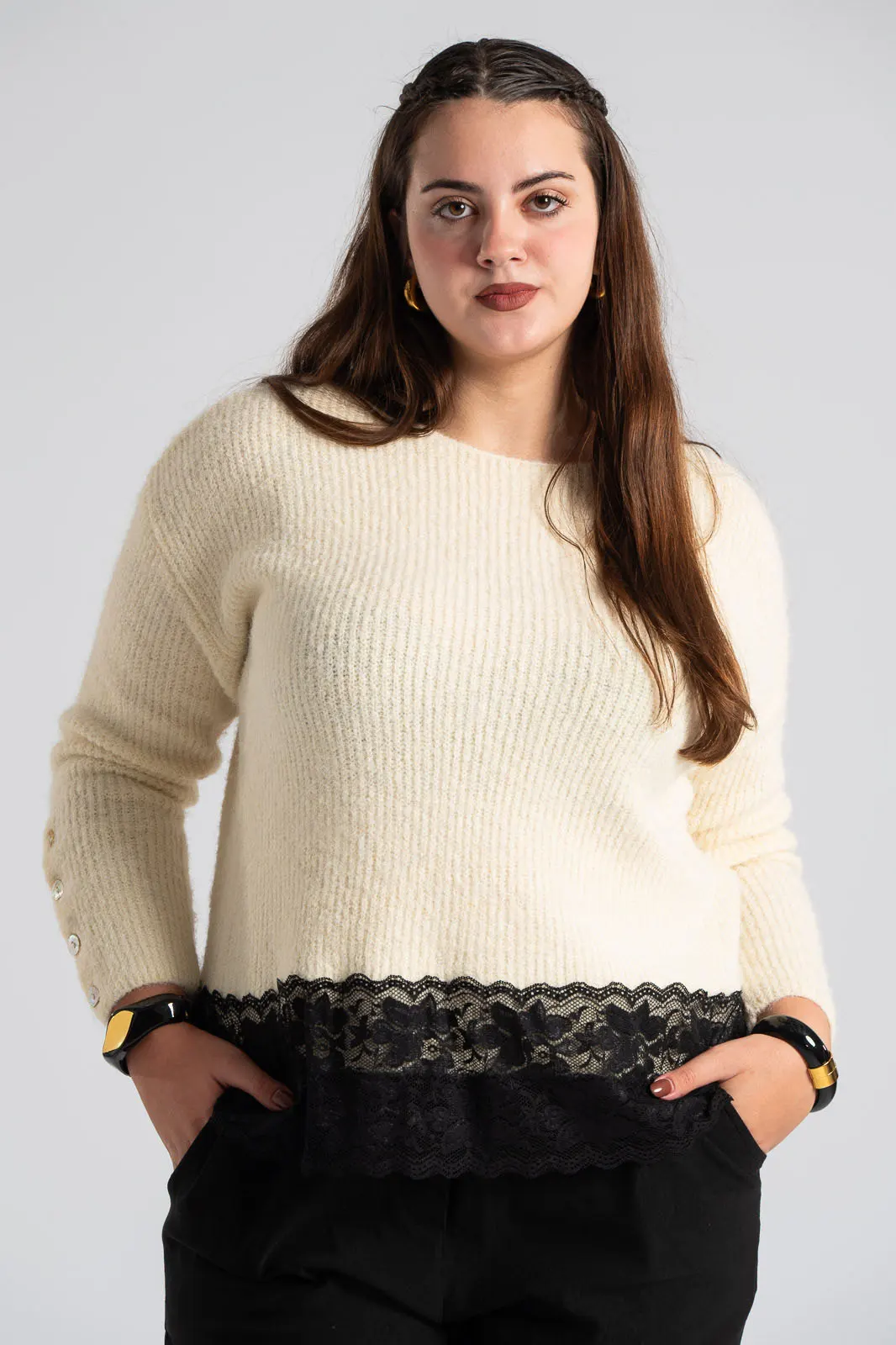 Μπλούζα με στρογγυλή λαιμόκοψη και μακριά μανίκια που διαθέτουν κουμπιά σε ύφος φίλντισι. Σε όλη την επιφάνεια διαθέτει πλέξη και στο τελείωμα καταλήγει σε διακοσμητική δαντέλα. Οι μετρήσεις του πίνακα είναι αντιπροσωπευτικές για κάθε κωδικό. 49% polyester, 20% polyamide, 20% acrylic, 8% wool, 3% elastan.