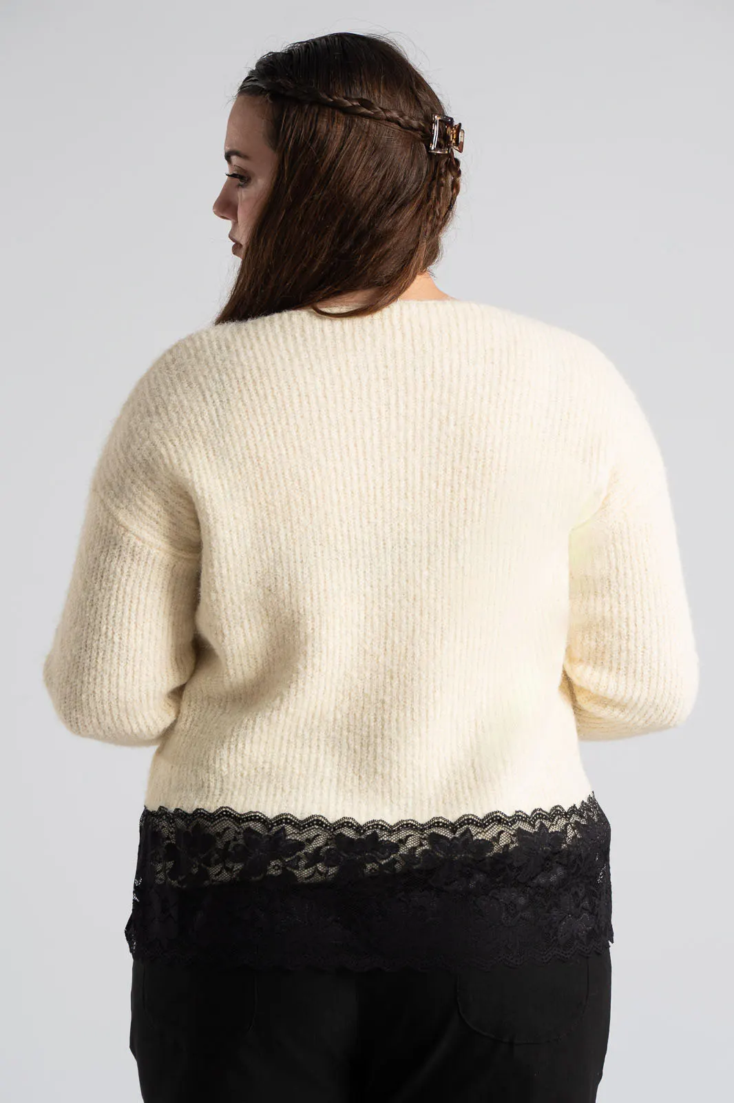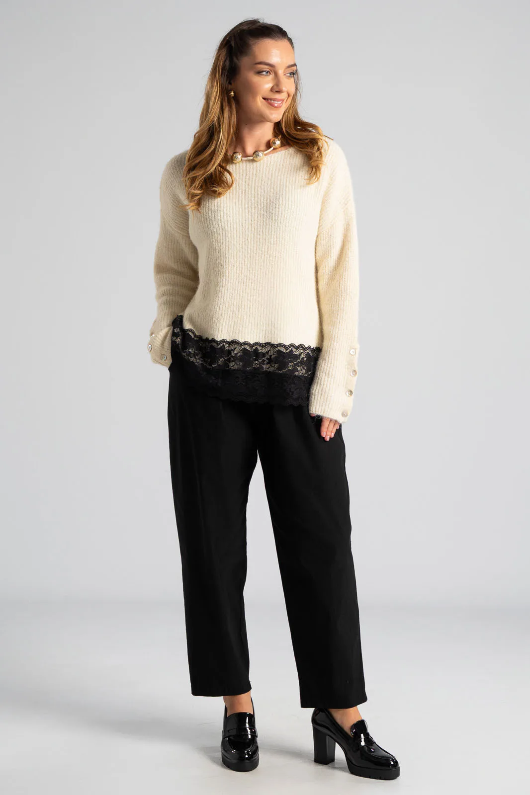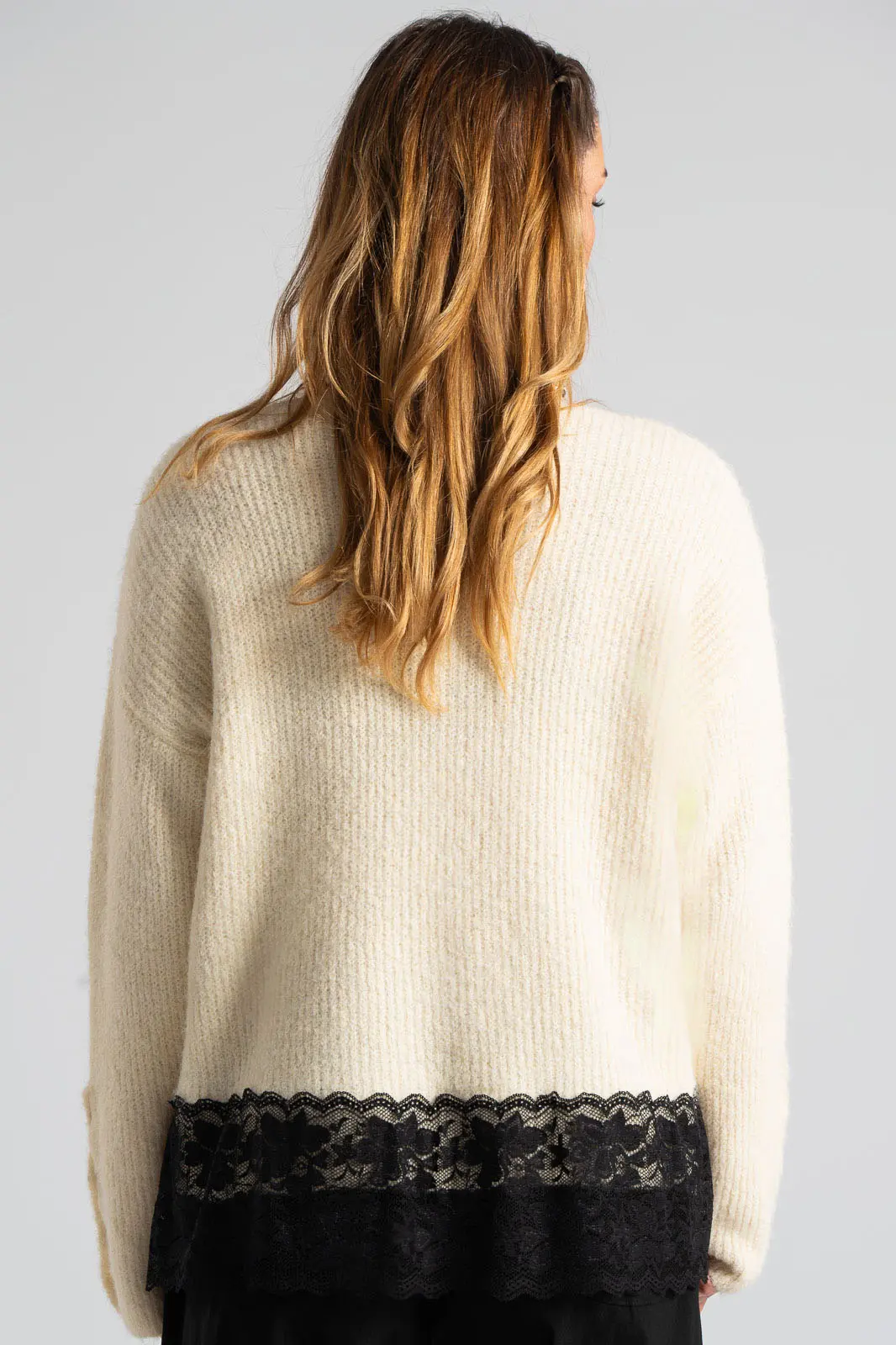 Μπλούζα με στρογγυλή λαιμόκοψη και μακριά μανίκια που διαθέτουν κουμπιά σε ύφος φίλντισι. Σε όλη την επιφάνεια διαθέτει πλέξη και στο τελείωμα καταλήγει σε διακοσμητική δαντέλα. Οι μετρήσεις του πίνακα είναι αντιπροσωπευτικές για κάθε κωδικό. 49% polyester, 20% polyamide, 20% acrylic, 8% wool, 3% elastan.