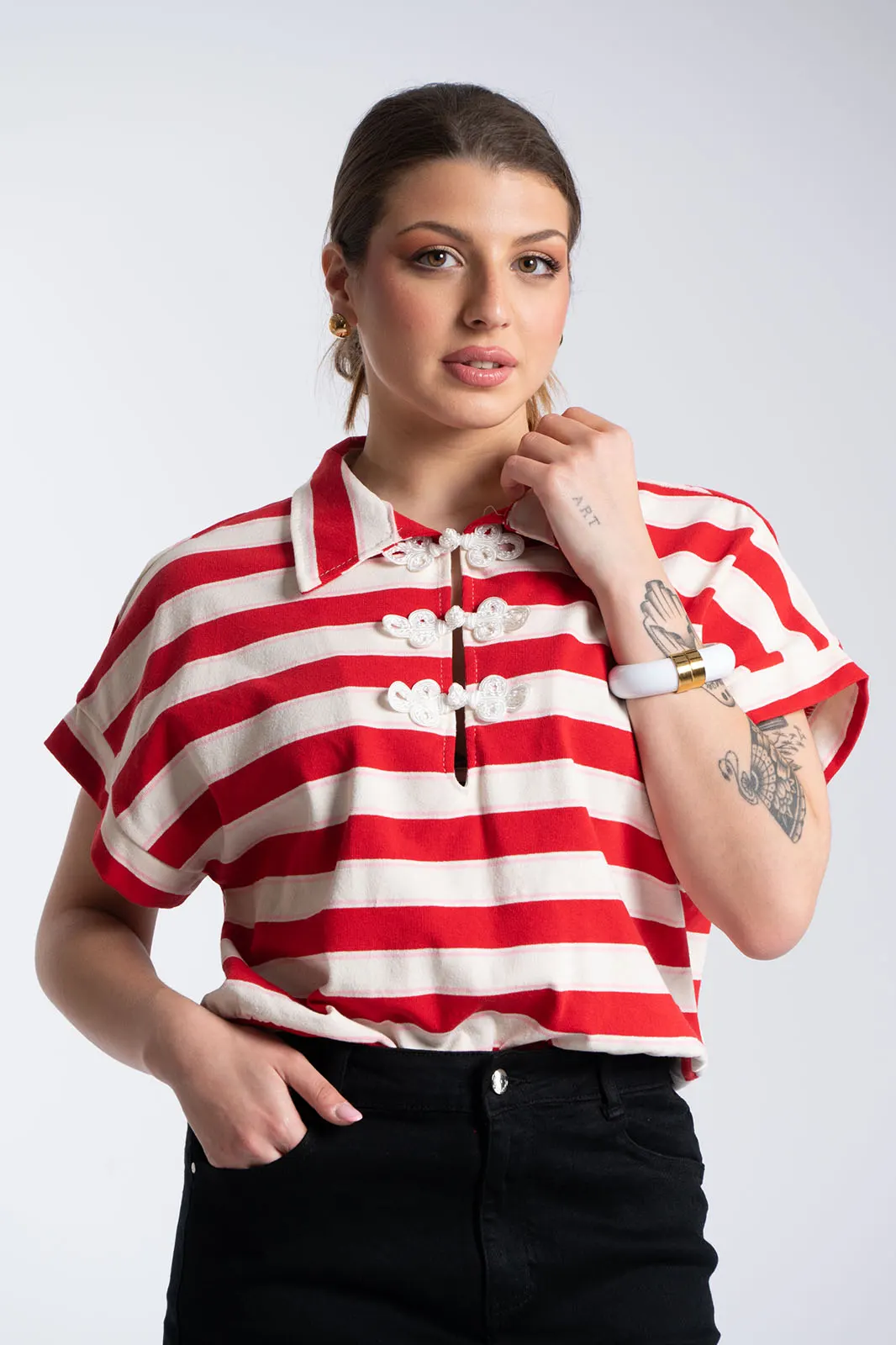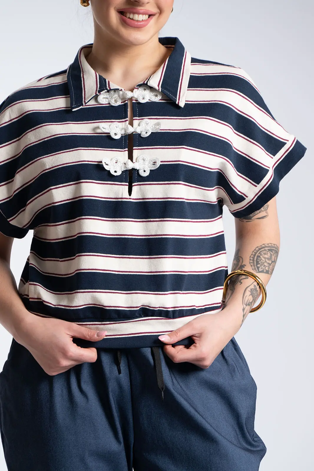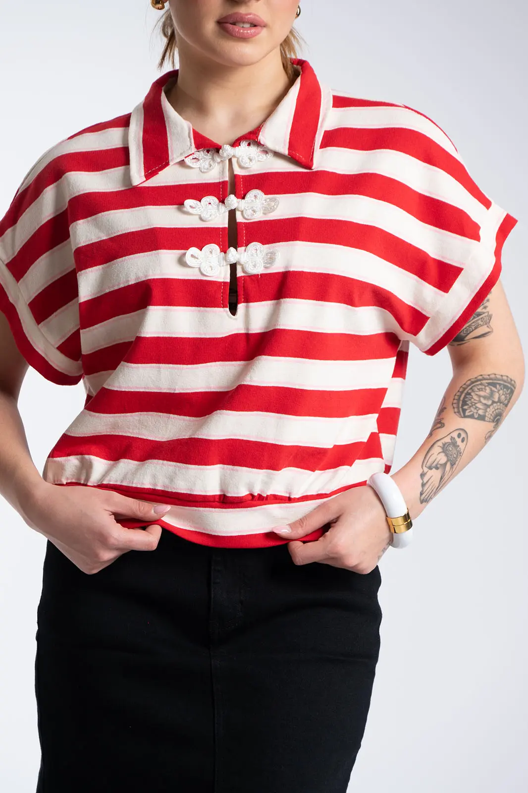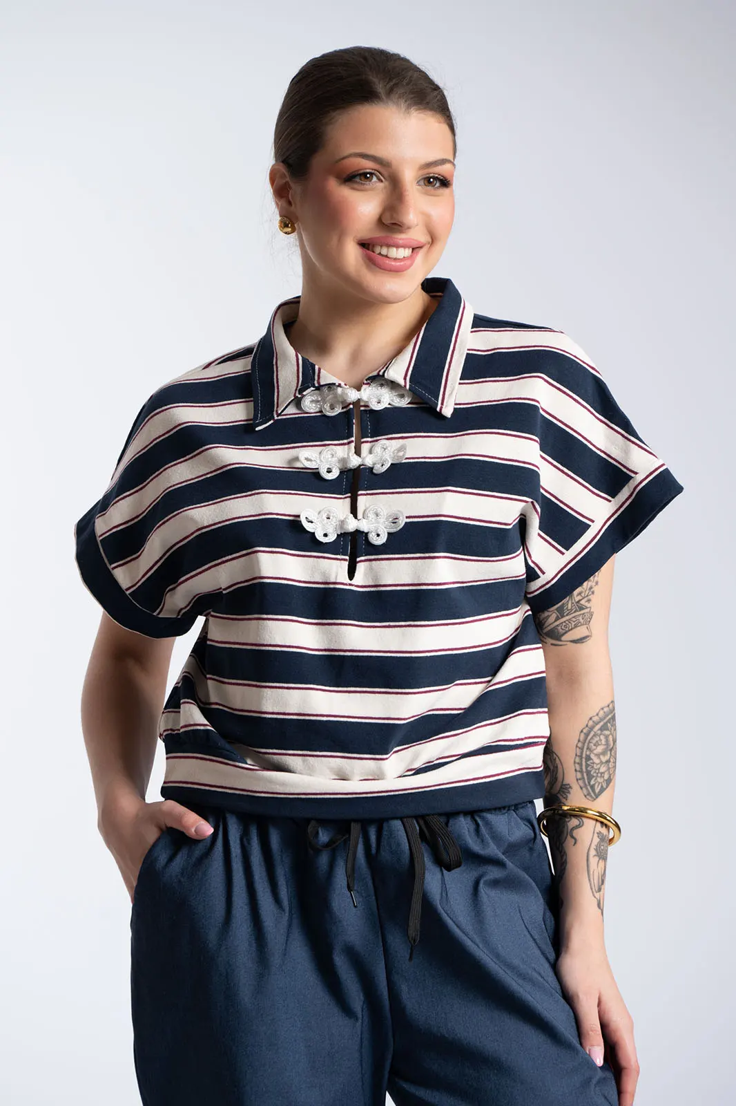Μοντέρνο ριγέ crop top με ιδιαίτερο χαρακτήρα και statement λεπτομέρειες. Διαθέτει γιακά και μπροστινό άνοιγμα με διακοσμητικά κουμπώματα τύπου κόμποι που χαρίζουν μοναδικό στυλ. Τα μανίκια είναι κοντά και άνετα, ενώ η ελαφρώς cropped γραμμή του αγκαλιάζει το σώμα και αναδεικνύει τη σιλουέτα. Ένα ξεχωριστό κομμάτι που συνδυάζει casual και fashion στοιχεία.