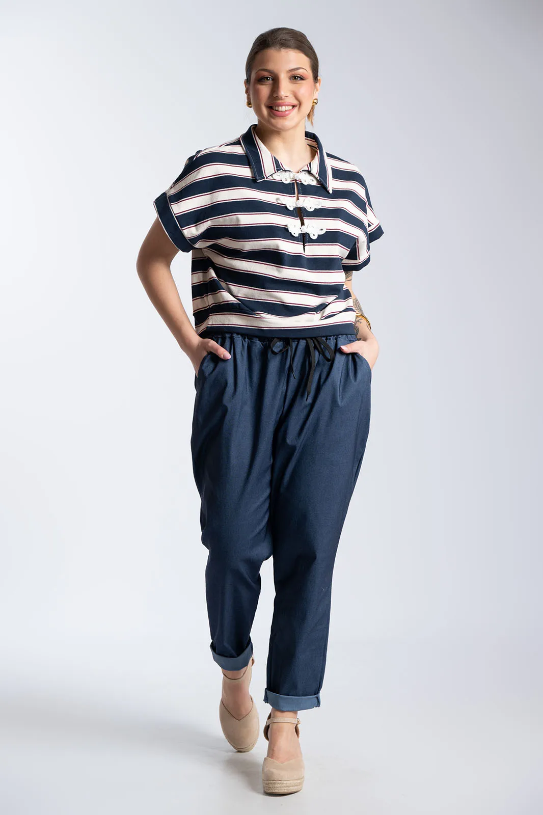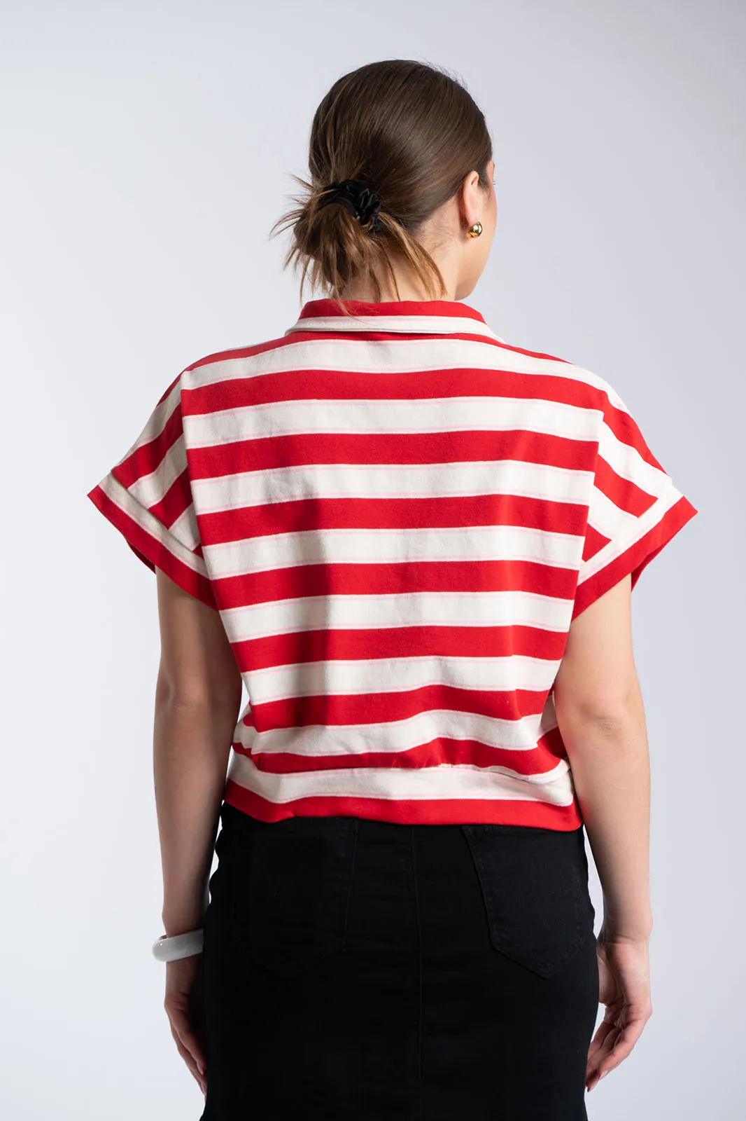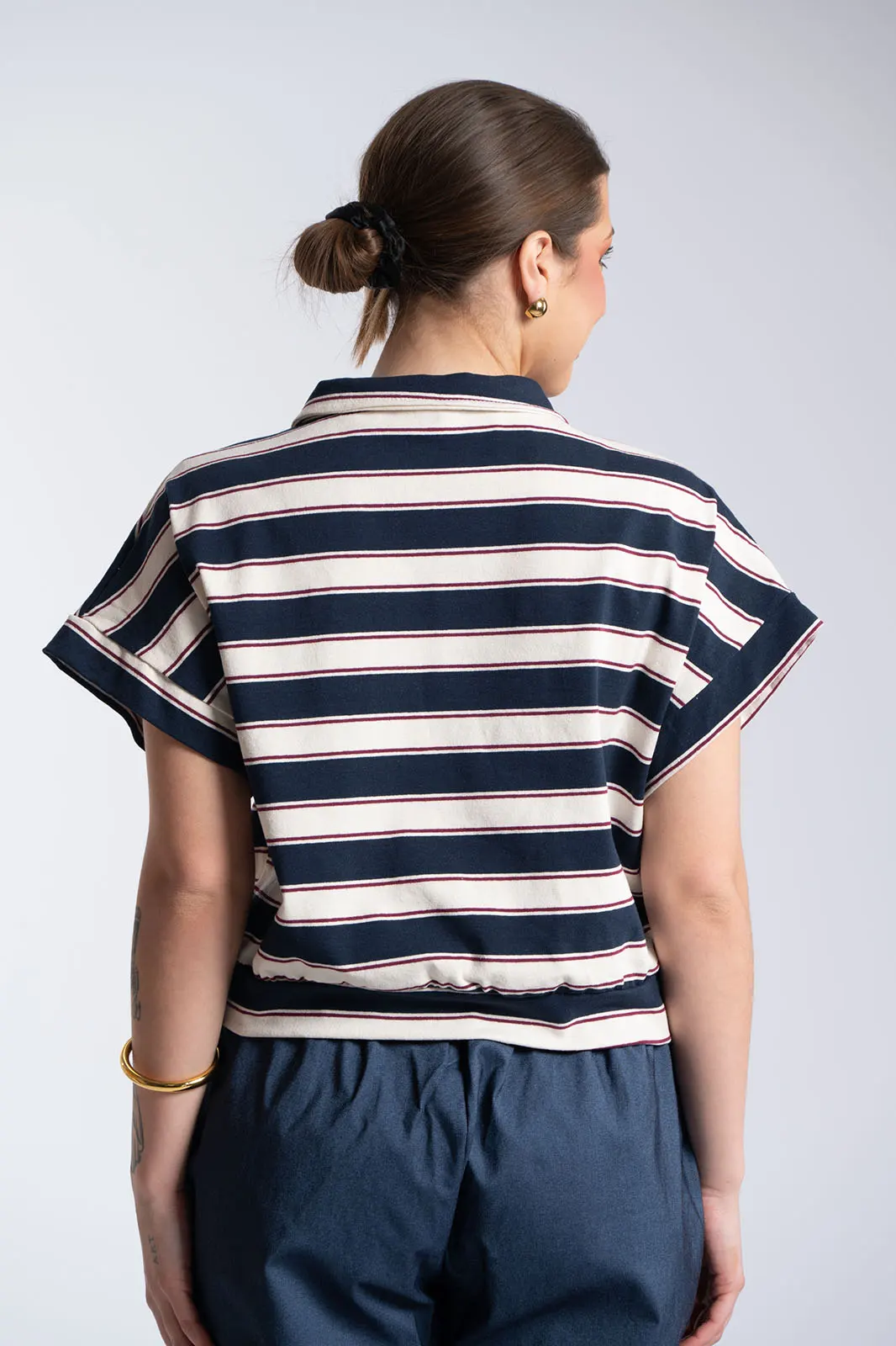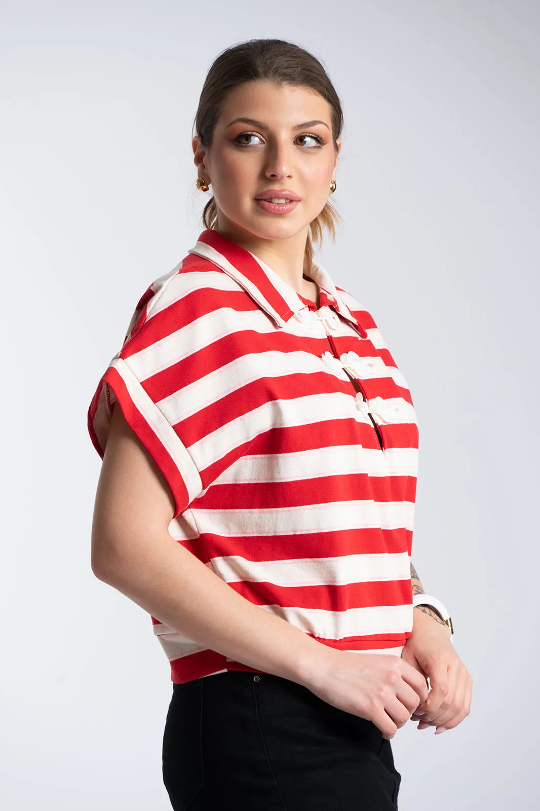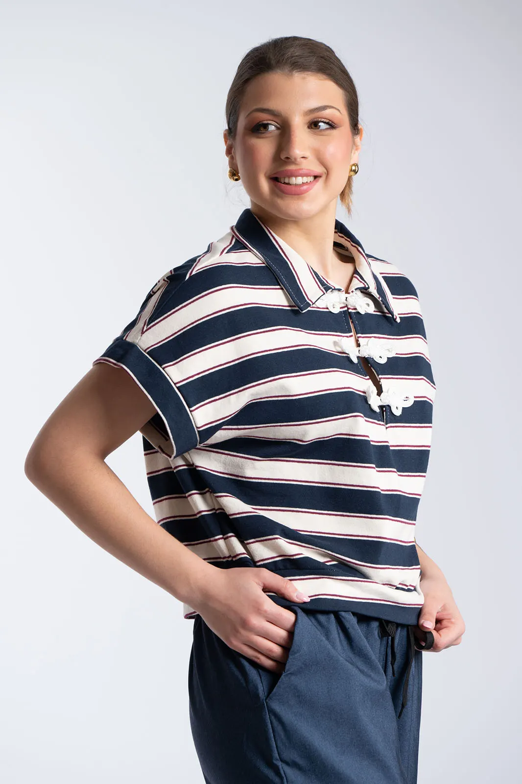 Μοντέρνο ριγέ crop top με ιδιαίτερο χαρακτήρα και statement λεπτομέρειες. Διαθέτει γιακά και μπροστινό άνοιγμα με διακοσμητικά κουμπώματα τύπου κόμποι που χαρίζουν μοναδικό στυλ. Τα μανίκια είναι κοντά και άνετα, ενώ η ελαφρώς cropped γραμμή του αγκαλιάζει το σώμα και αναδεικνύει τη σιλουέτα. Ένα ξεχωριστό κομμάτι που συνδυάζει casual και fashion στοιχεία.