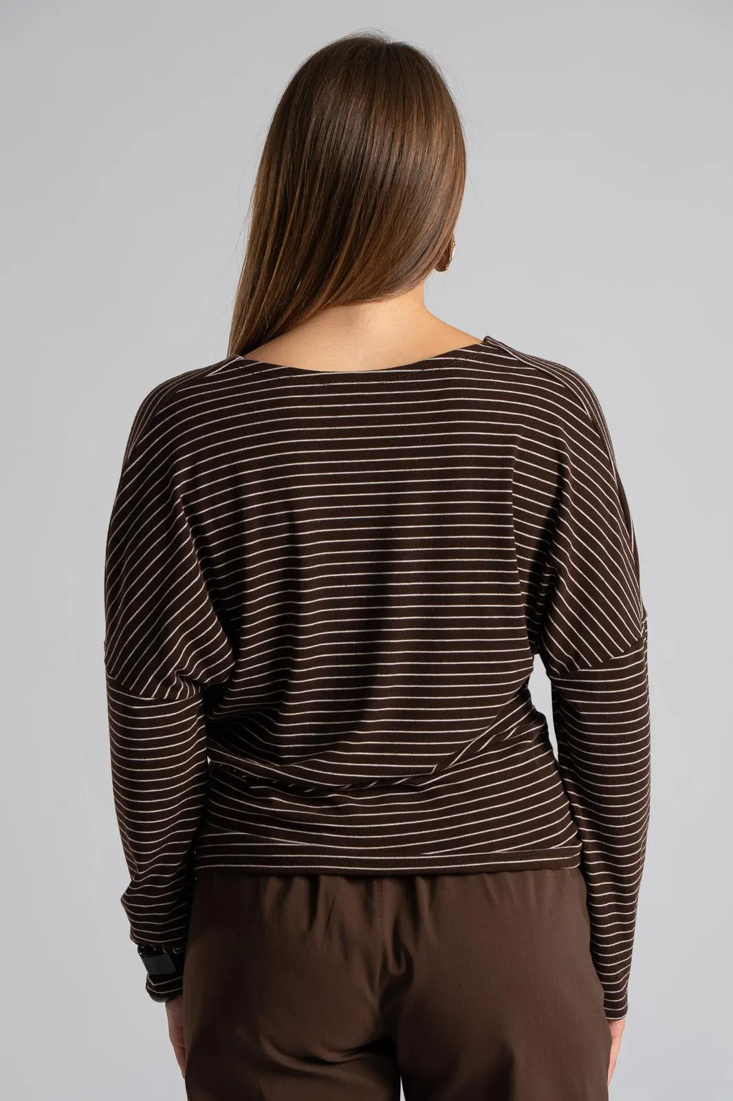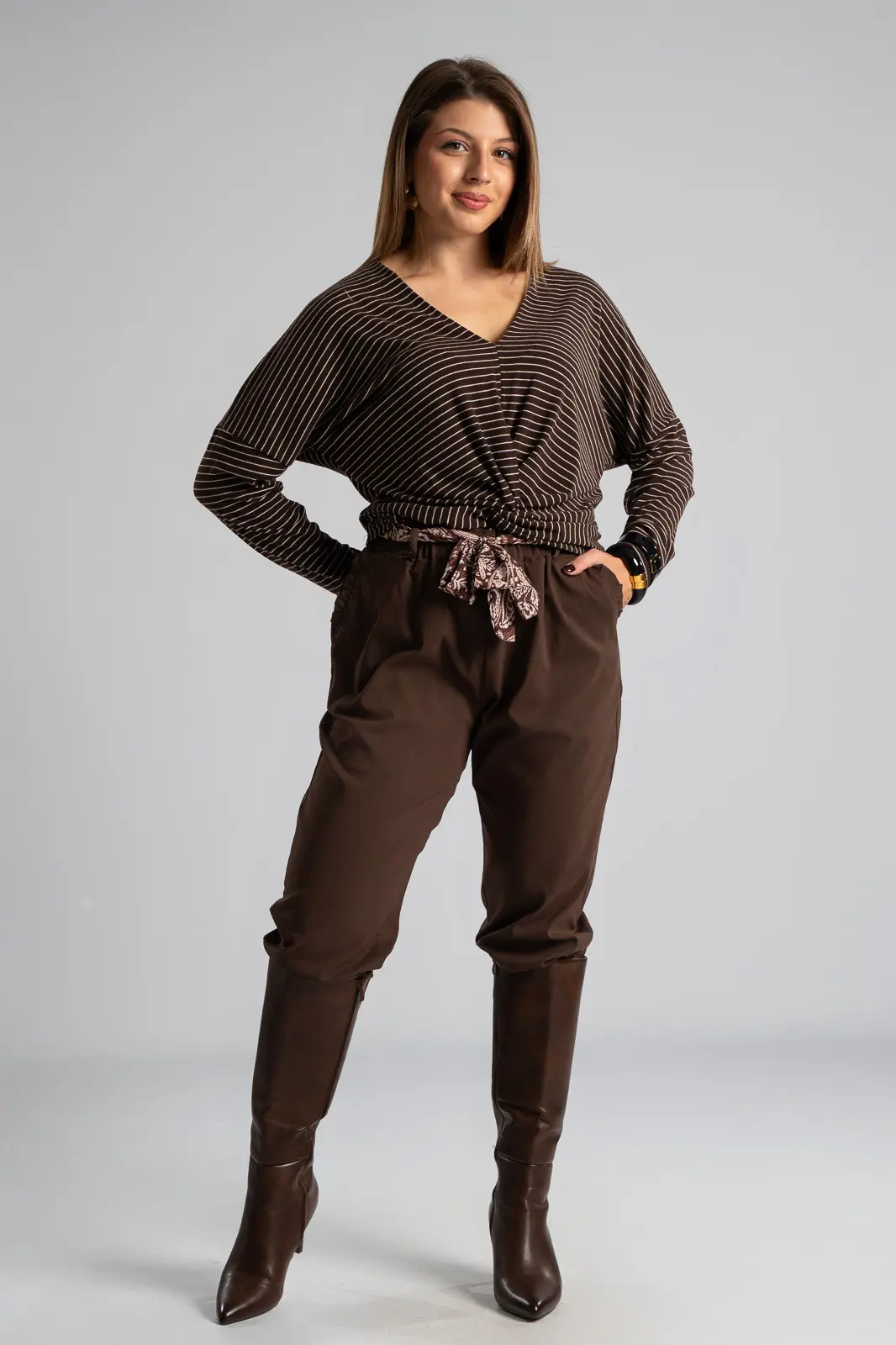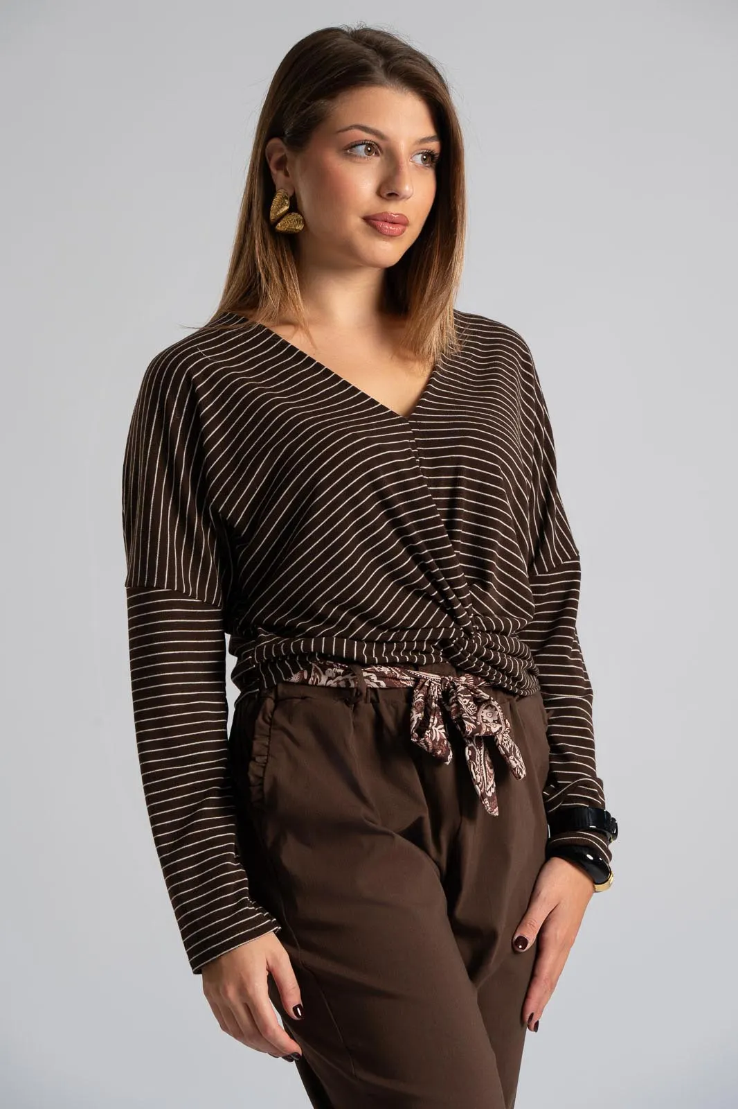 Blouse with thread knit and V-neck opening. It has long sleeves. There is a hem at the front. The back is slightly longer. There are stripes across the entire surface. The measurements in the table are representative for each code. 30% viscose, 65% polyester, 5% elastane.