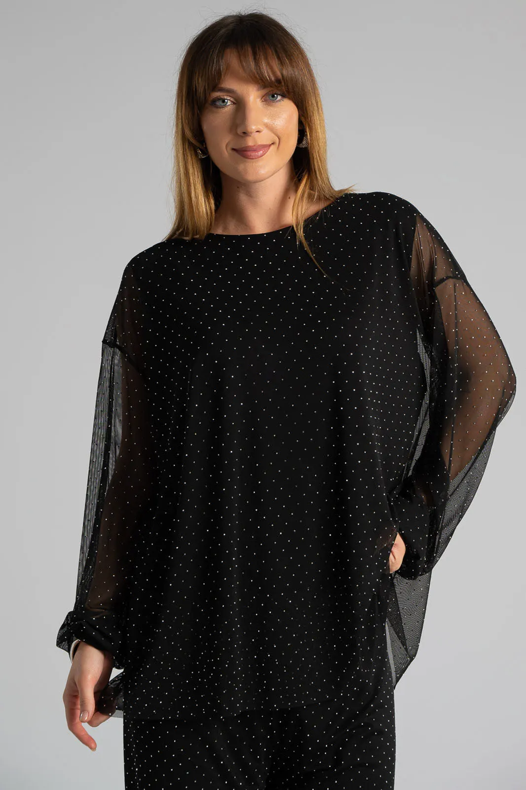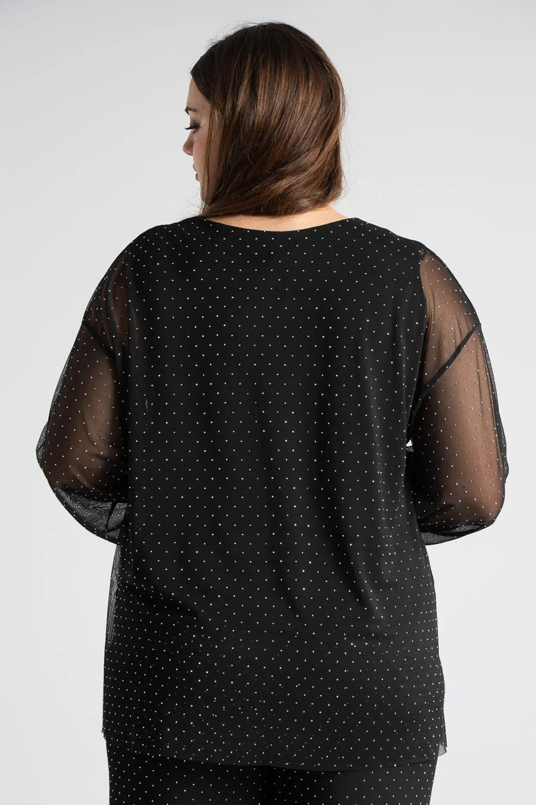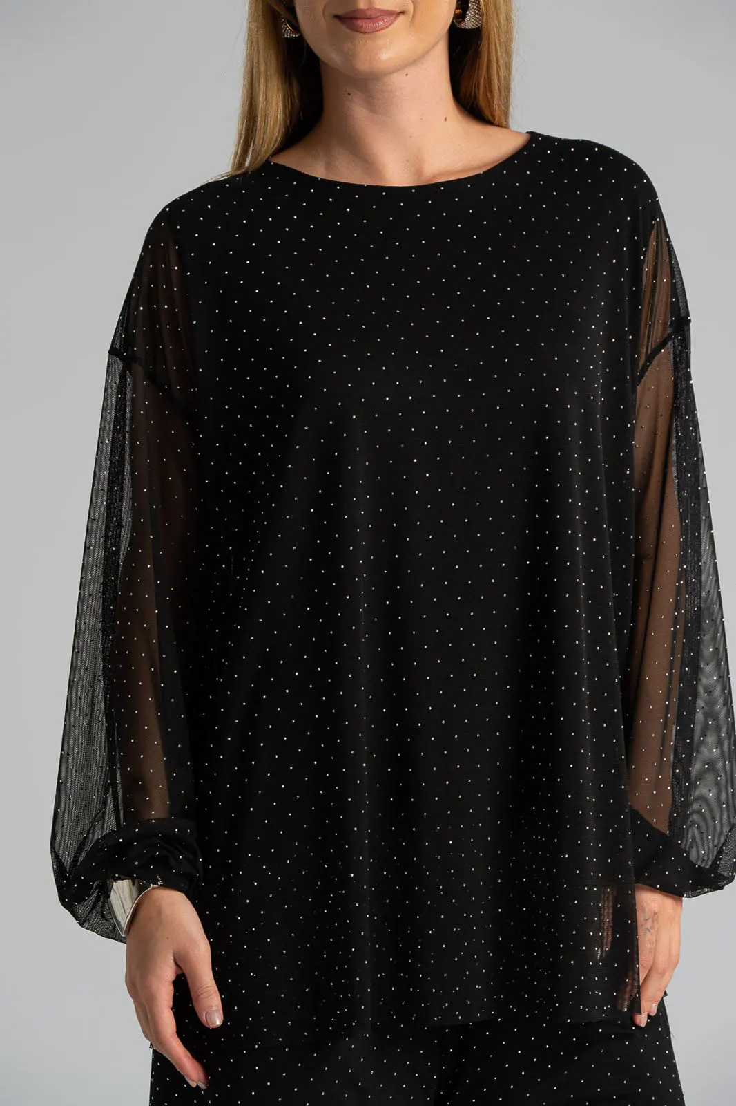 Μπλούζα με τούλινη διαφάνεια. Έχει στρογγυλή λαιμόκοψη και μακριά μανίκια. Εσωτερικά διαθέτει επένδυση. Σε όλη την επιφάνεια της έχει διακοσμητικά τρουξ. Οι μετρήσεις του πίνακα είναι αντιπροσωπευτικές για κάθε προϊόν. 95% polyester, 5% elastan (επένδυση 95% viscose, 5% elastan)