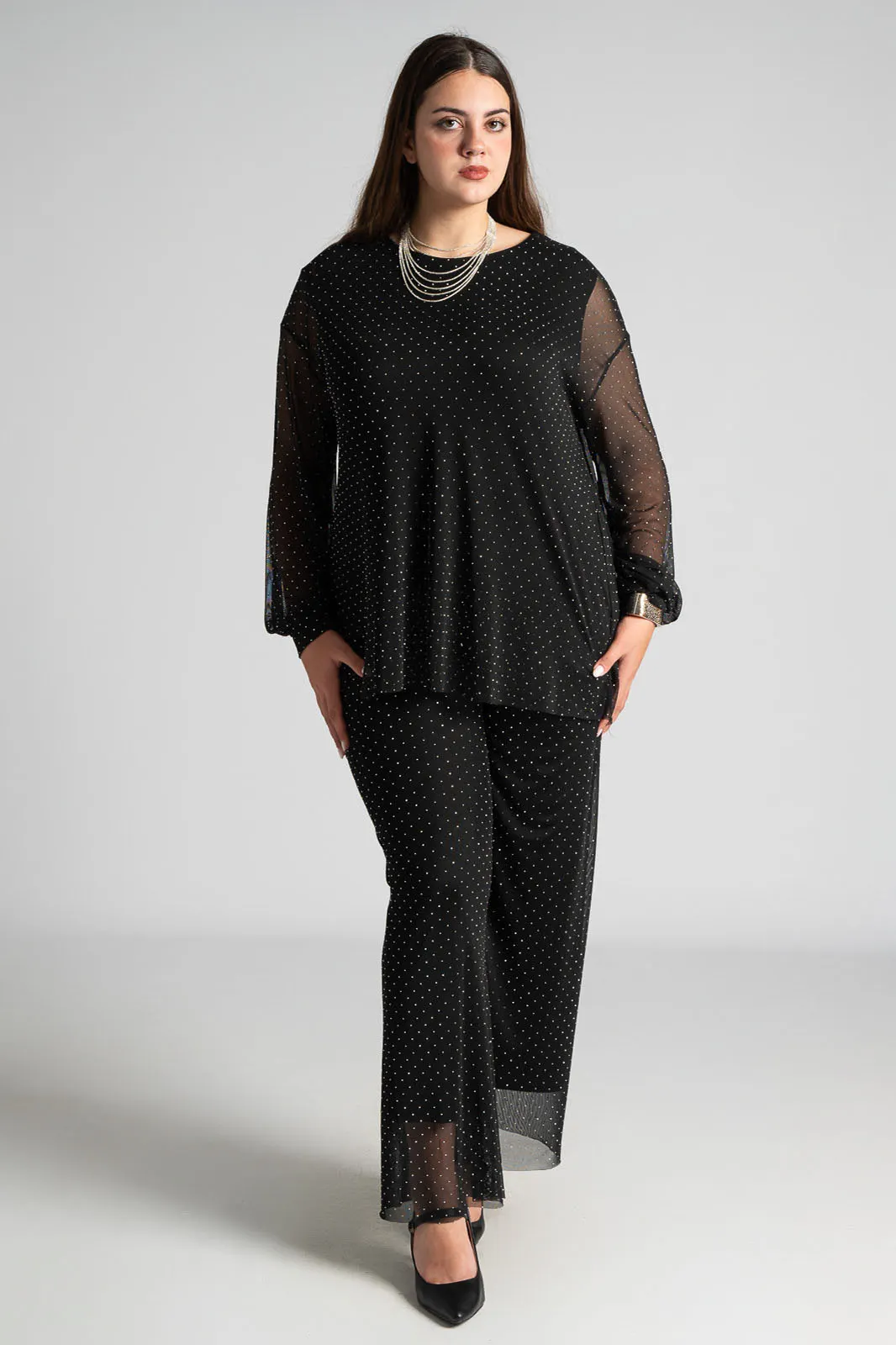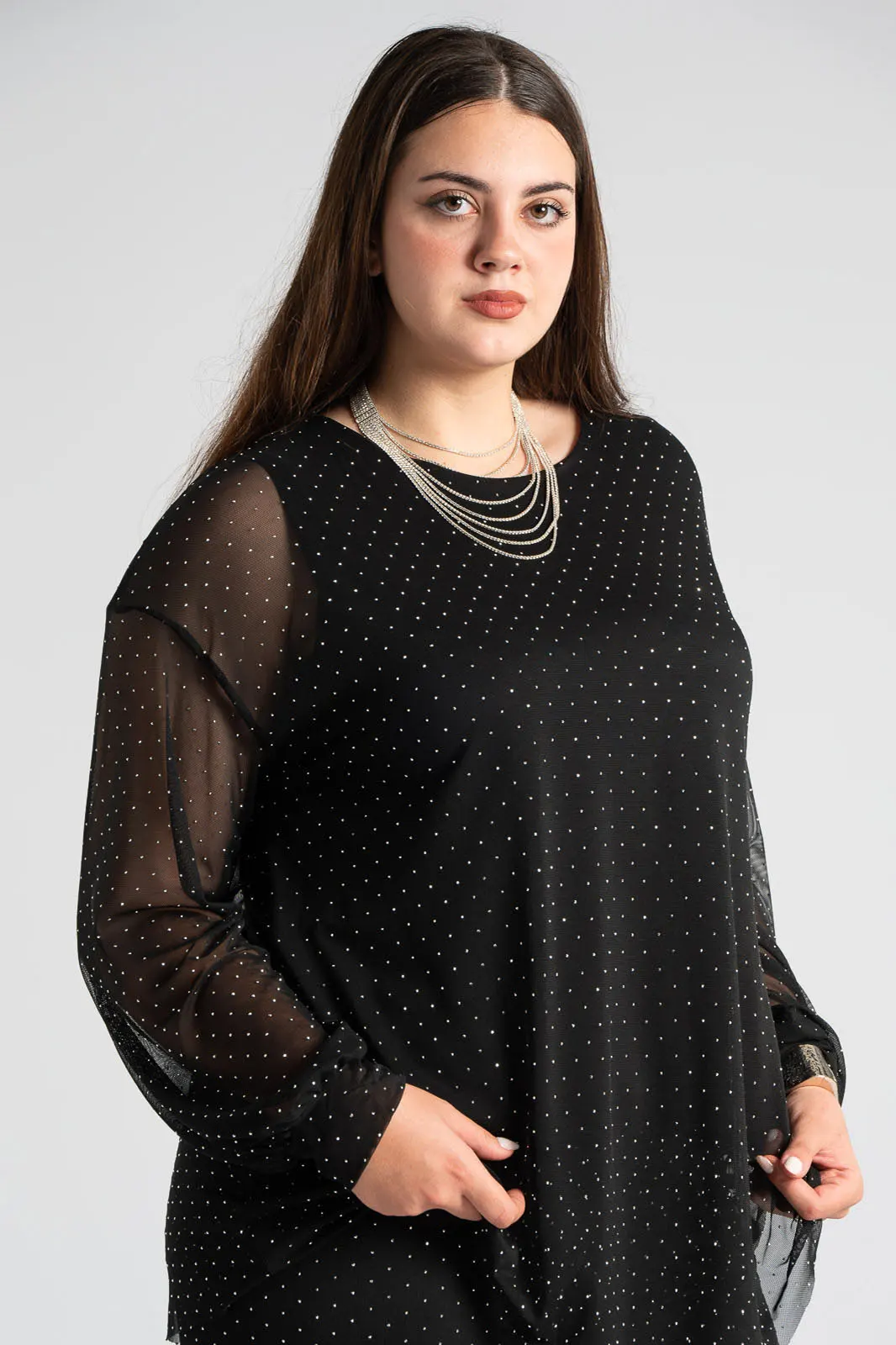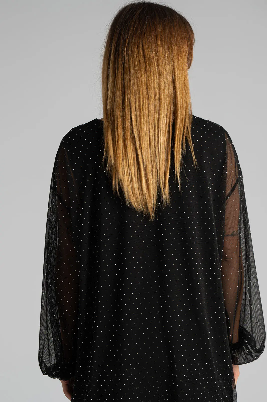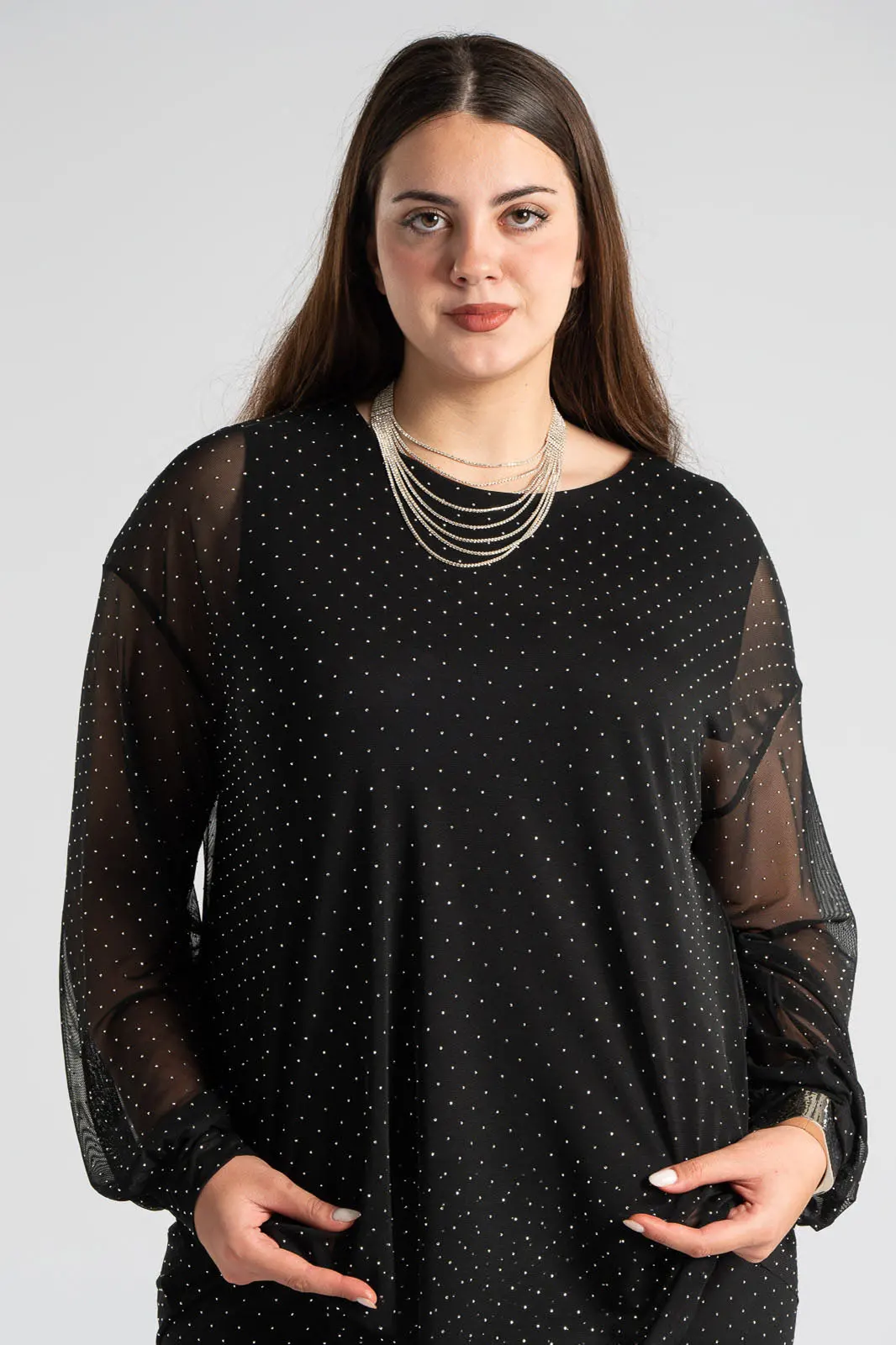 Μπλούζα με τούλινη διαφάνεια. Έχει στρογγυλή λαιμόκοψη και μακριά μανίκια. Εσωτερικά διαθέτει επένδυση. Σε όλη την επιφάνεια της έχει διακοσμητικά τρουξ. Οι μετρήσεις του πίνακα είναι αντιπροσωπευτικές για κάθε προϊόν. 95% polyester, 5% elastan (επένδυση 95% viscose, 5% elastan)