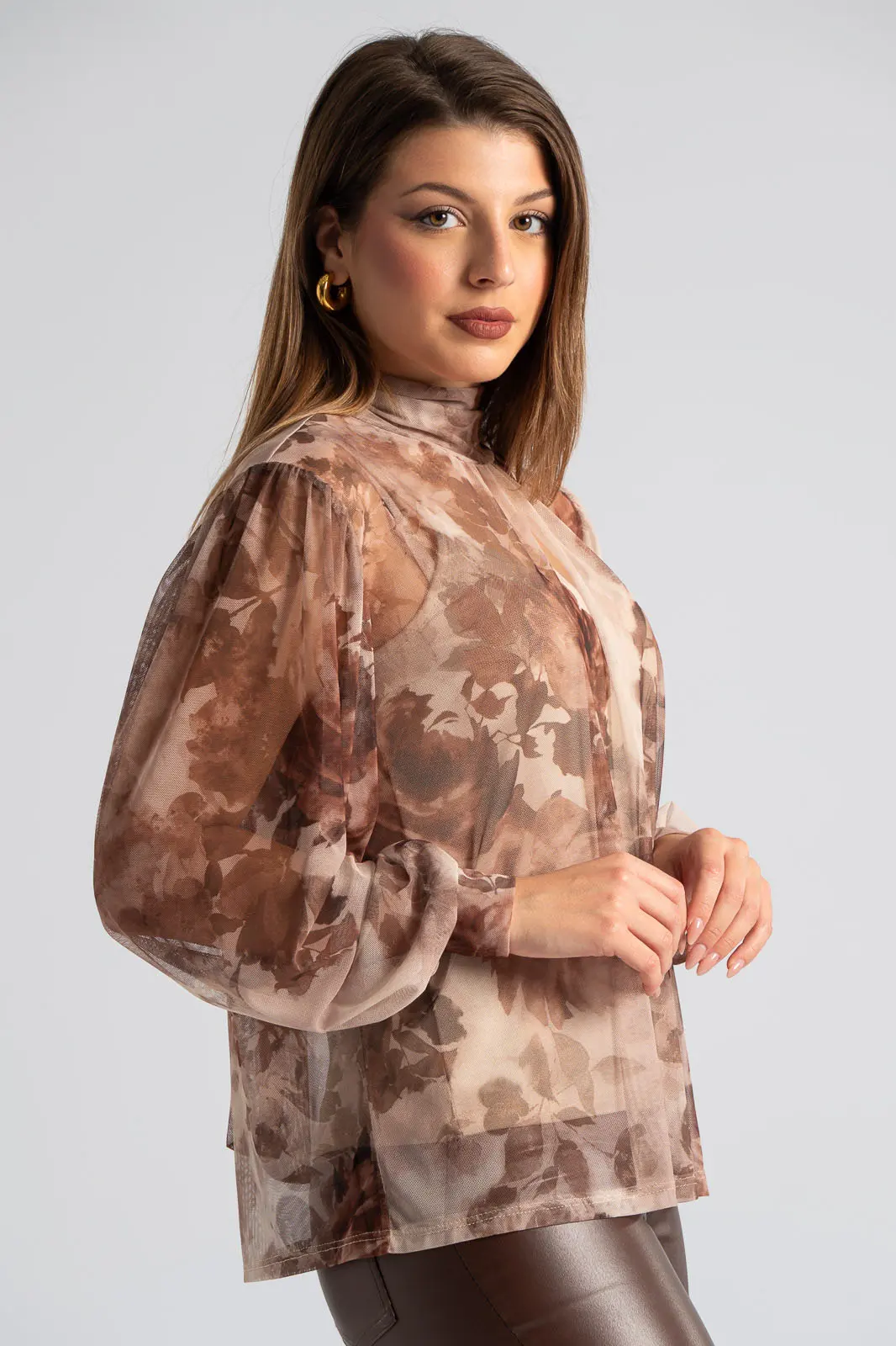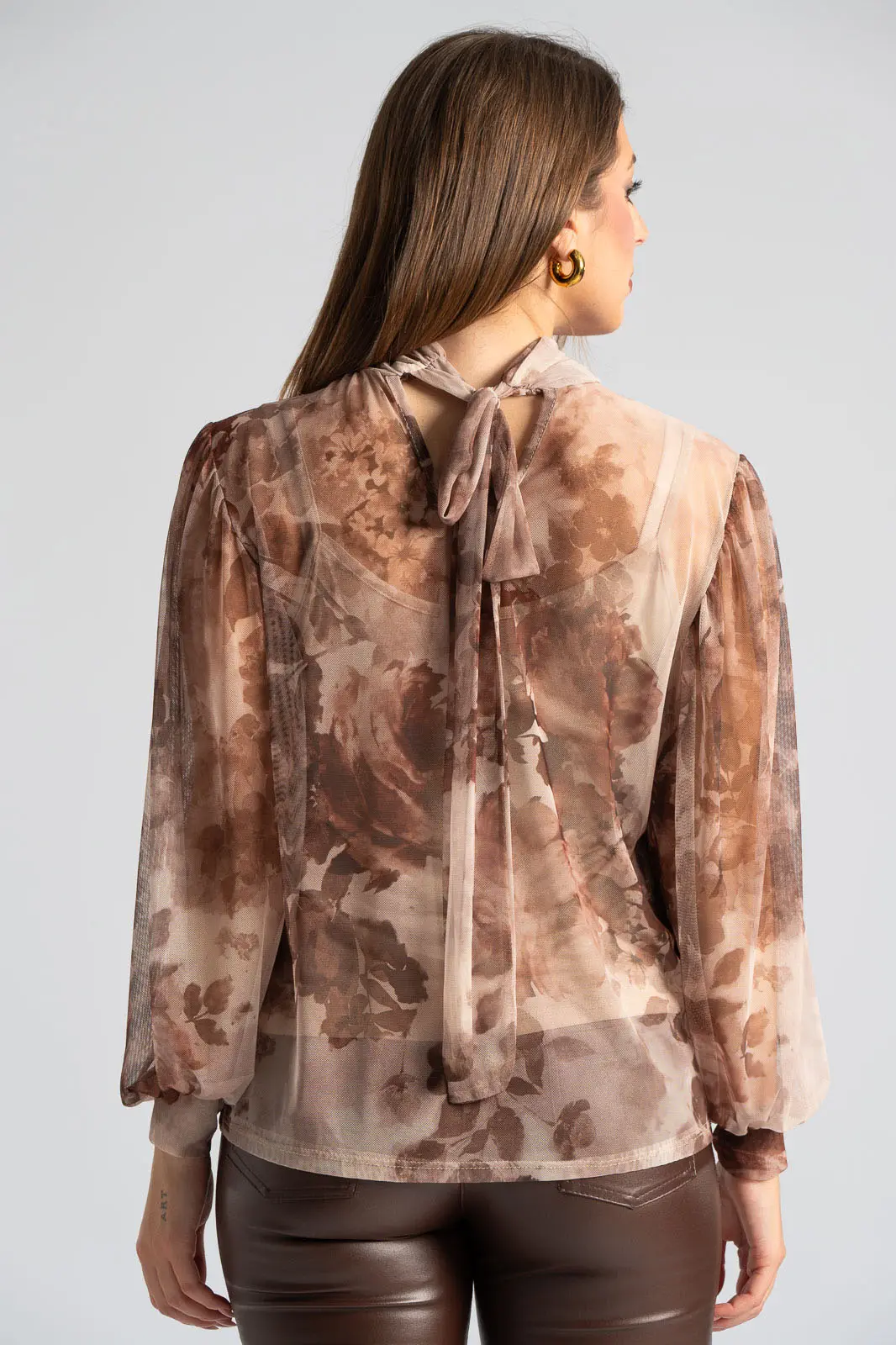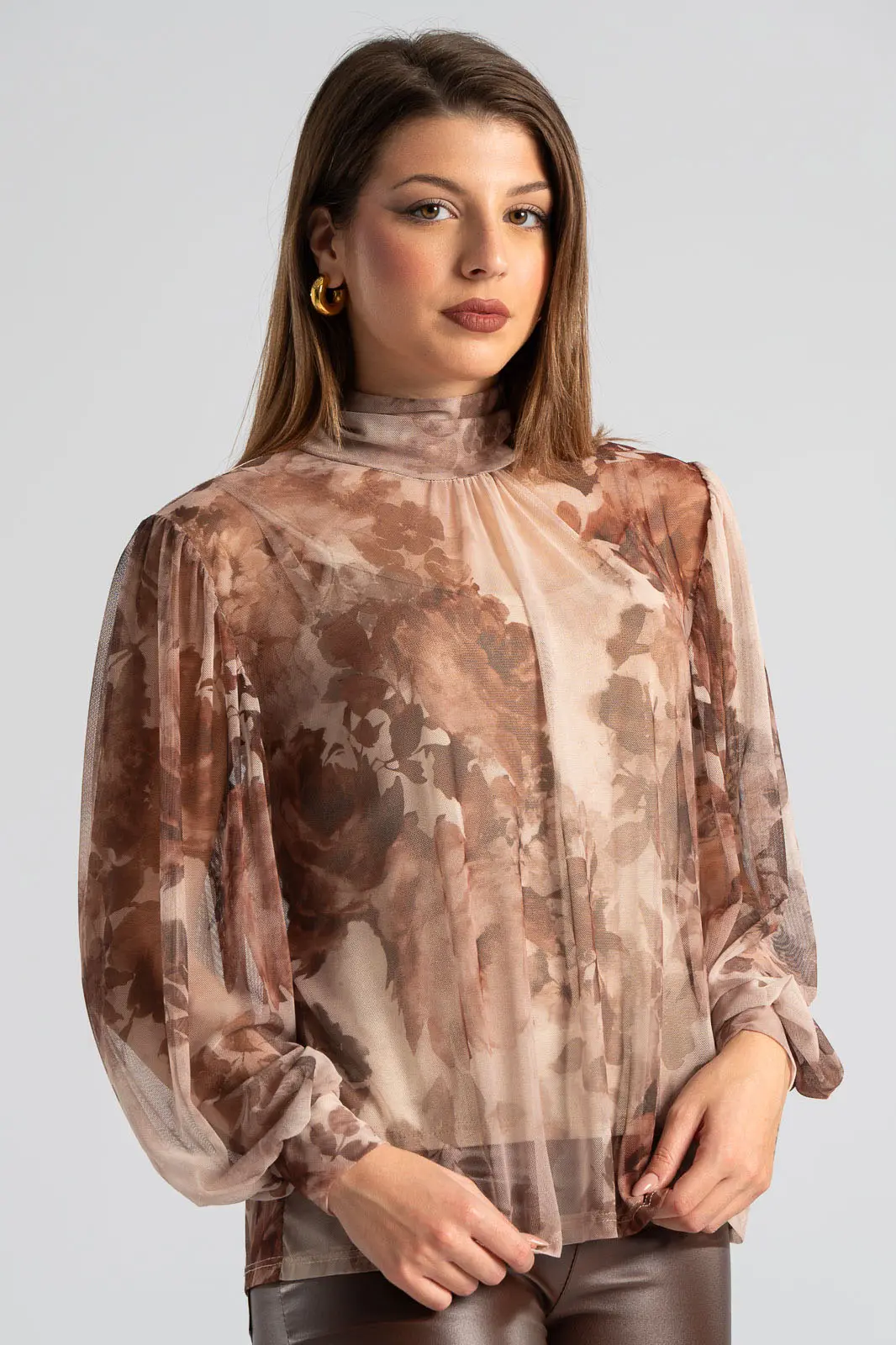 Μπλούζα με τούλινη διαφάνεια σε floral μοτίβο. Έχει ψηλή λαιμόκοψη και κλείνει με φιόγκο και μακριά μανίκια. Εσωτερικά διαθέτει μπλούζα με λεπτές τιράντες με στρογγυλή λαιμόκοψη. Οι μετρήσεις του πίνακα είναι αντιπροσωπευτικές για κάθε κωδικό. 95% polyester, 5% elastan (εσωτερικό τοπ 100% viscose).