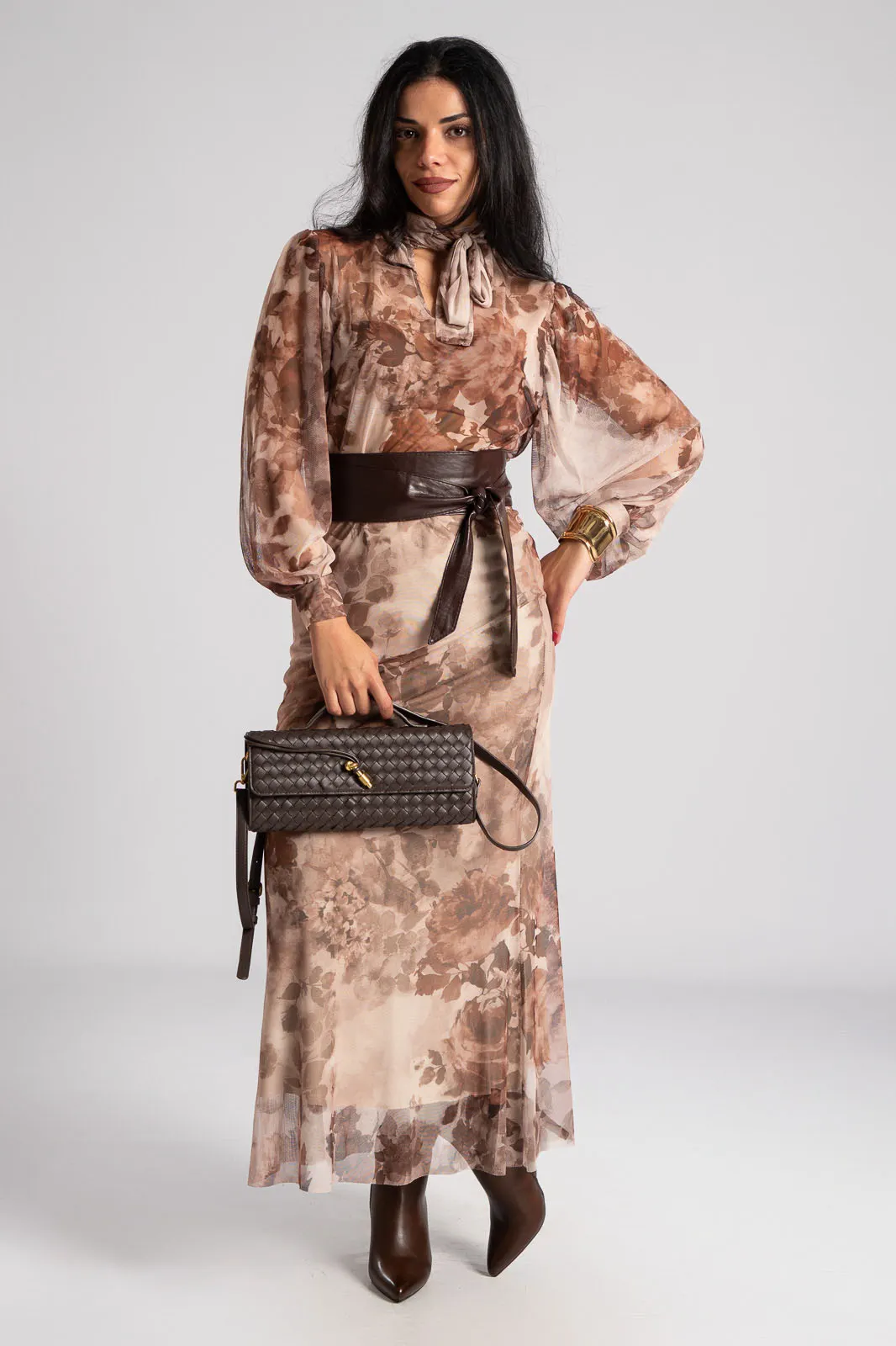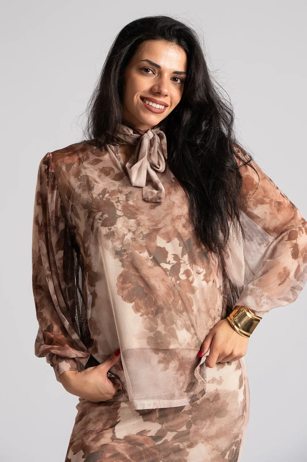 Blouse with sheer tulle in a floral pattern. It has a high neckline and closes with a bow and long sleeves. Inside, it has a blouse with thin straps and a round neckline. The measurements in the table are representative for each code. 95% polyester, 5% elastane (inner top 100% viscose).