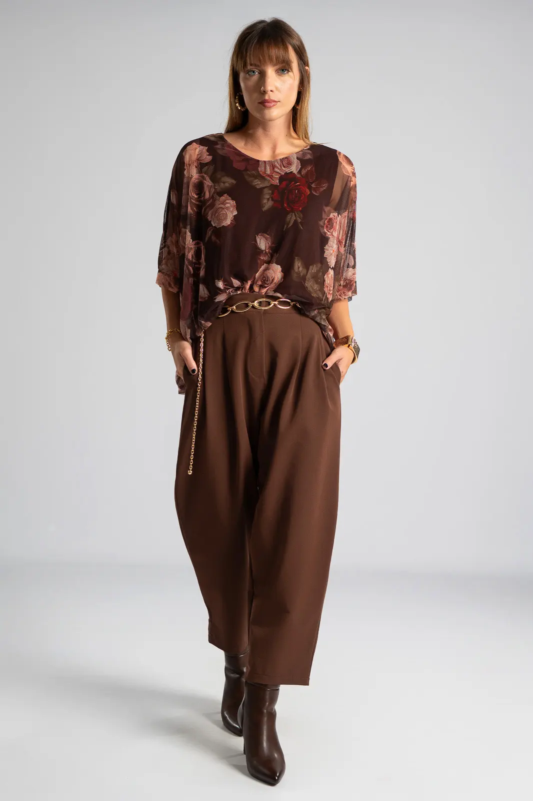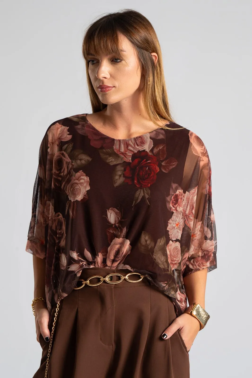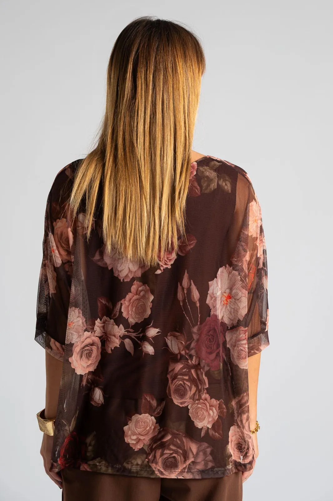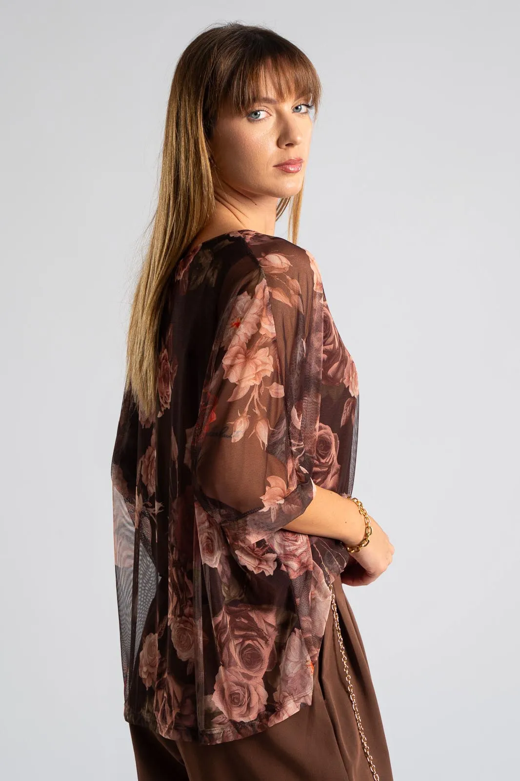 Μπλούζα με στρογγυλή λαιμόκοψη. Διαθέτει μανίκια 3/4 σε ύφος νυχτερίδας. Σε όλη την επιφάνεια είναι c-throu και εσωτερικά είναι φοδραρισμένη. Διαθέτει floral print. Οι μετρήσεις του πίνακα είναι αντιπροσωπευτικές για κάθε κωδικό. Φόδρα: 95% viscose, 5% elastan. 100% polyester.