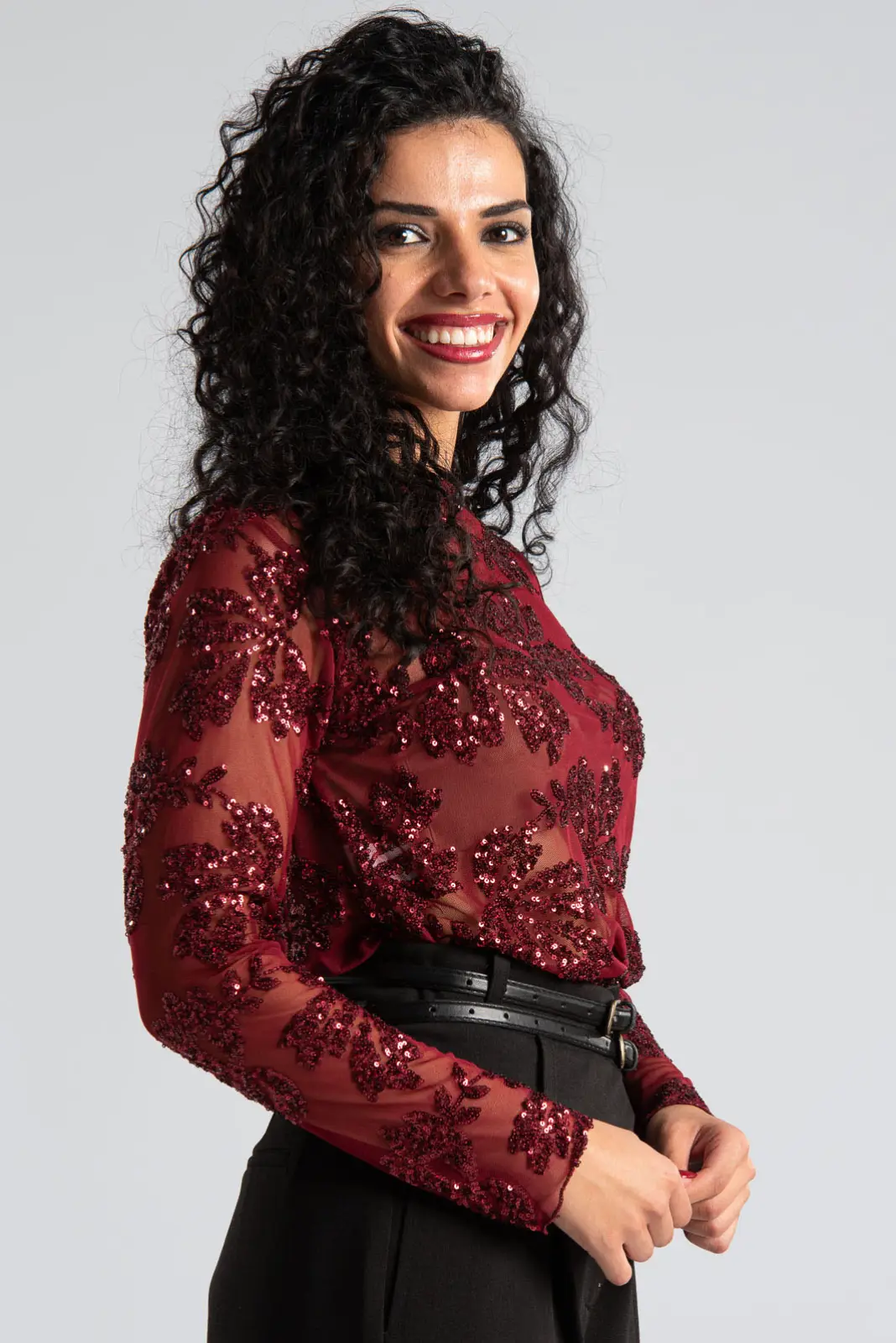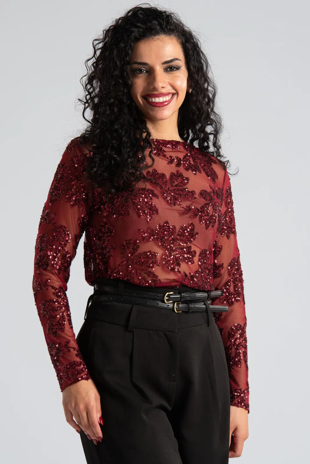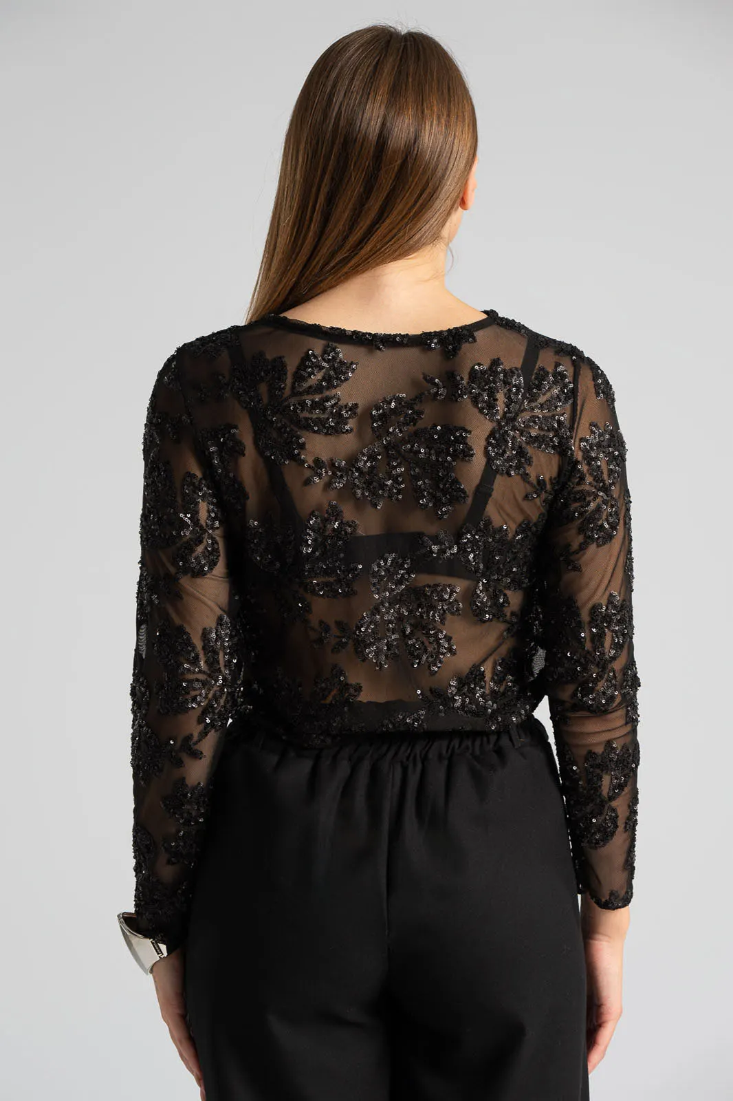 Blouse with round neckline. It has long sleeves. It is made entirely of tulle and has decorative leaf-shaped sequins. The measurements in the table are representative for each product. 100% polyester.