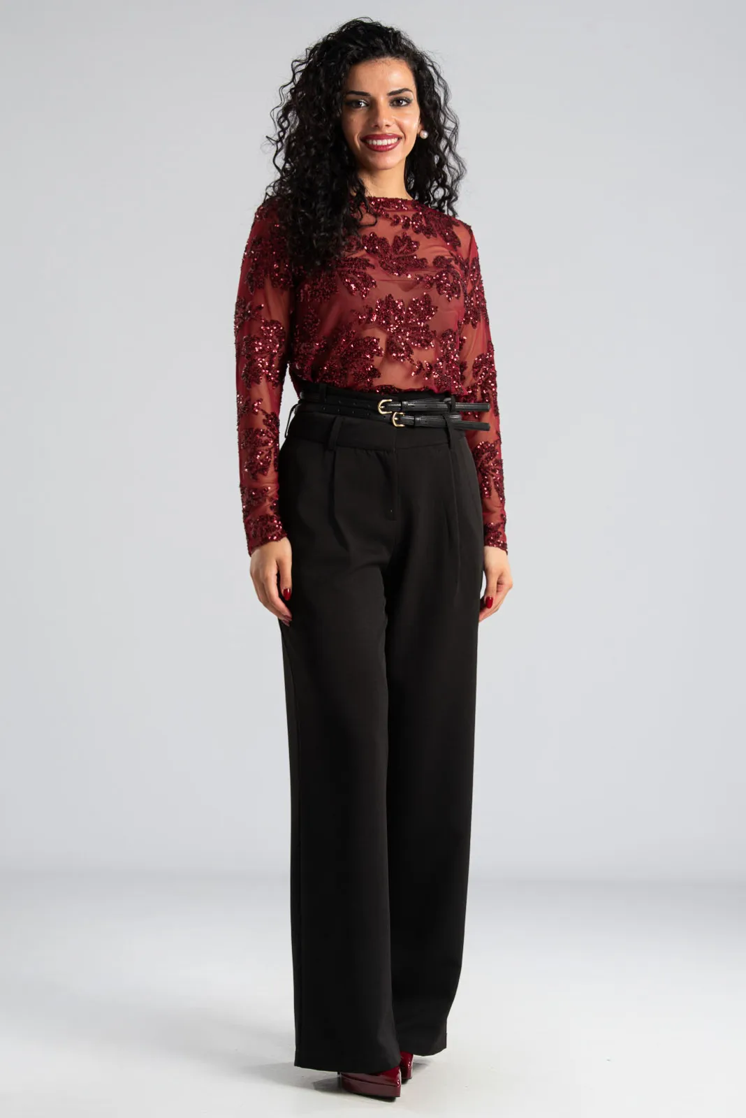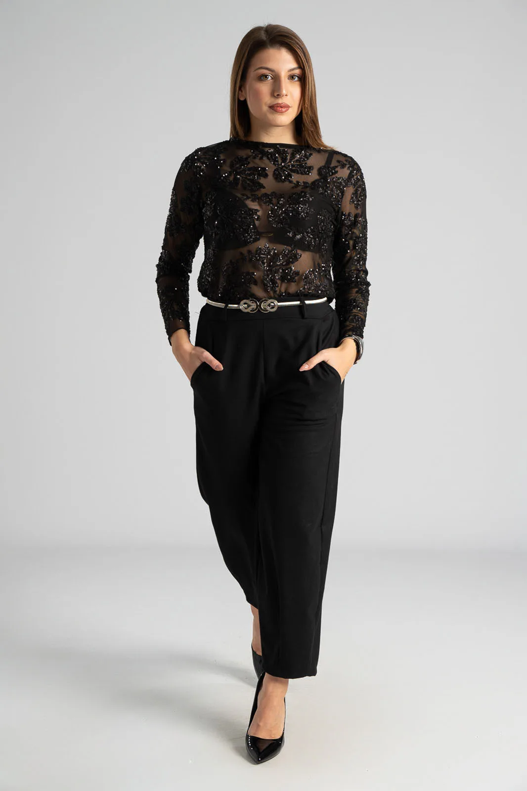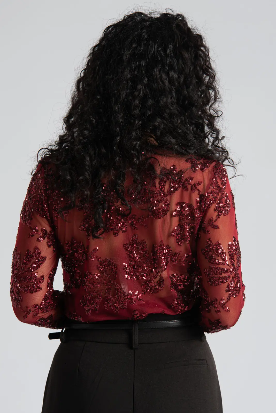 Blouse with round neckline. It has long sleeves. It is made entirely of tulle and has decorative leaf-shaped sequins. The measurements in the table are representative for each product. 100% polyester.
