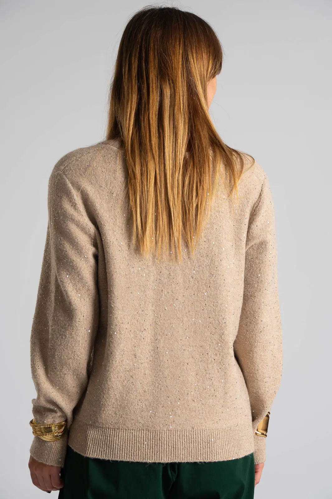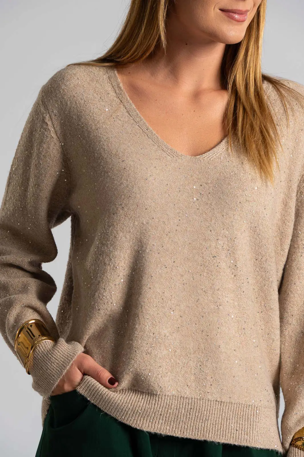 Blouse with V-neckline. It has long sleeves that end in ribbed fabric. It has silver thread and decorative small sequins all over the surface. The measurements in the table are representative of each product. 30% acrylic, 30% viscose, 20% modal, 20% elastane.