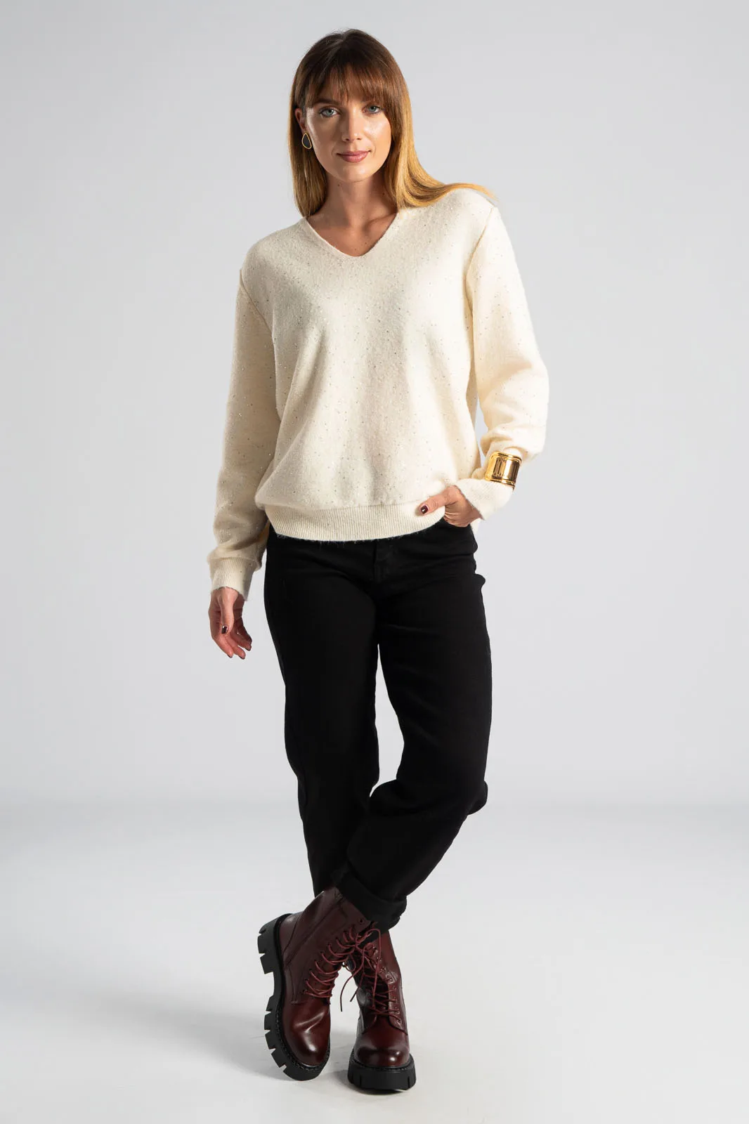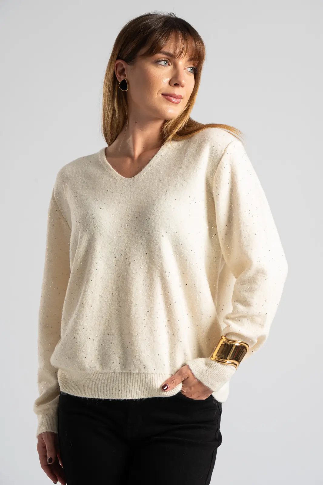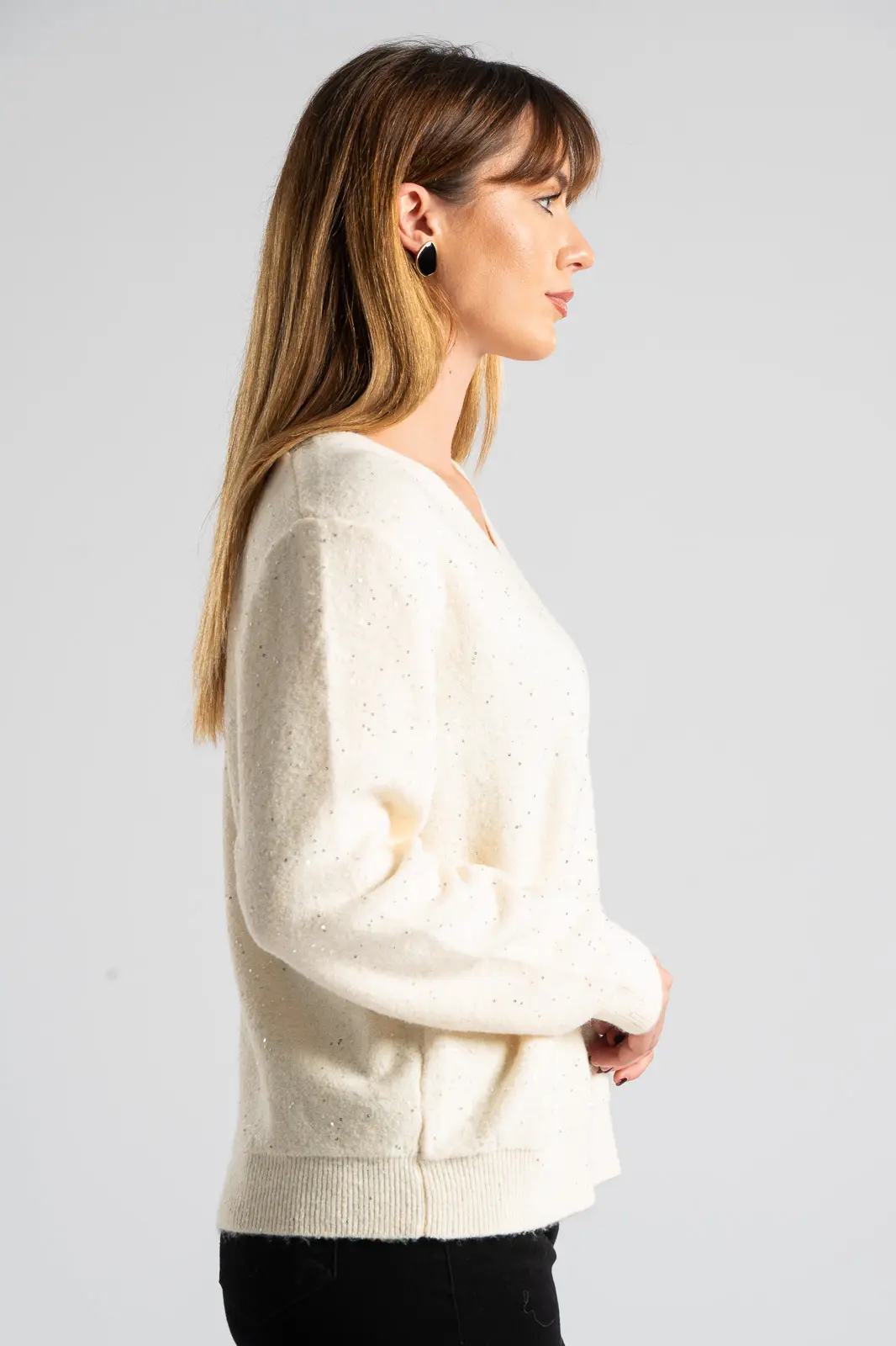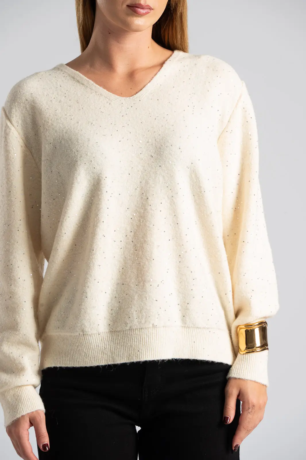 Μπλούζα με V άνοιγμα στη λαιμόκοψη. Διαθέτει μακριά μανίκια που καταλήγουν σε rib ύφανση. Σε όλη την επιφάνεια διαθέτει ασημοκλωστή και διακοσμητκές μικρές παγιέτες. Οι μετρήσεις του πίνακα είναι αντιπροσωπευτικές για κάθε προϊόν. 30% acrylic, 30% viscose, 20% modal,20% elastan.