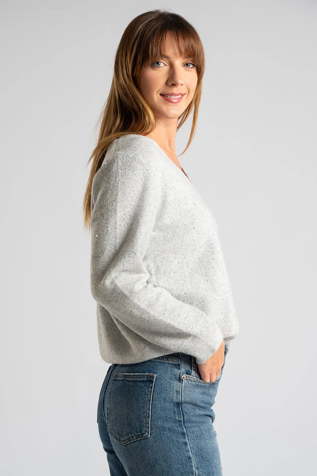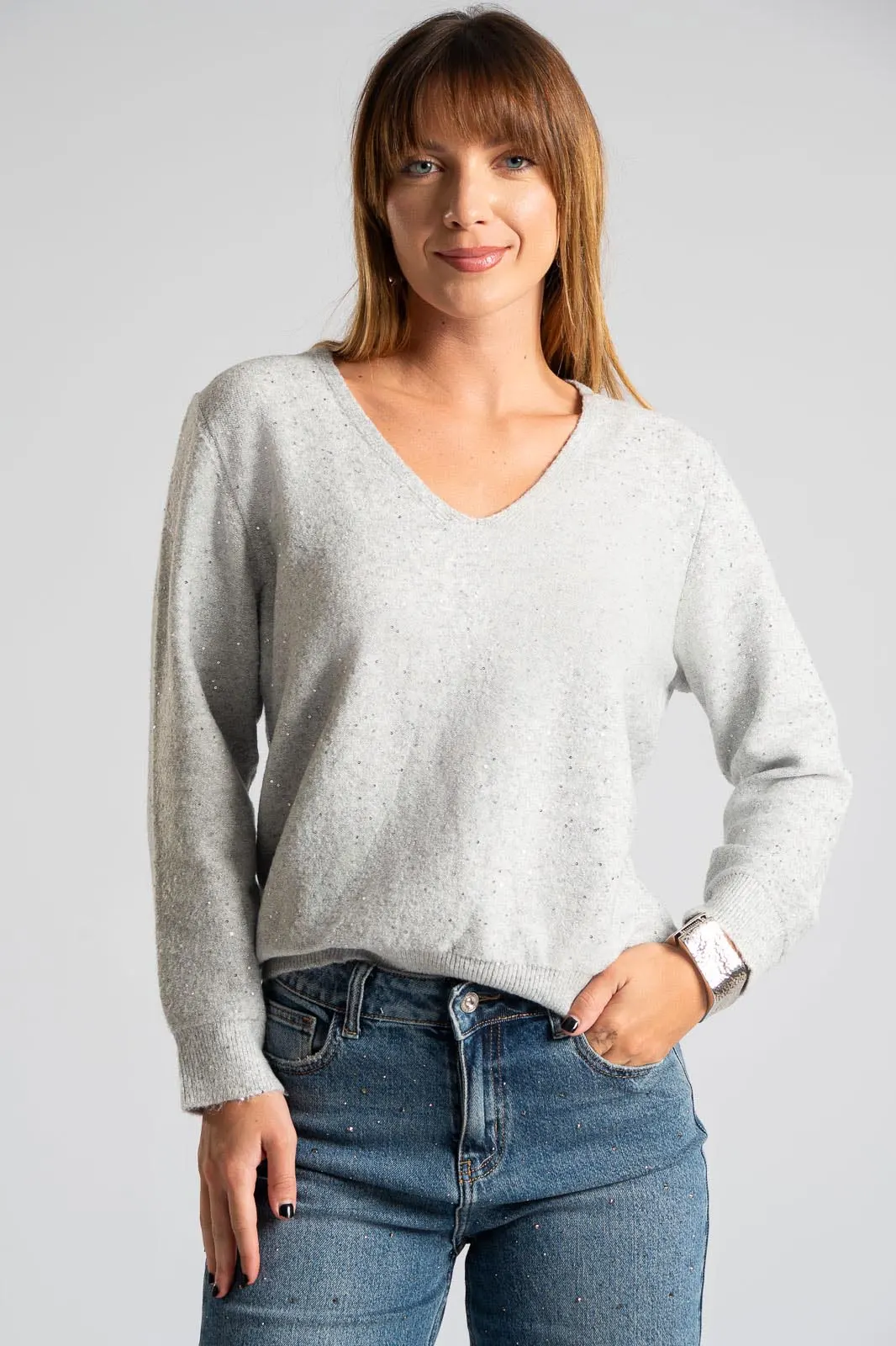 Blouse with V-neckline. It has long sleeves that end in ribbed fabric. It has silver thread and decorative small sequins all over the surface. The measurements in the table are representative of each product. 30% acrylic, 30% viscose, 20% modal, 20% elastane.