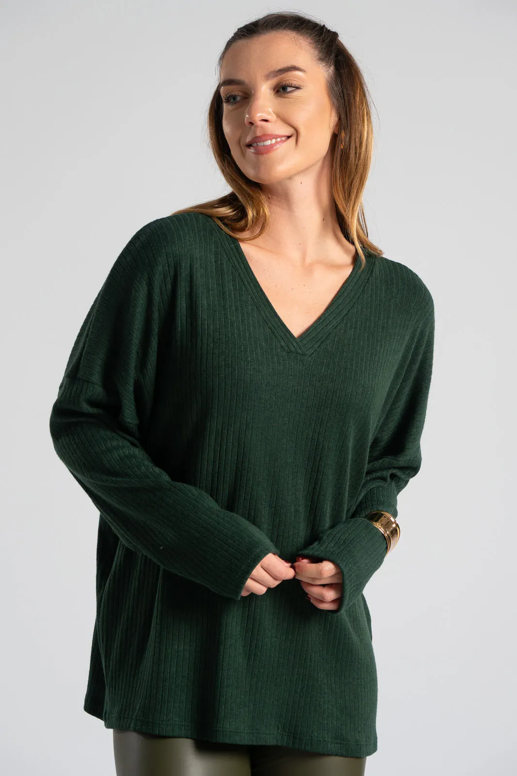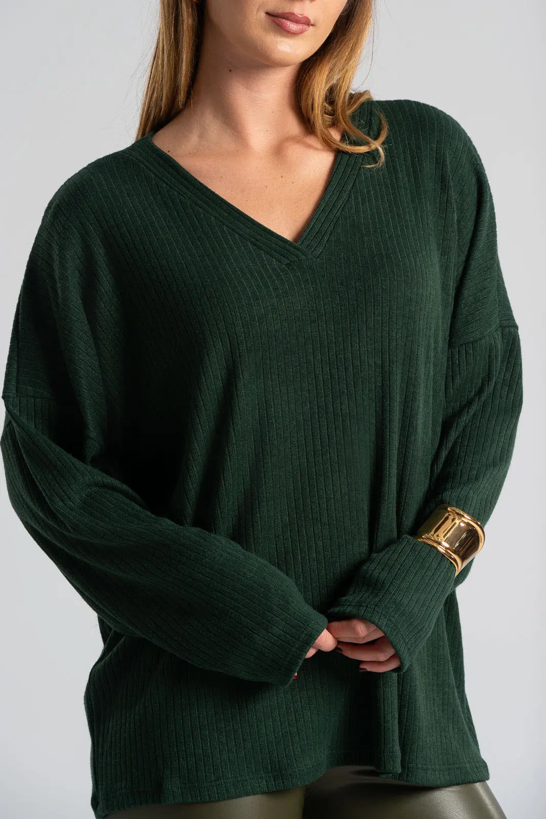 Rib knit blouse. It has a V-neck. The sleeves are slightly batwing style. It has a comfortable fit. The measurements in the table are representative for each code. 65% wool, 30% polyester, 5% elastane.