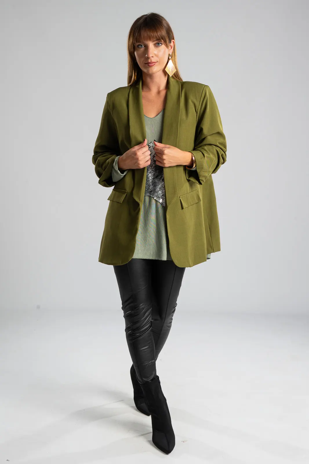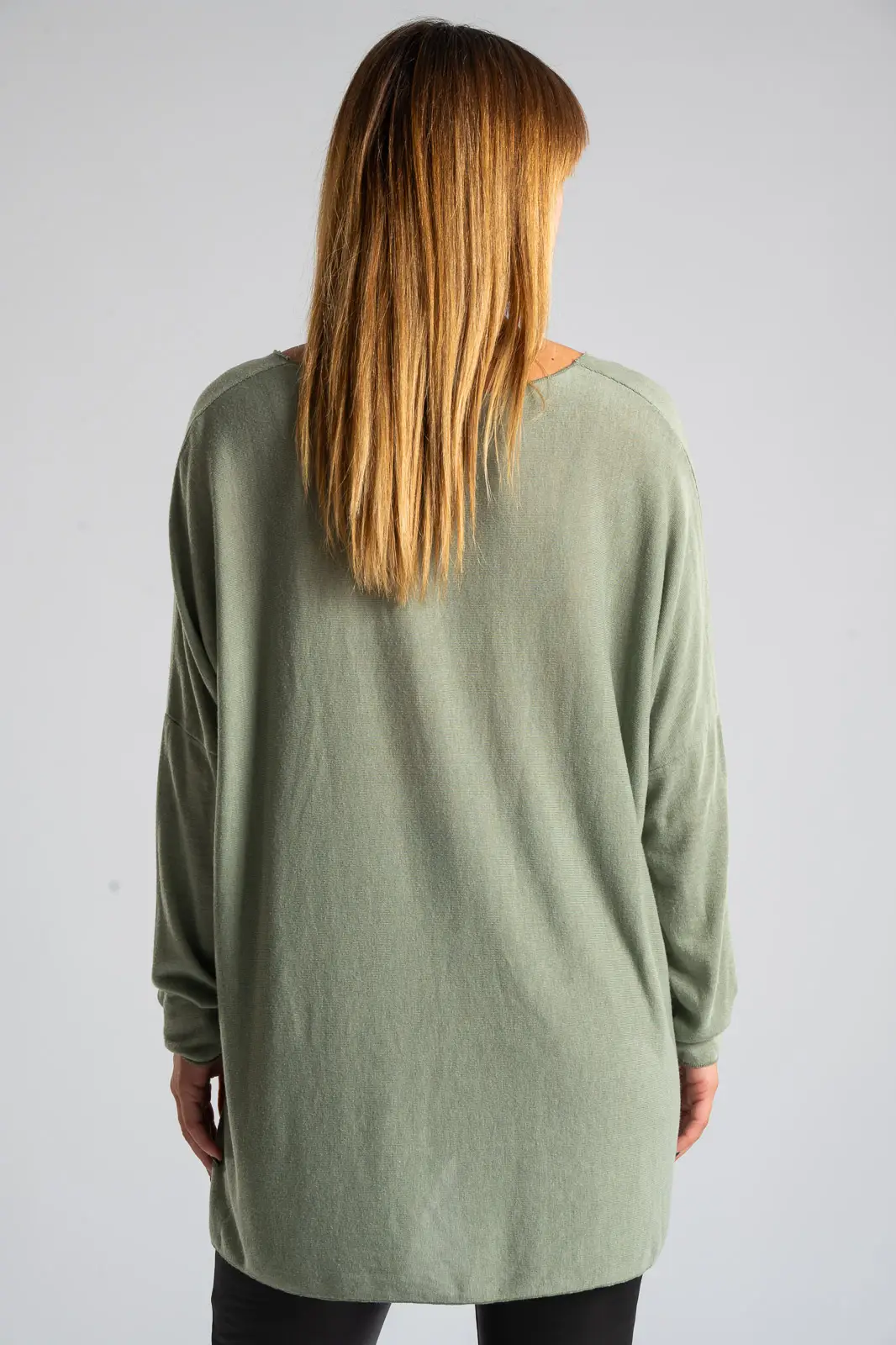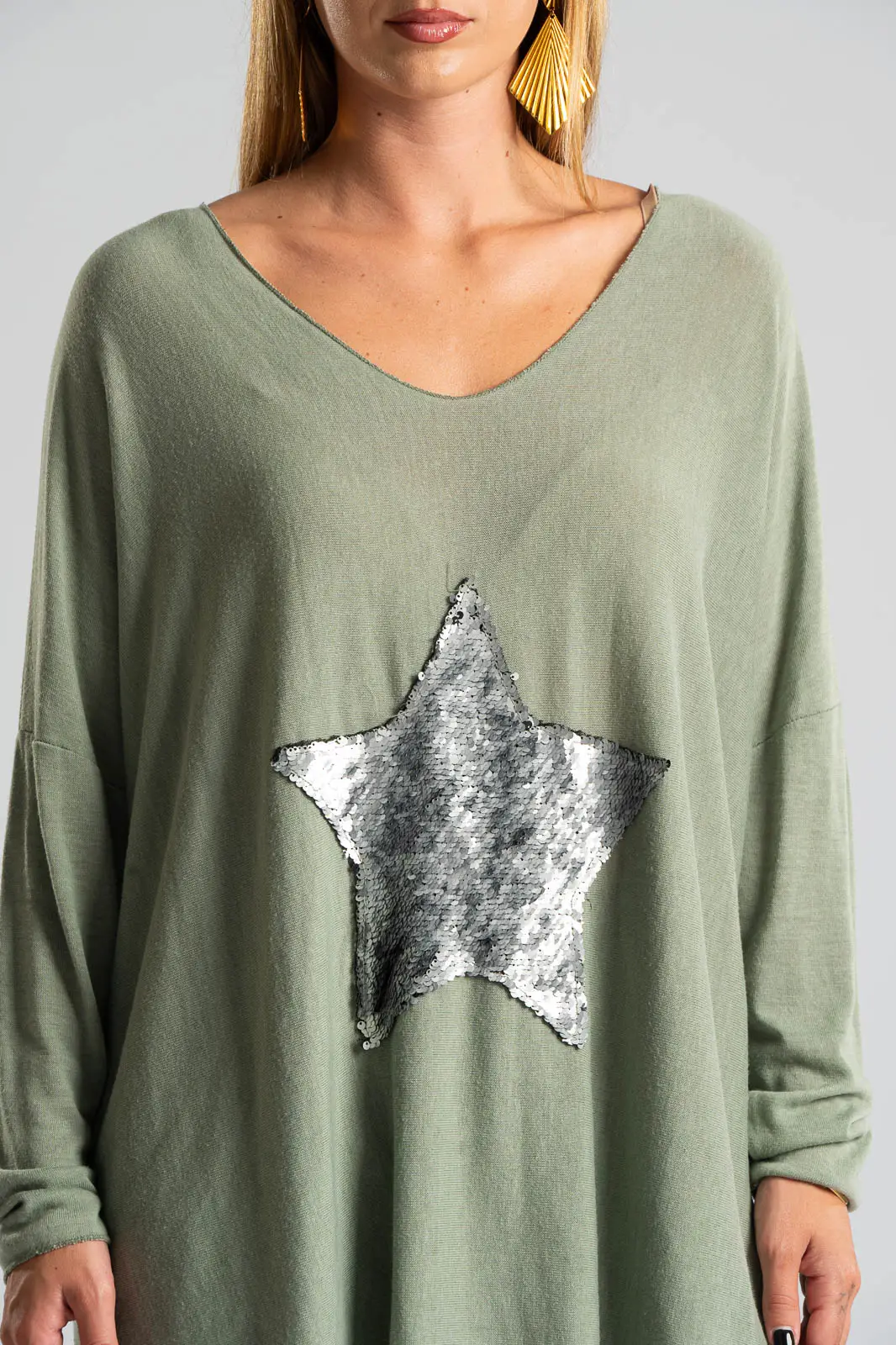 Blouse with a V-neck. It has long sleeves and a straight cut. It is decorated with star-shaped sequins. The fabric is very soft. The measurements in the table are representative for each code. 50% viscose, 50% polyester.