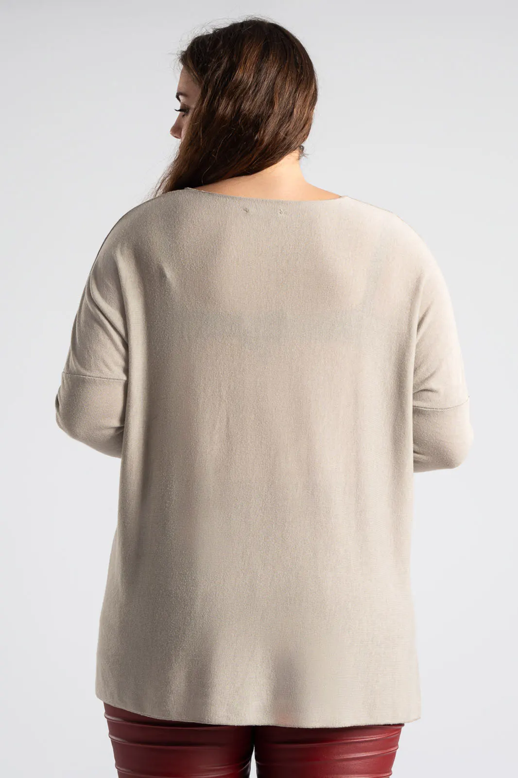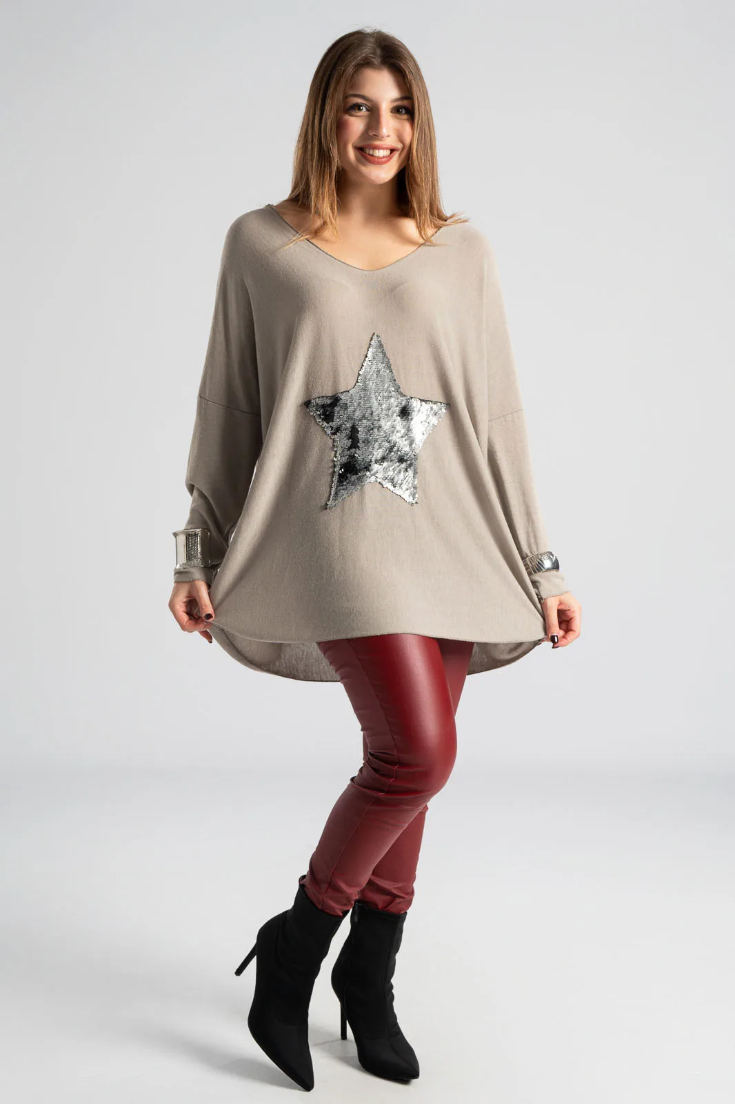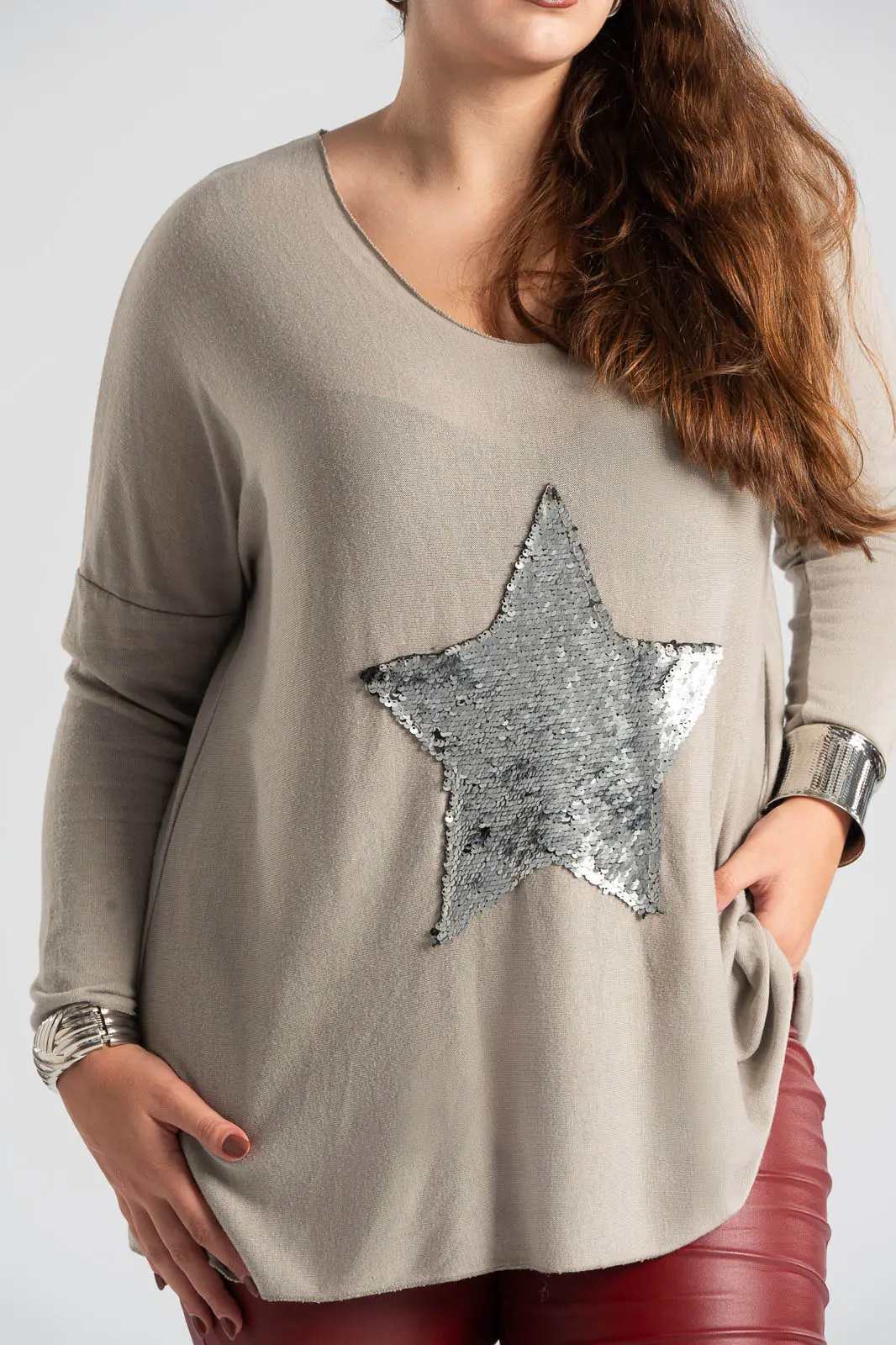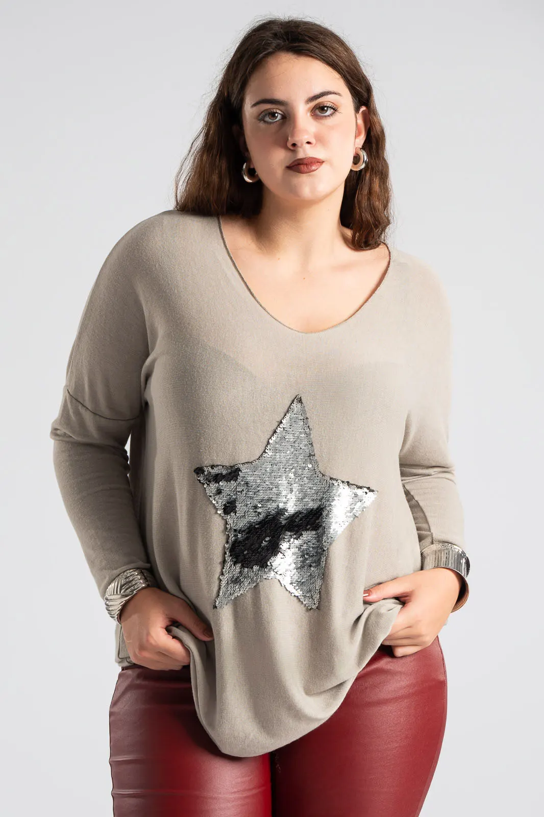 Μπλούζα με V λαιμόκοψη. Διαθέτει μακριά μανίκια και είναι σε ίσια γραμμή. Είναι διακοσμημένη με πούλιες σε σχήμα αστέρι. Το ύφασμα της είναι πολύ μαλακό. Οι μετρήσεις του πίνακα είναι αντιπροσωπευτικές για κάθε κωδικό. 50% viscose, 50% polyester.
