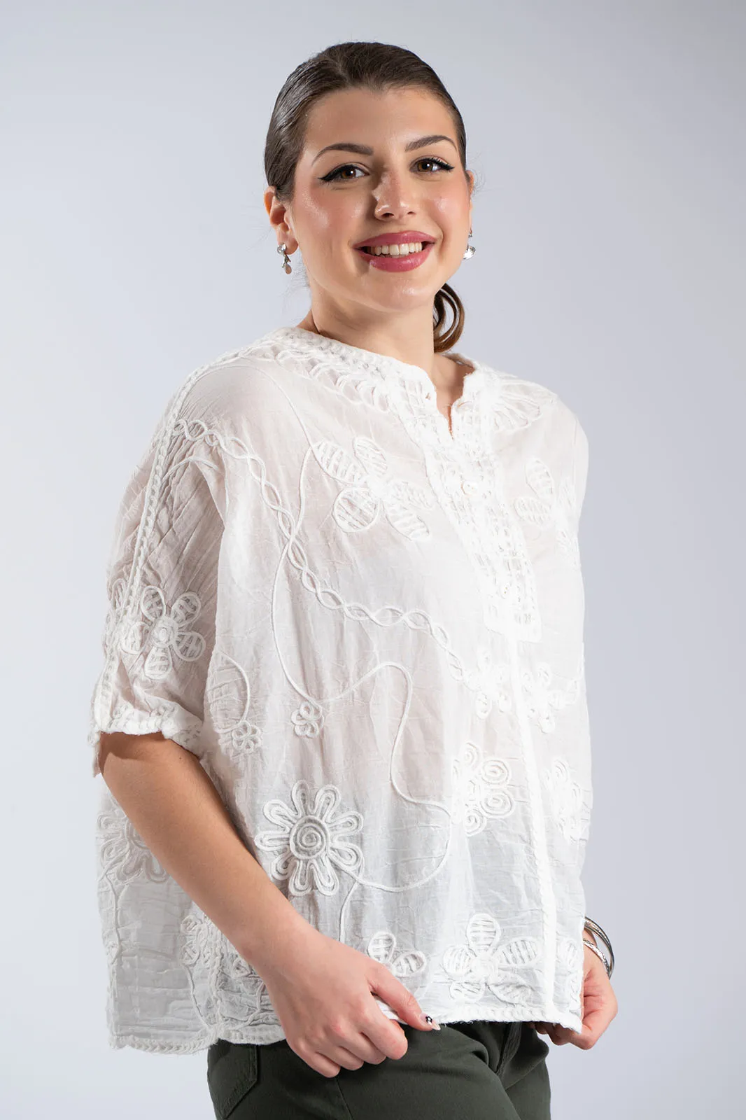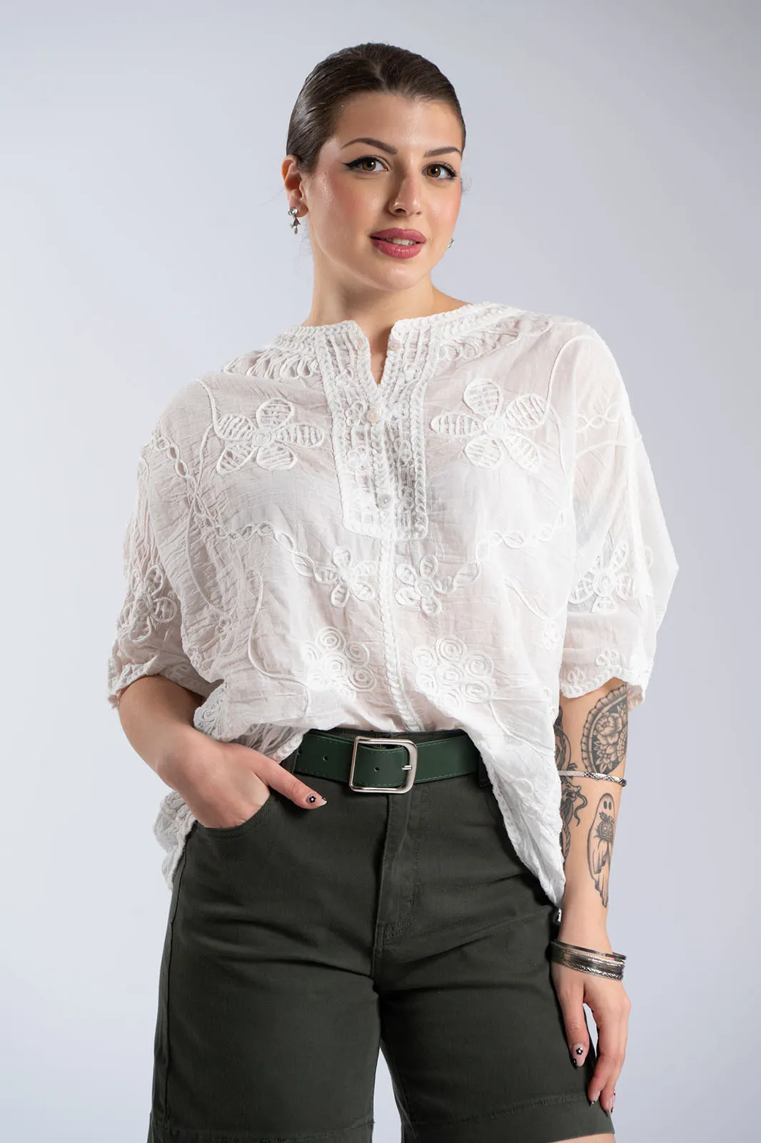 A breezy blouse with a romantic flair and subtle embroidered designs that exude elegance and femininity. The lightweight fabric and loose fit ensure comfort and natural movement, making it the perfect choice for both everyday wear and more polished looks. It features a round neckline with a decorative placket and buttons on the front, while the wide sleeves enhance the sense of freedom and airiness. The subtle embossed embroidery across the entire surface creates an elegant effect that stands out without being over the top.