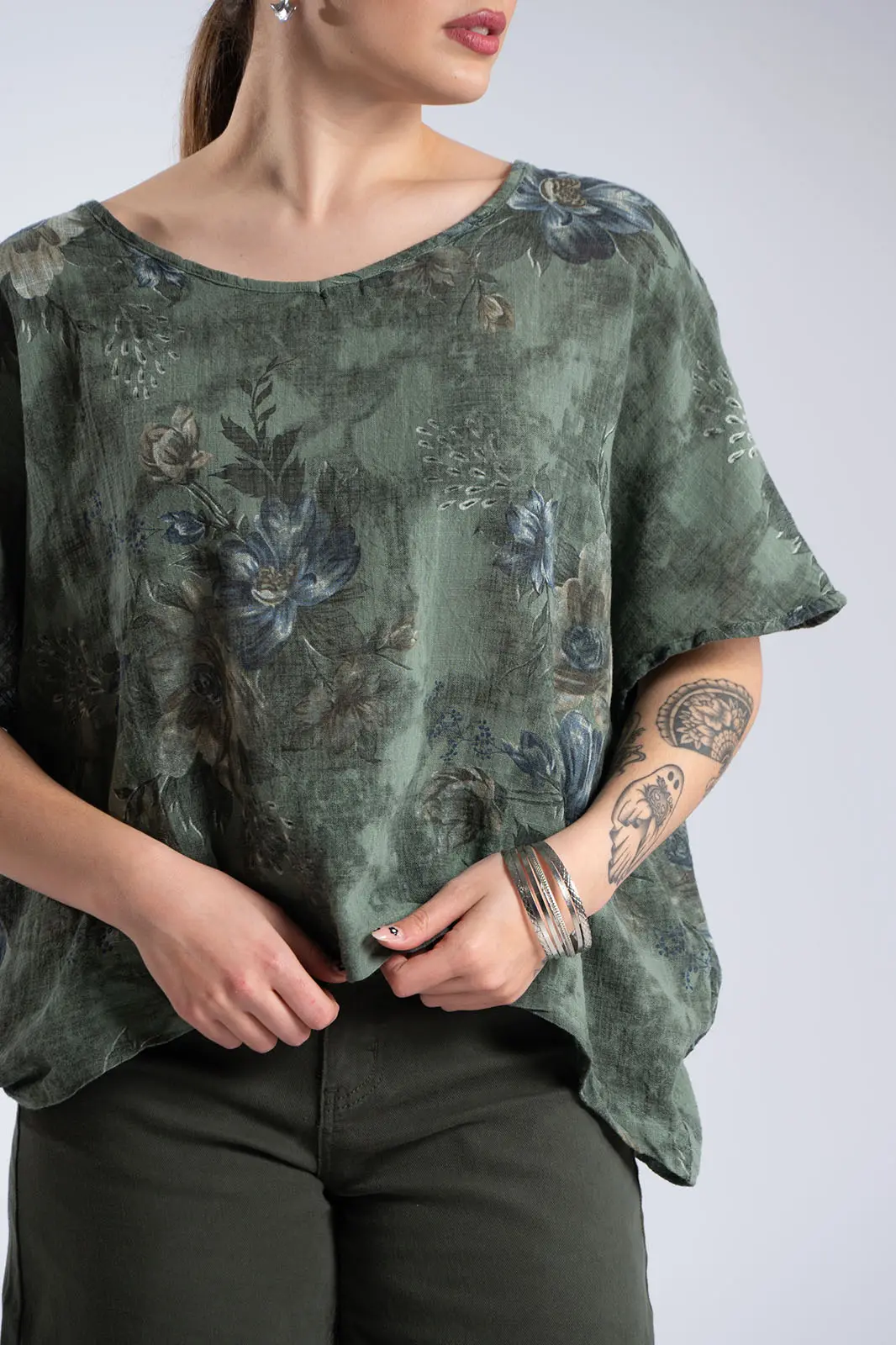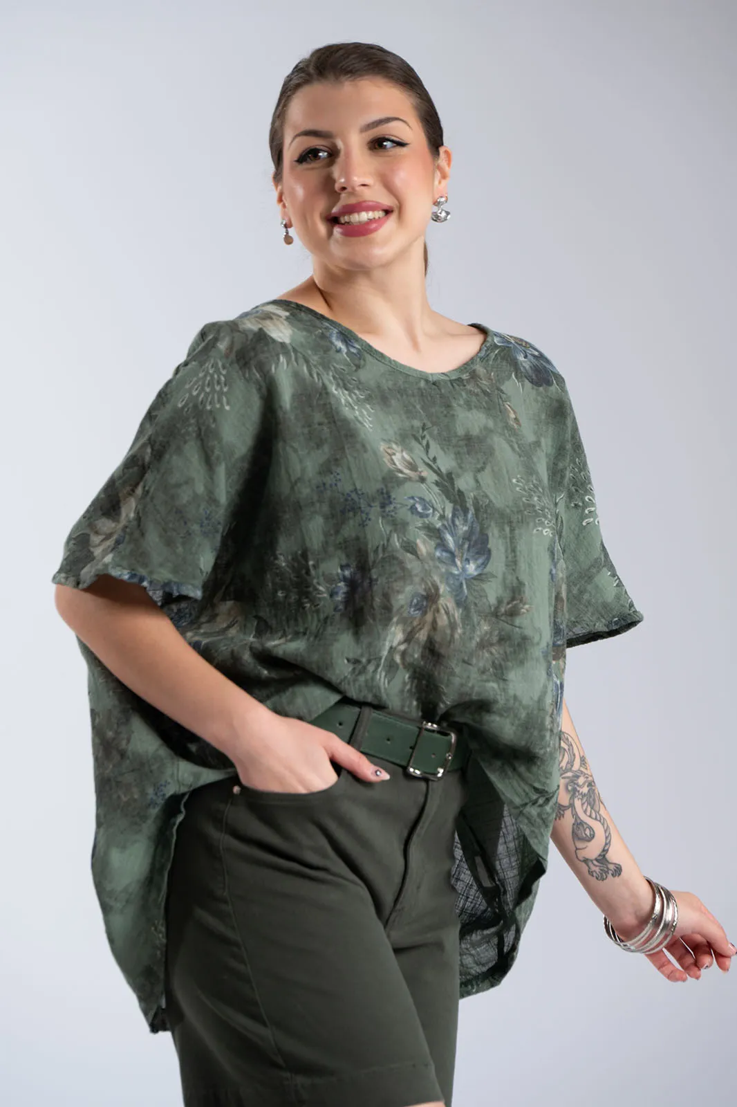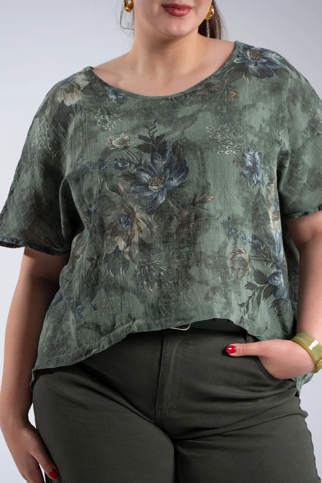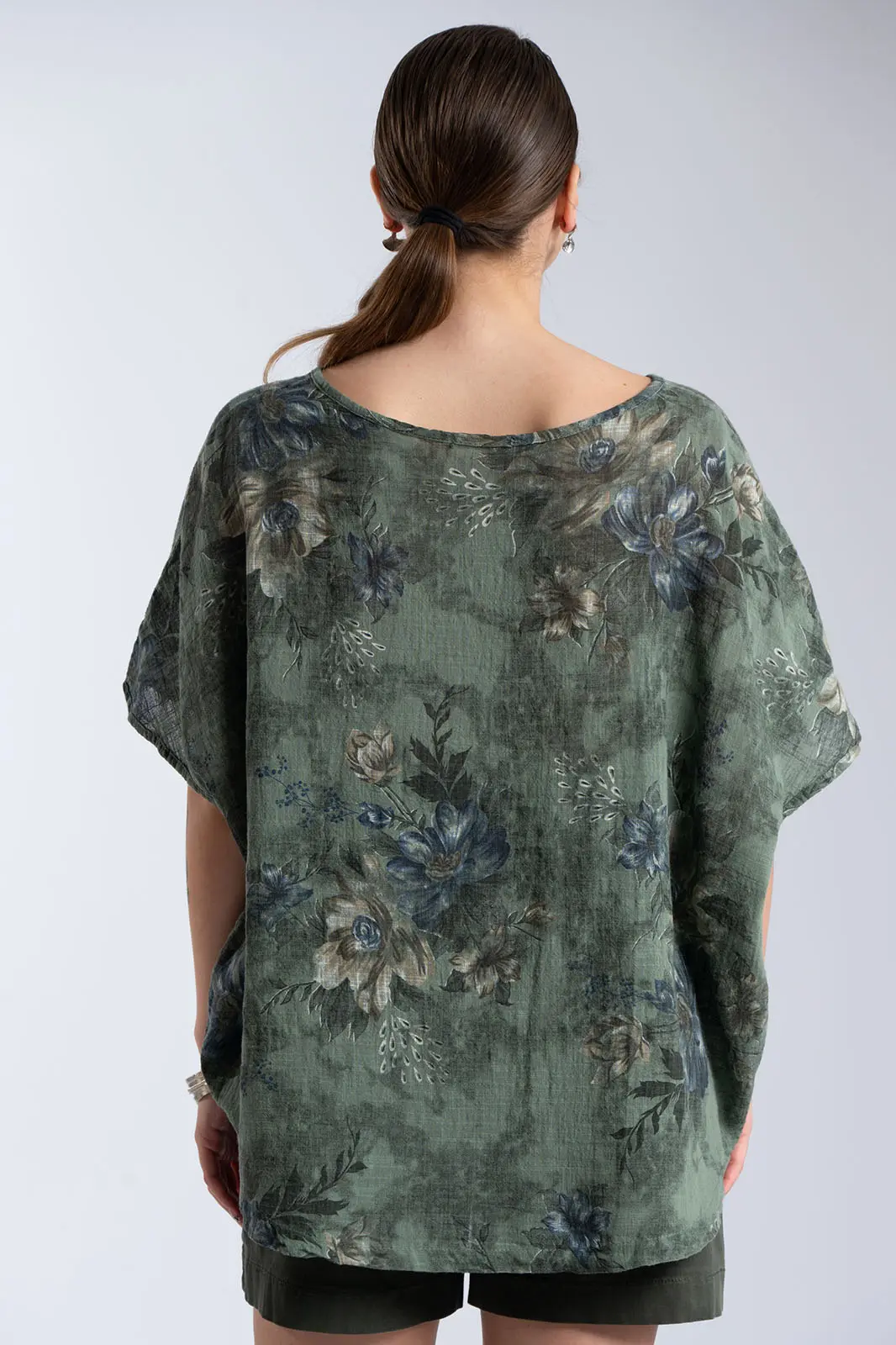 A breezy blouse with a striking floral print that exudes freshness and romance. Its relaxed fit offers comfort and elegant movement, while the round neckline maintains its minimalist and timeless style. The sleeves are short, adding a practical touch. The back is longer. The lightweight fabric makes it ideal for warm days, keeping you cool all day long. A piece that effortlessly combines elegance and a casual aesthetic, perfect for everyday wear as well as more polished looks.