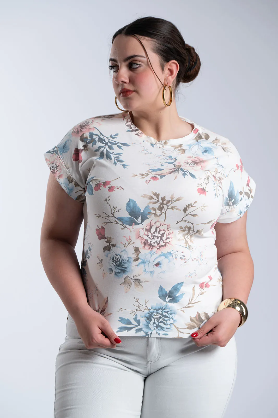 A breezy short-sleeve blouse with a romantic floral pattern that exudes a feminine and timeless style. It features a round neckline and a relaxed fit, offering ease of movement and everyday comfort. The lightweight fabric combined with the subtle floral design makes it an ideal choice for any time of day, from casual outfits to more polished looks.