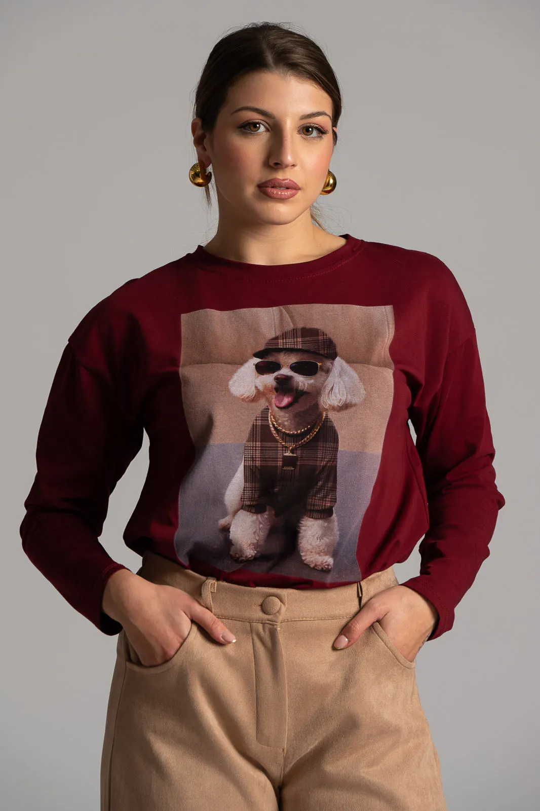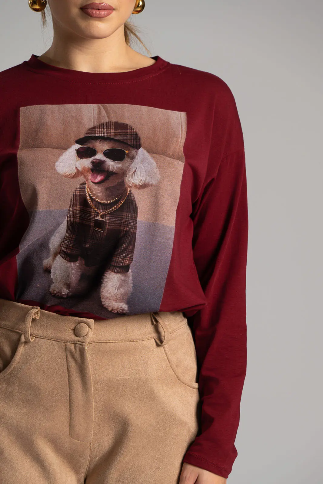 Μπλούζα βαμβακερή με στρογγυλή λαιμόκοψη. Έχει μακριά μανίκια και είναι σε ίσια γραμμή. Στο μπροστινό μέρος διαθέτει τύπωμα. Οι μετρήσεις του πίνακα είναι αντιπροσωπευτικές για κάθε προϊόν. 97% cotton, 3% elastan.