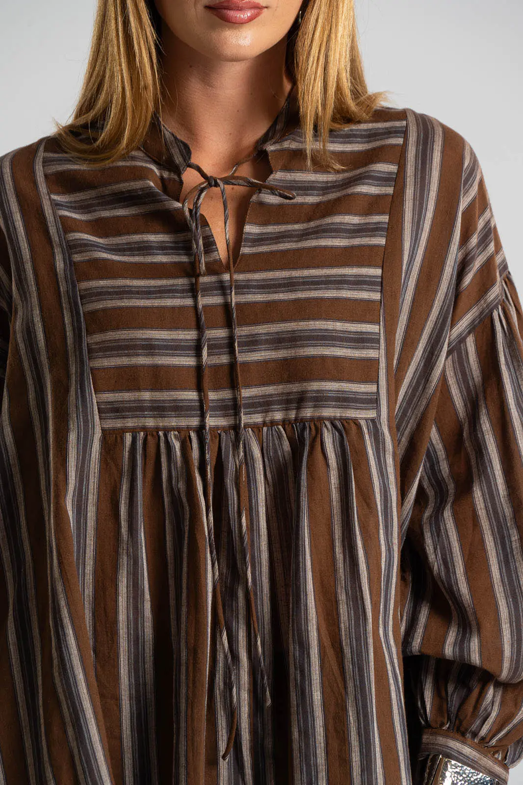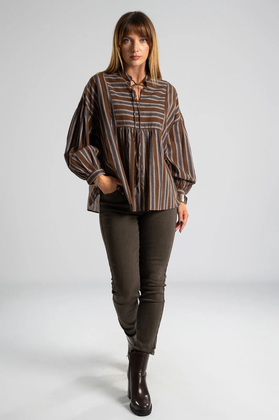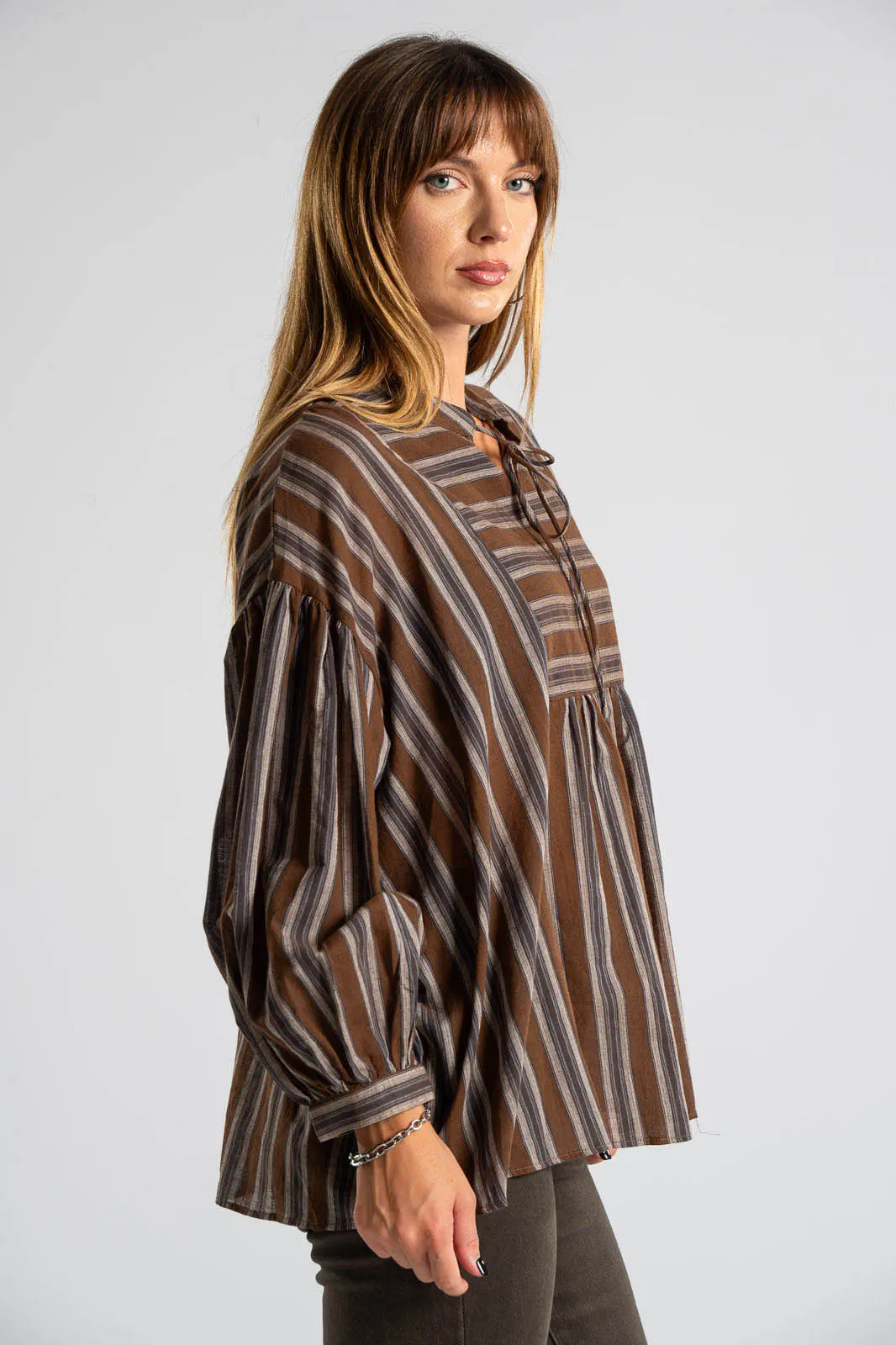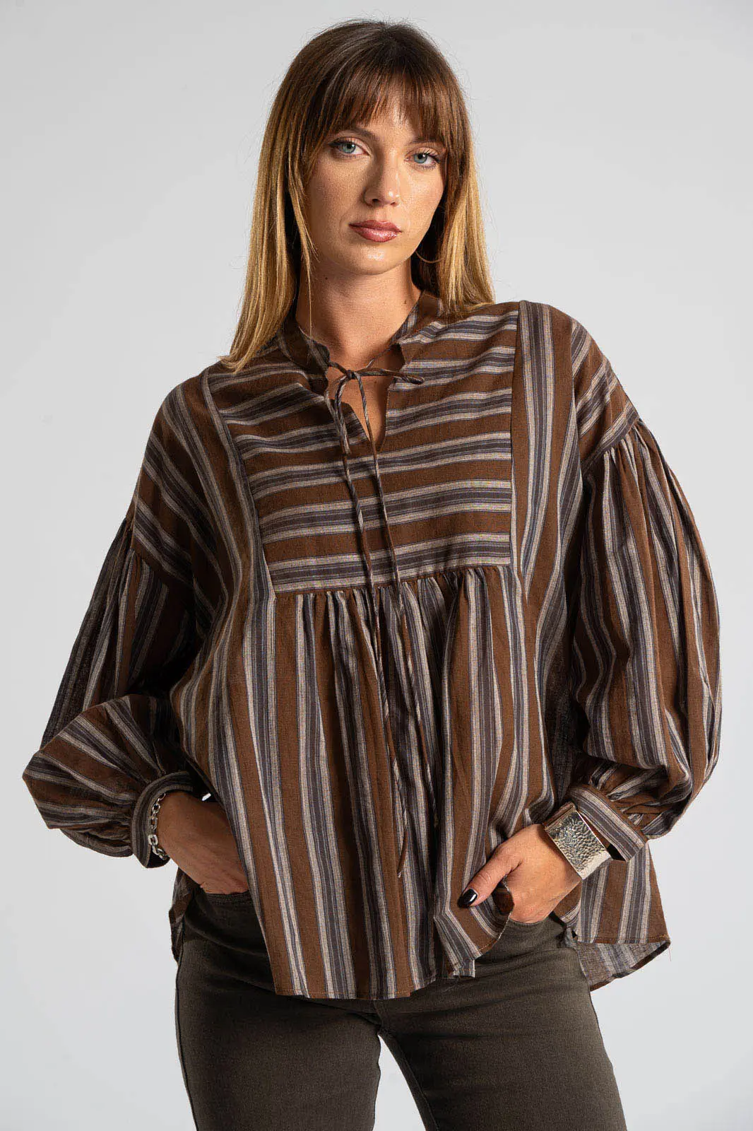 Μπλούζα ριγέ με V λαιμόκοψη και δένει μπροστά. Είναι σε ίσια γραμμή και έχει μακριά μανίκια. Το ύφασμα της είναι πολύ μαλακό. Είναι μια κλασσική επιλογή που δεν πρέπει να λείπει από την ντουλάπα σου. Οι μετρήσεις του πίνακα είναι αντιπροσωπευτικές για κάθε προϊόν. 100% cotton.