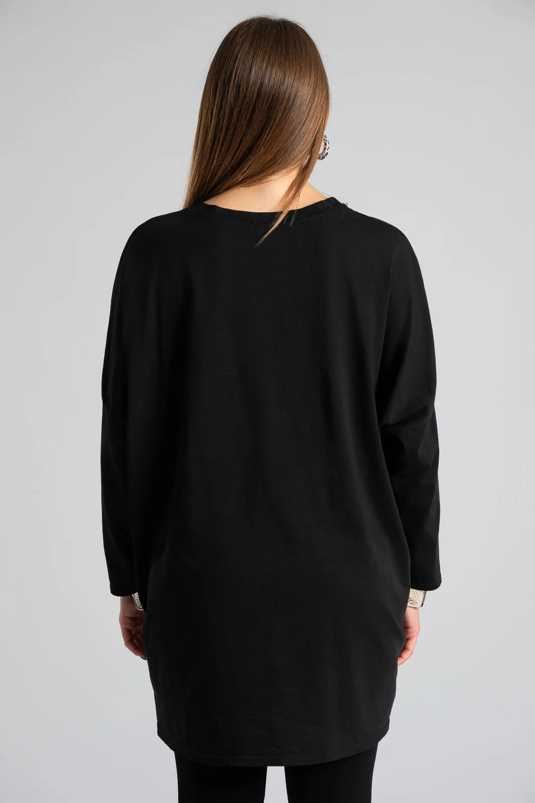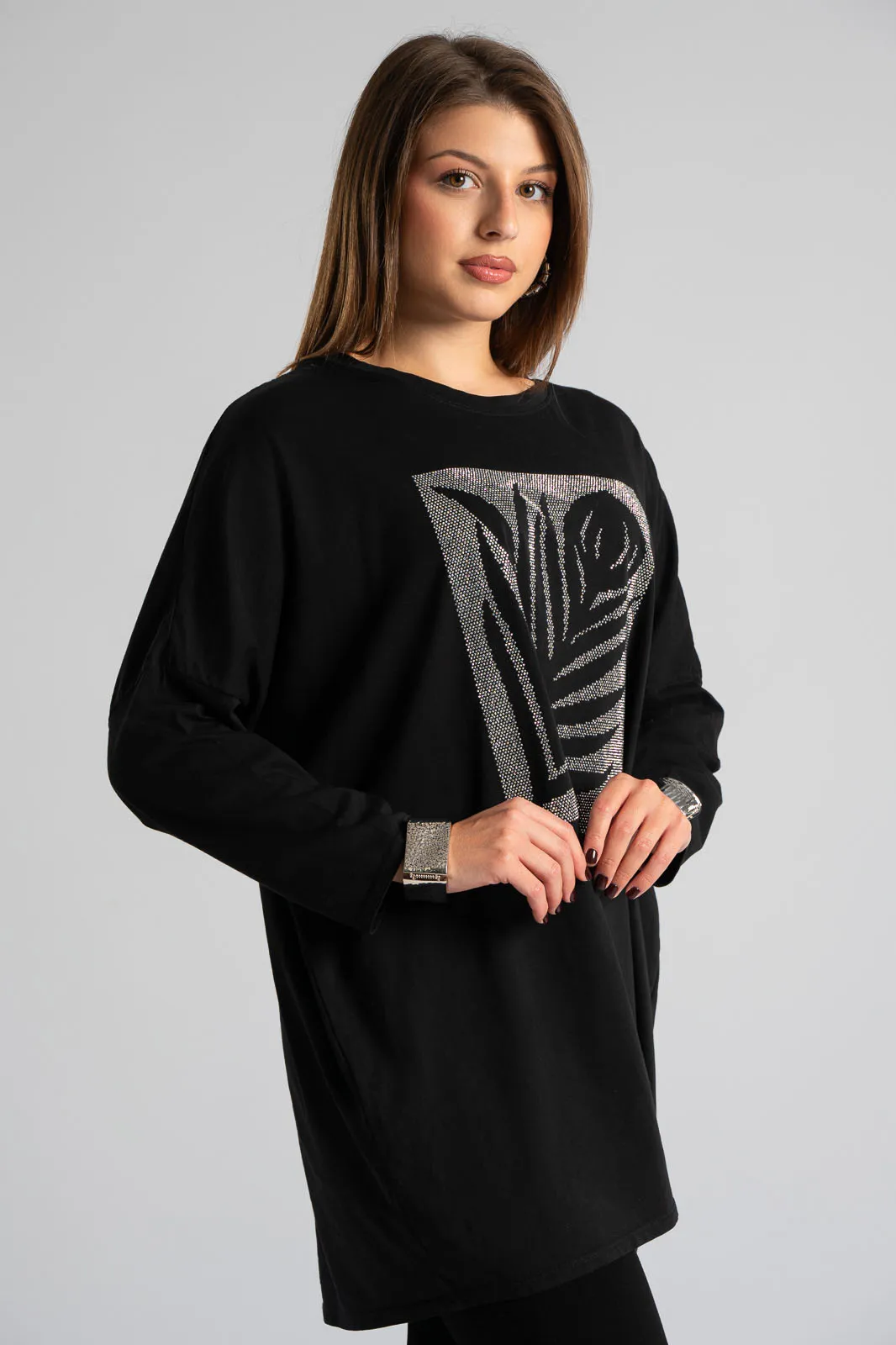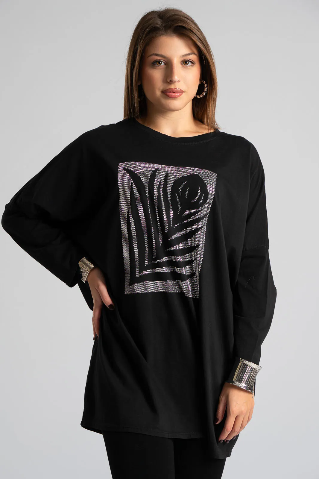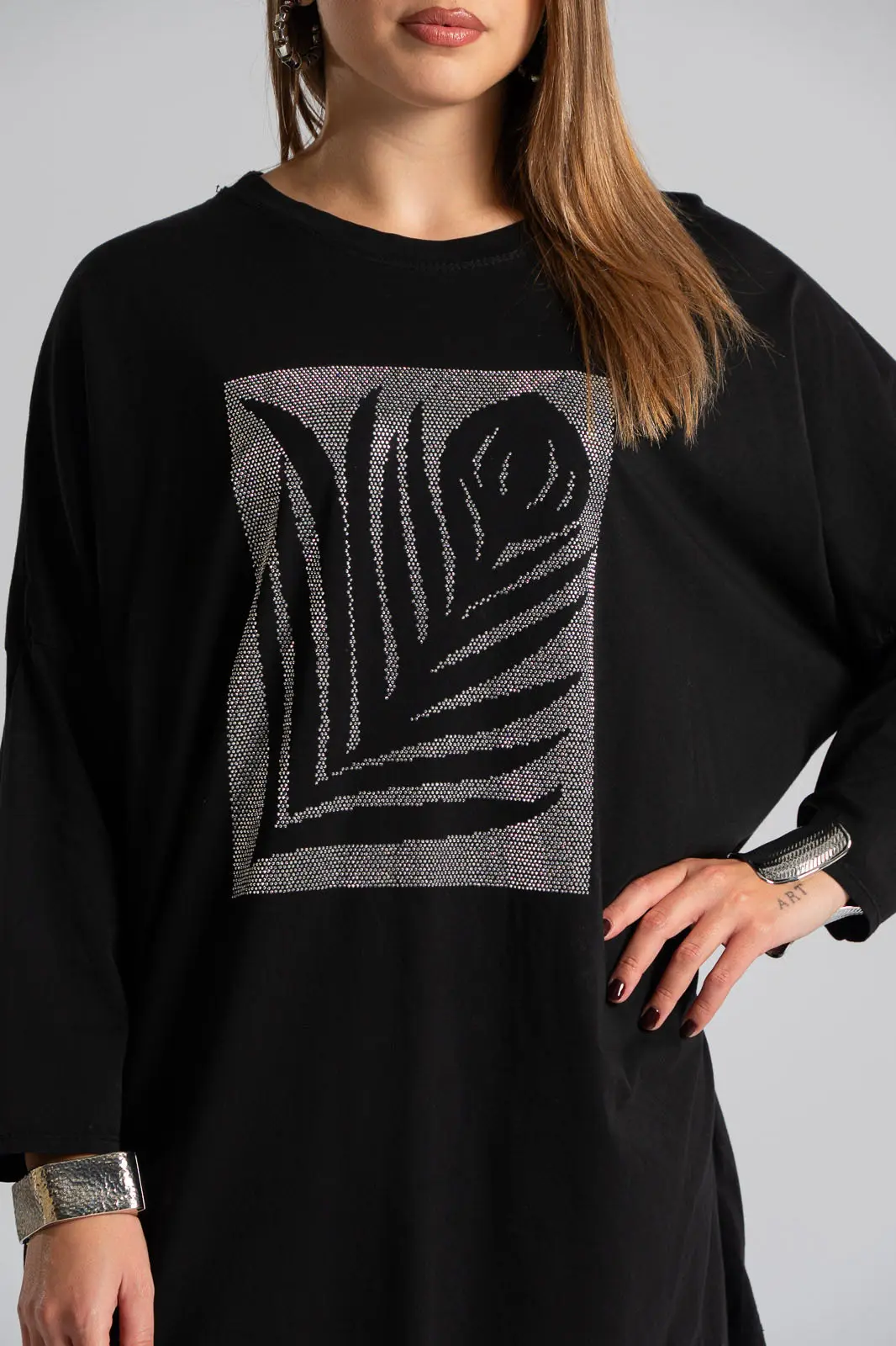 Cotton blouse with round neckline. It has long sleeves. It has a comfortable fit and decorative rhinestone detail on the front. The measurements in the table are representative for each code. 100% cotton.