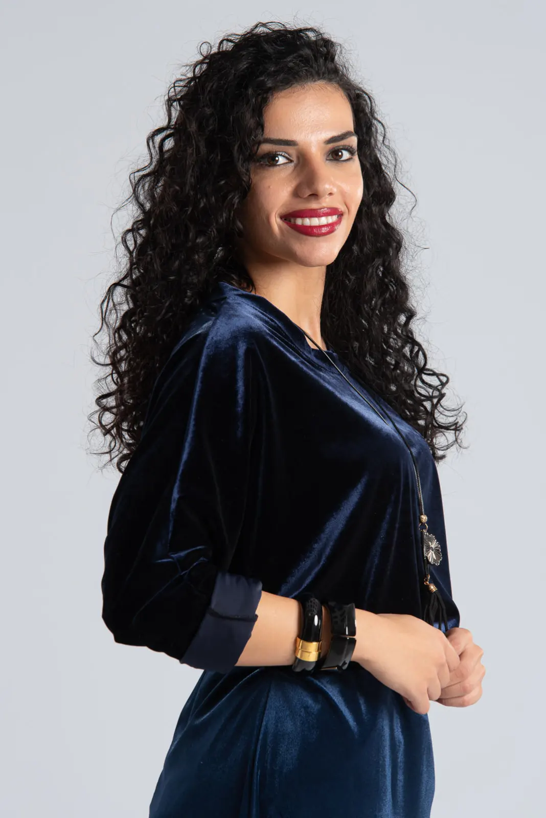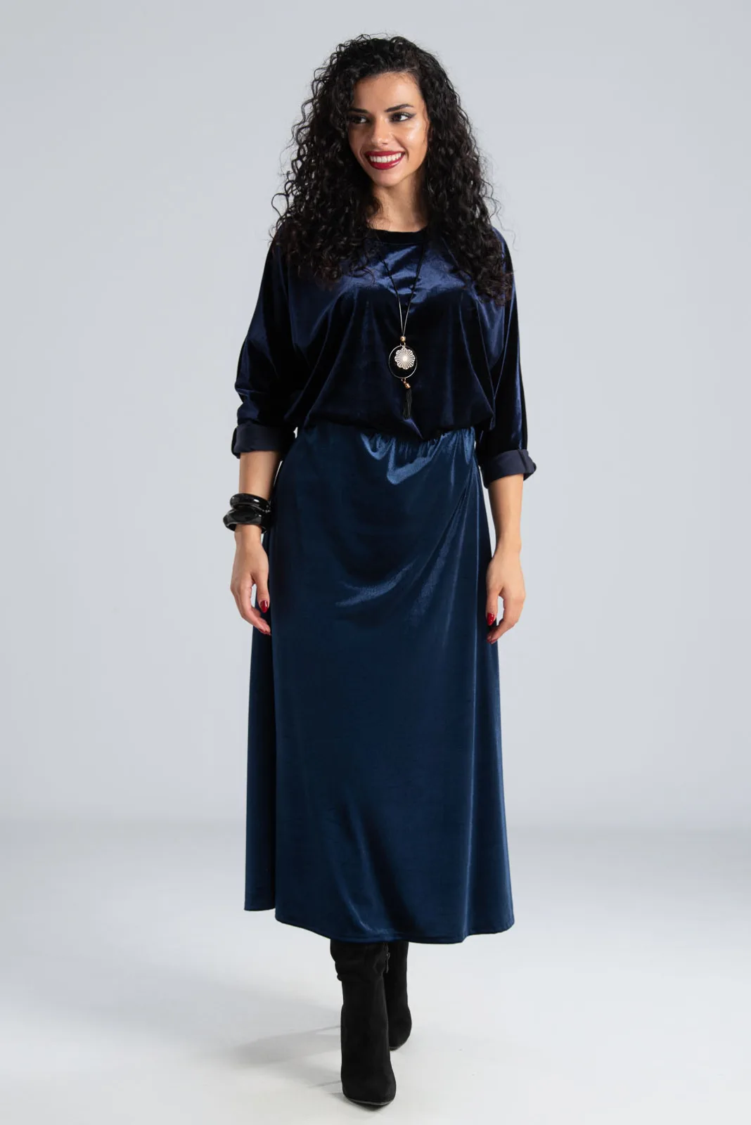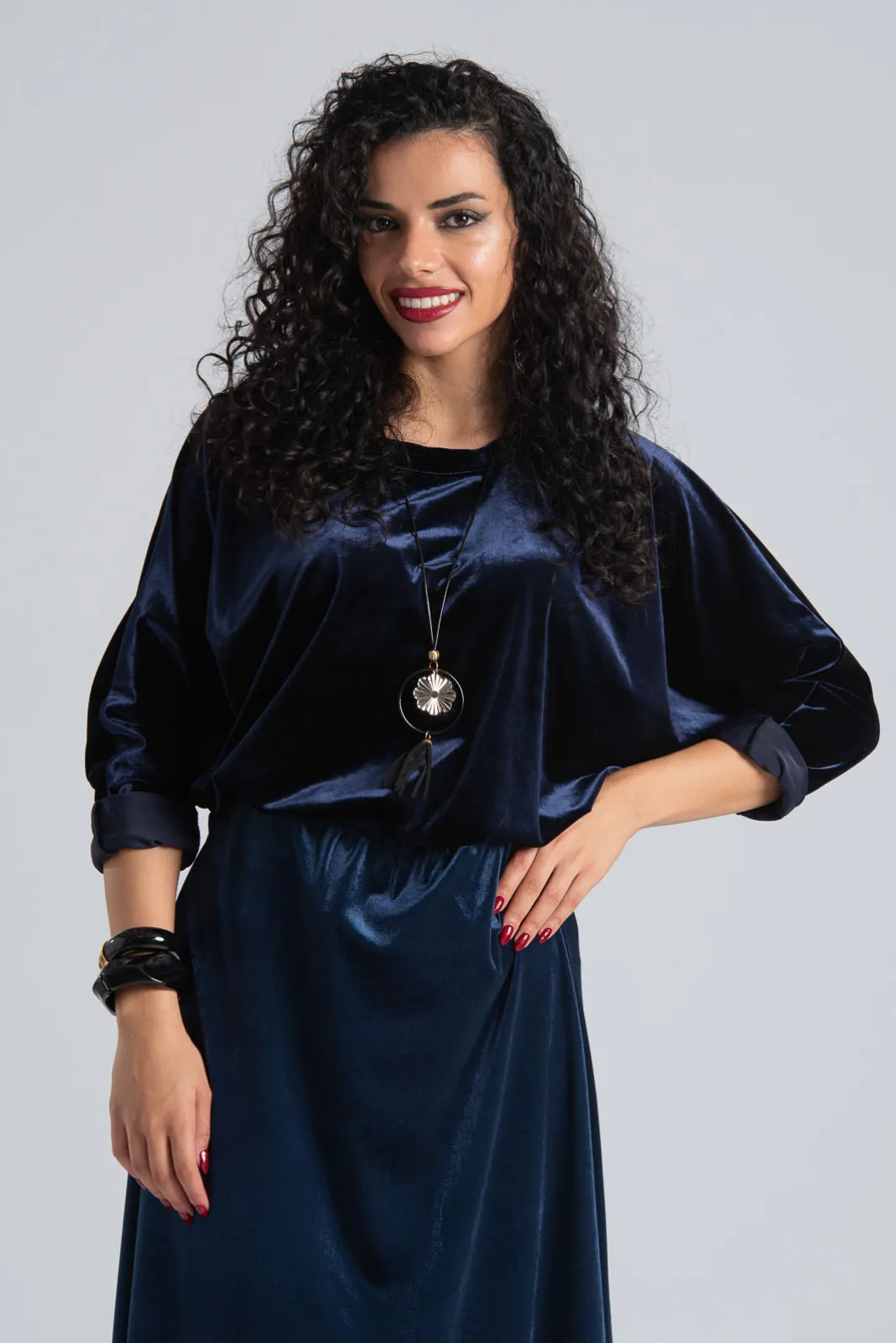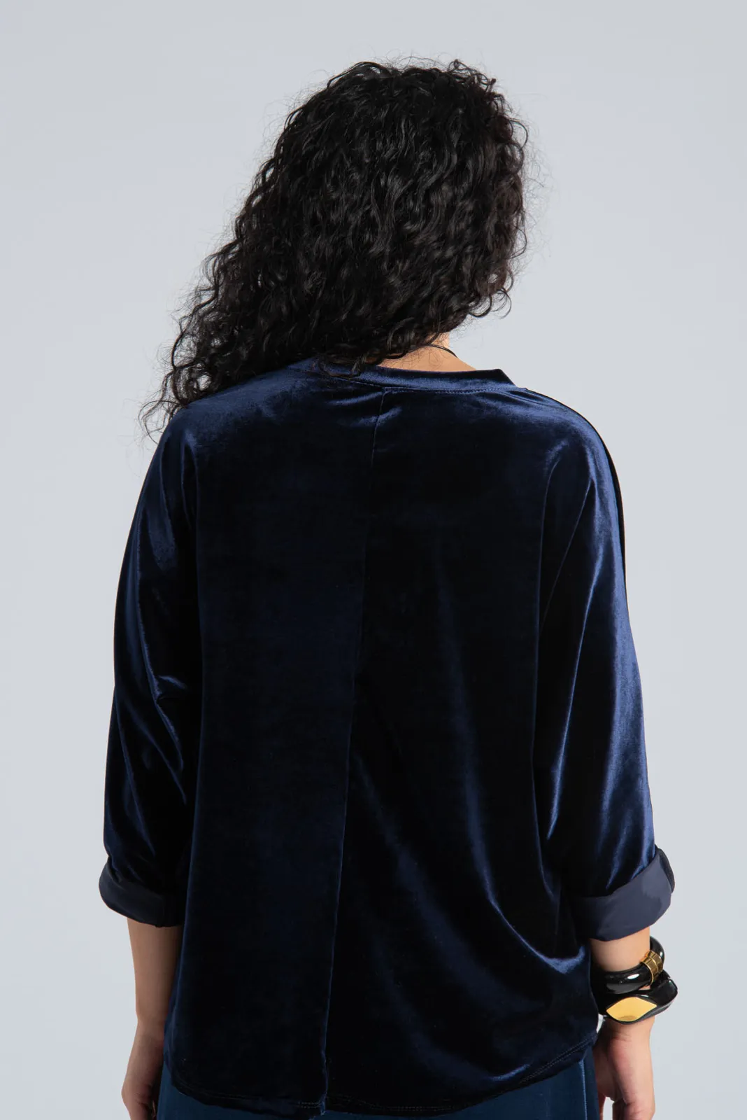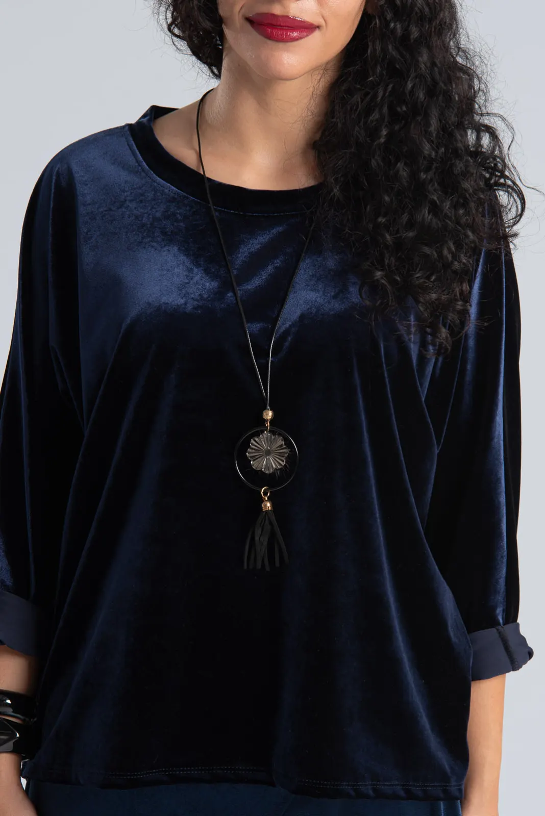 Μπλούζα velvet που διαθέτει στρογγυλή λαιμόκοψη. Έχει μακριά μανίκια σε ύφος νυχτερίδας. Στο πίσω μέρος είναι πιο μακριά. Διαθέτει δικό του κολιέ. Οι μετρήσεις του πίνακα είναι αντιπροσωπευτικές για κάθε κωδικό. 92% polyester, 8% elastan.