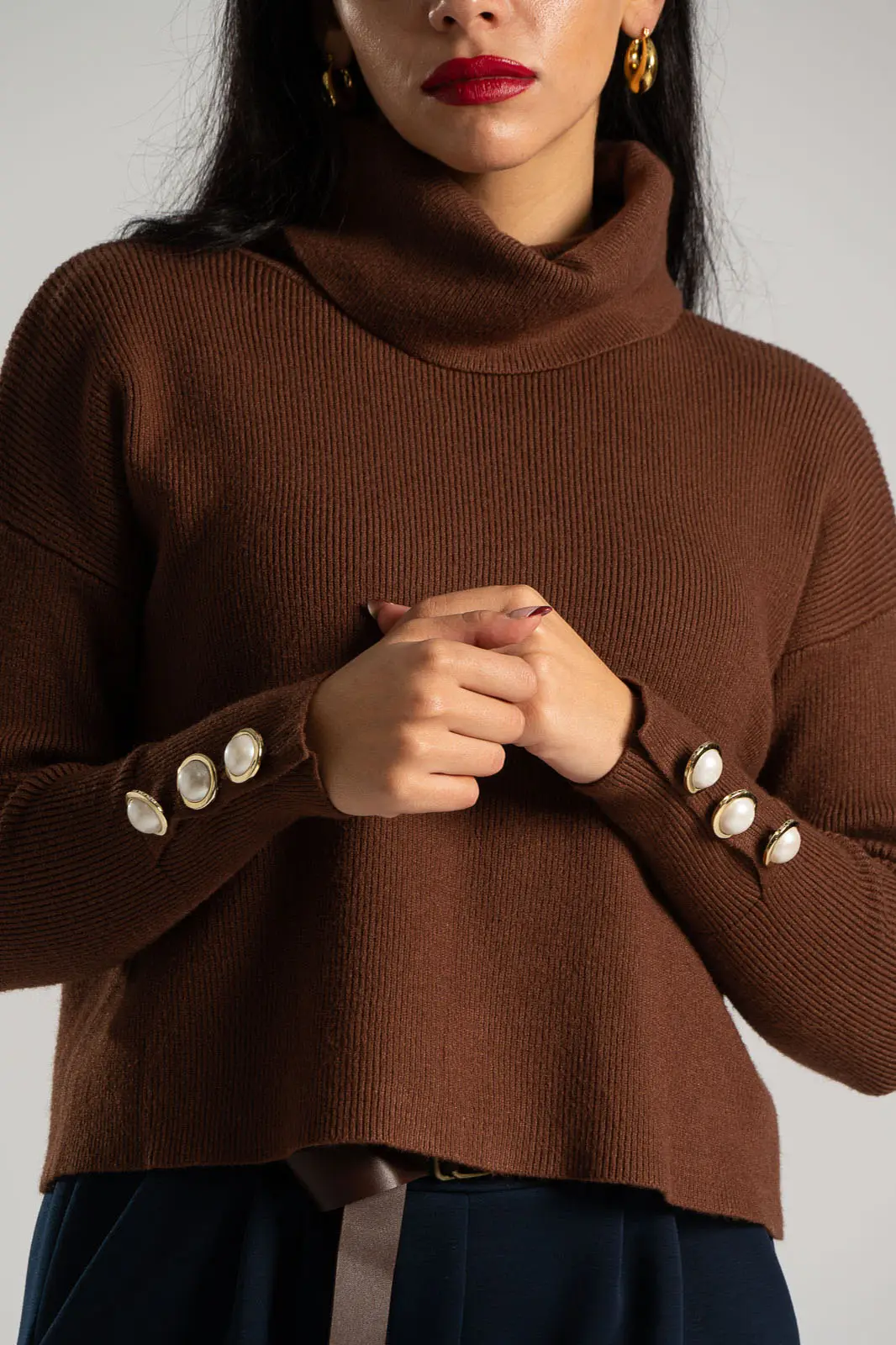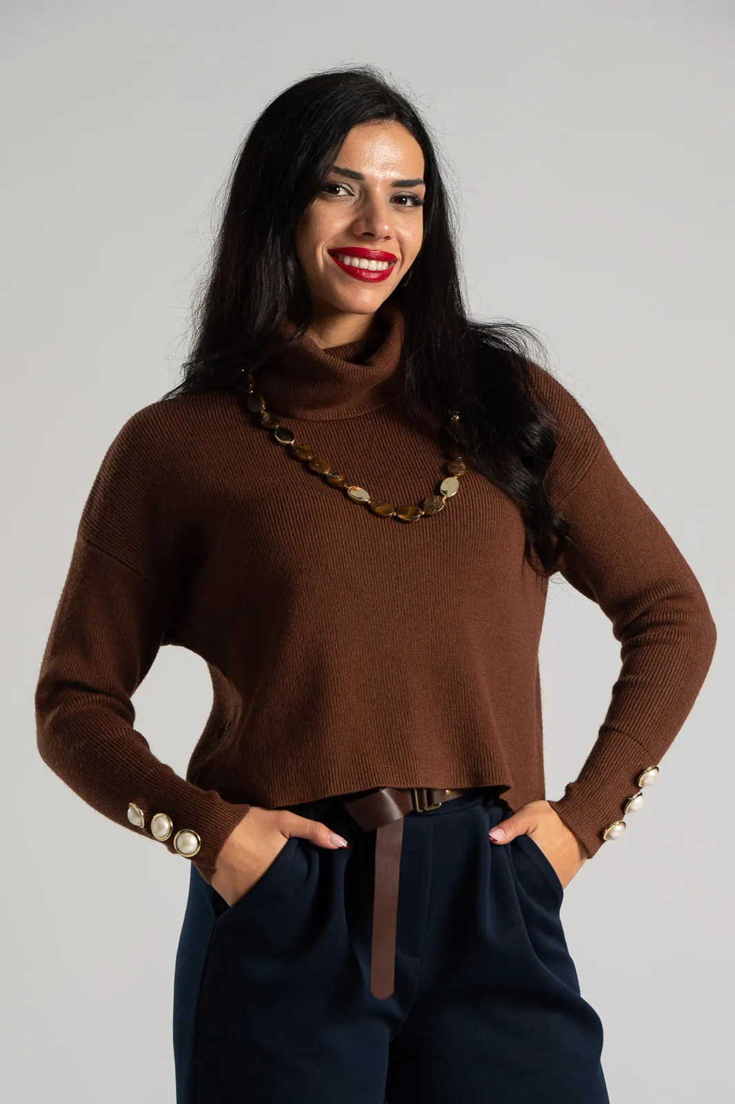 Ribbed knit blouse with a loose turtleneck. It has long sleeves decorated with pearls at the cuffs. It has a straight cut and the fabric is very soft. The measurements in the table are representative of each product. 65% viscose, 35% nylon.